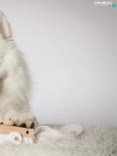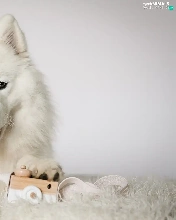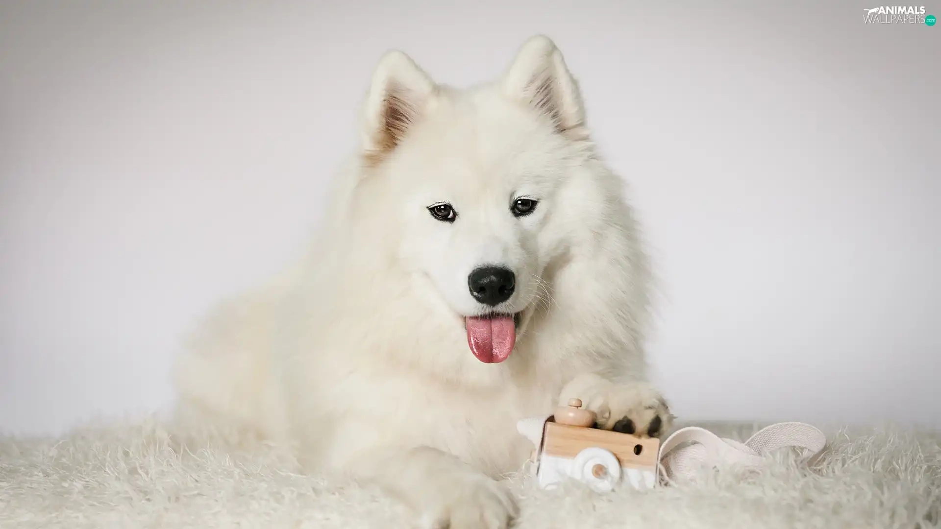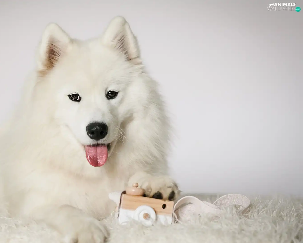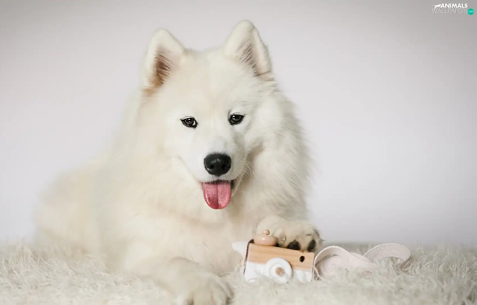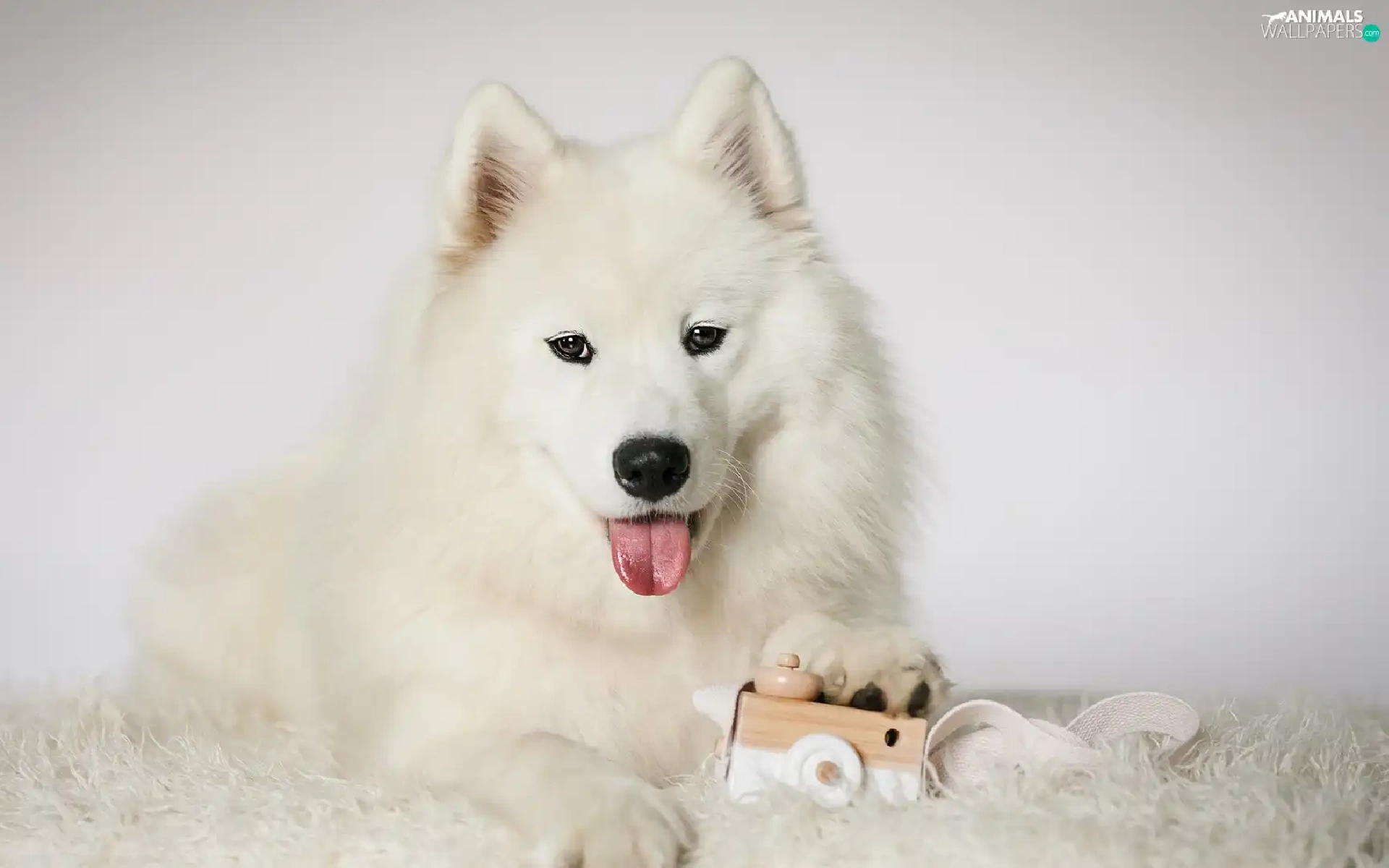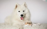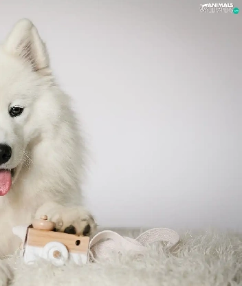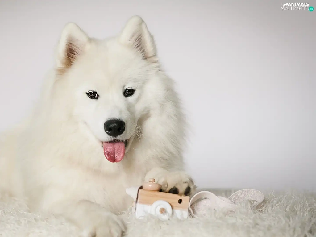 Samojed, White, muzzle, toy, Tounge, dog