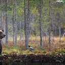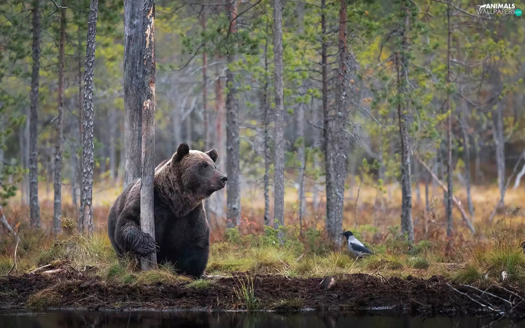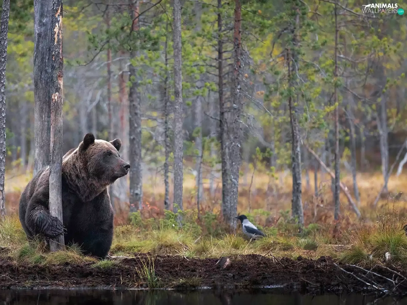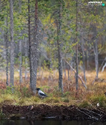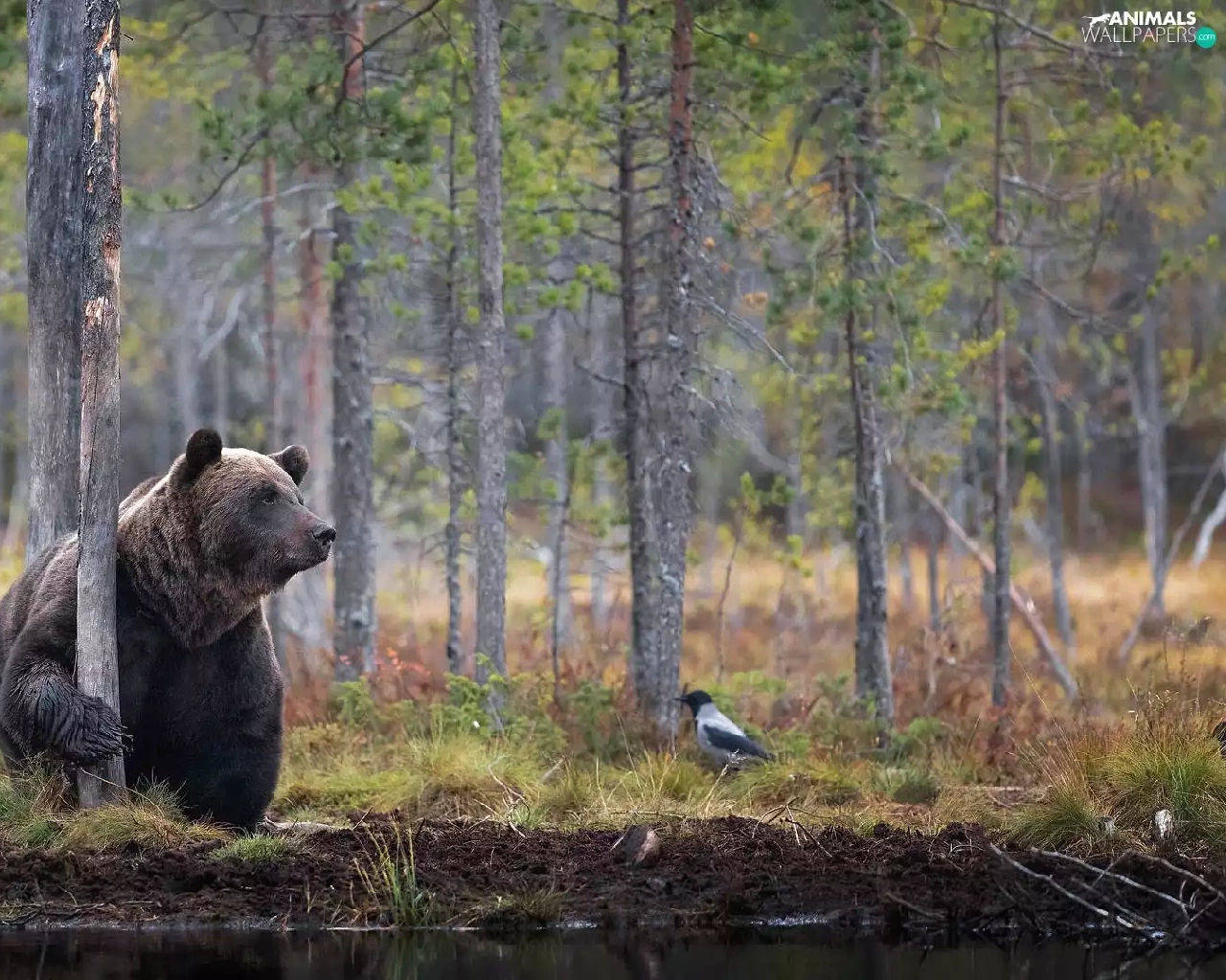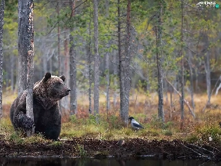 viewes, Bird, forest, trees, Brown bear
