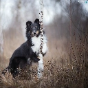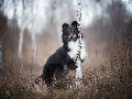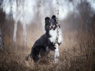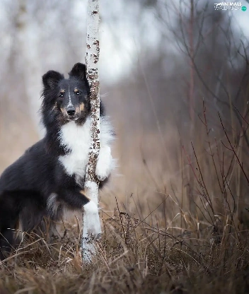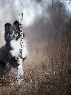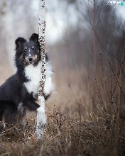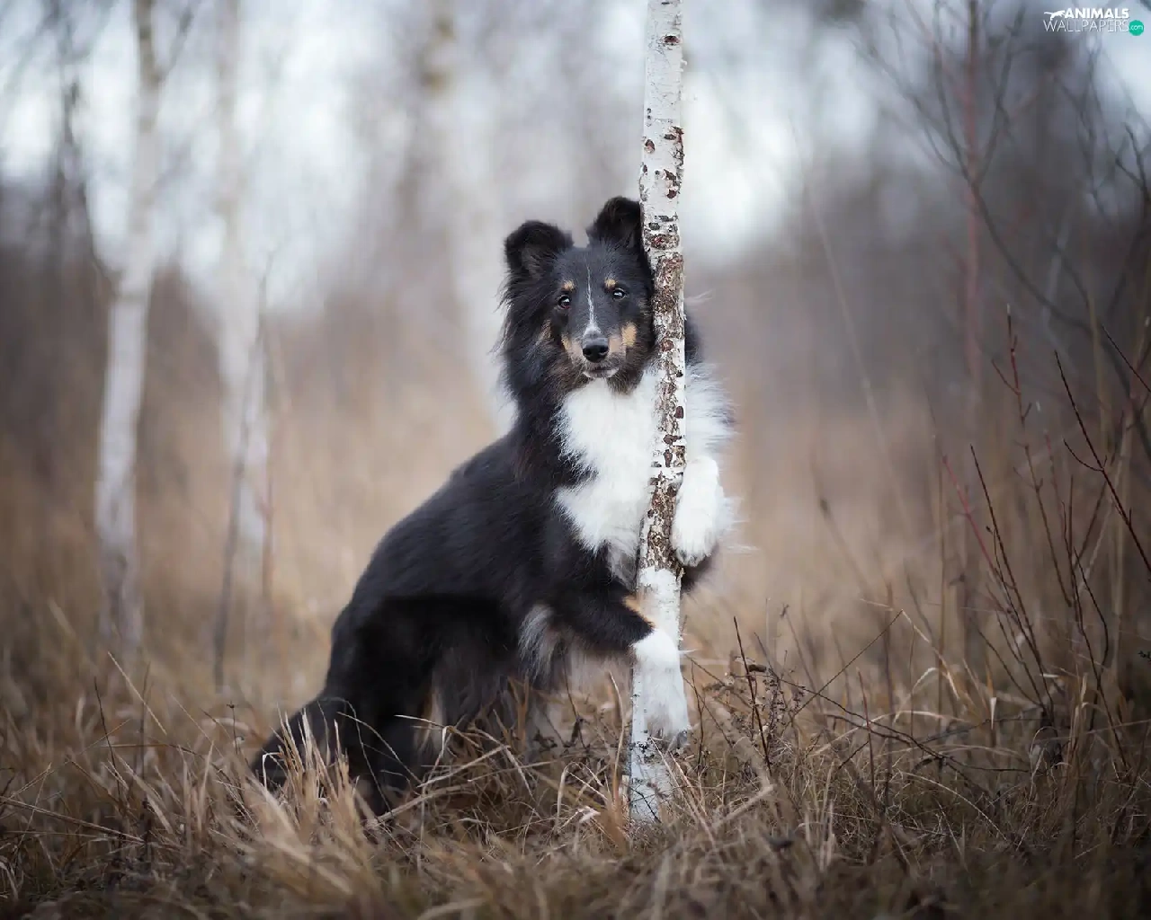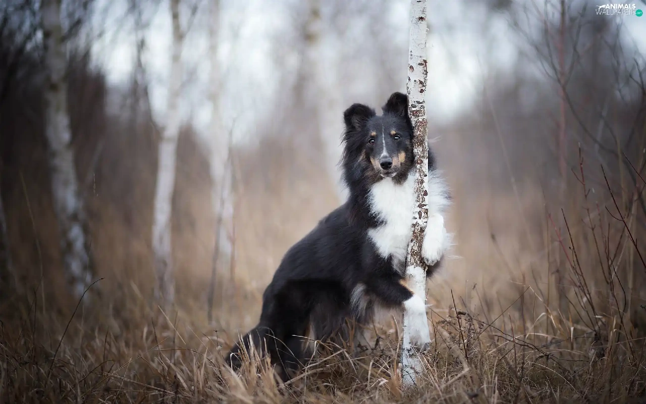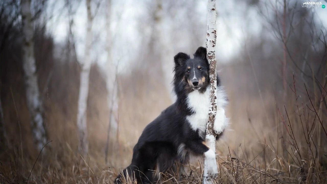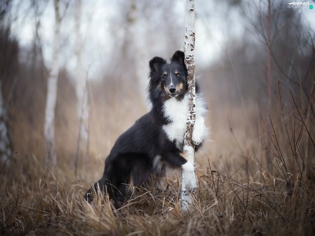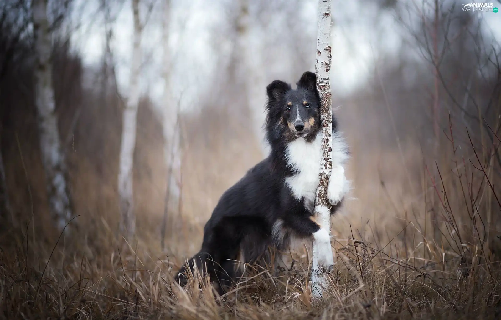 trees, dog, birch, grass, viewes, shetland Sheepdog