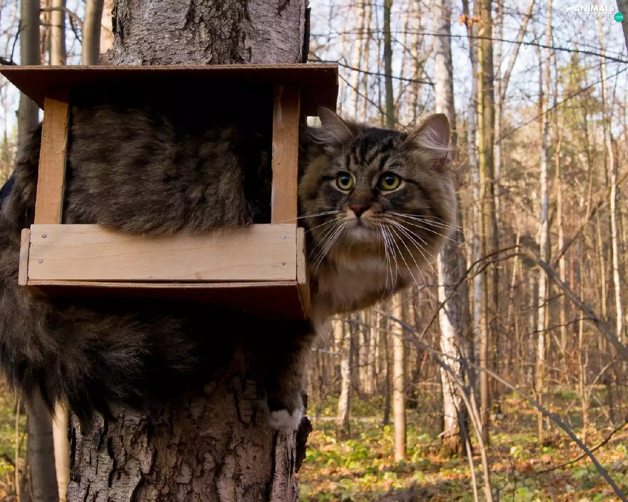 cat, viewes, Bird, trees