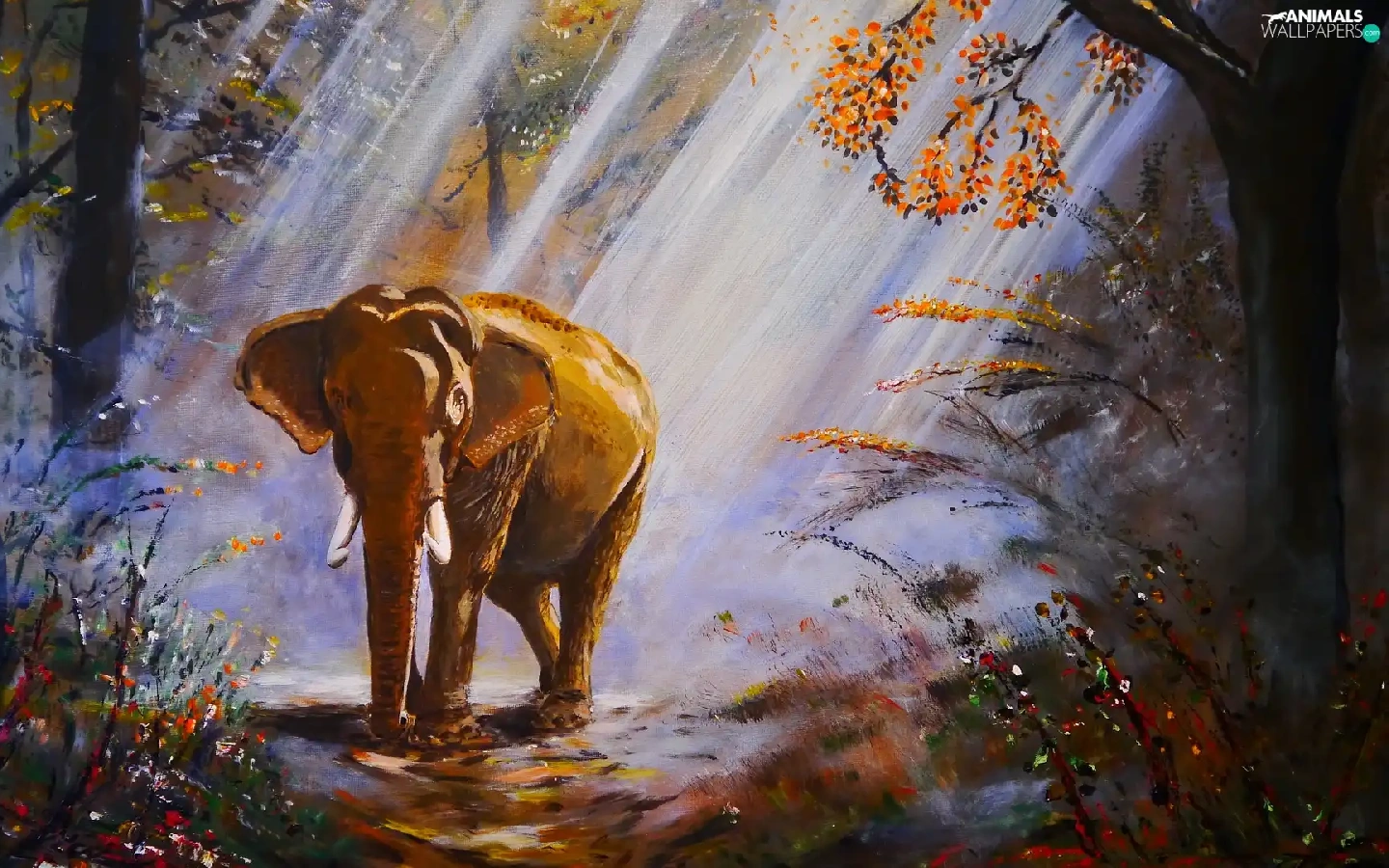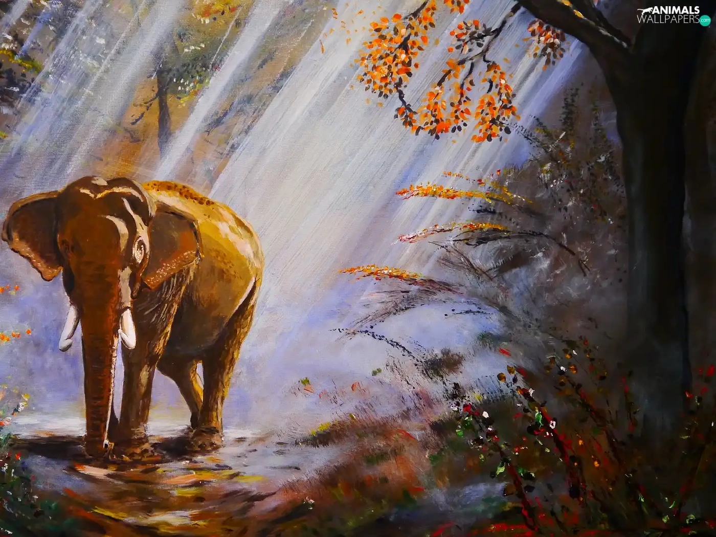 forest, painting, ligh, Way, flash, viewes, trees, Elephant, picture, luminosity, sun