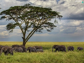 Elephants, Clouds, Sky, trees