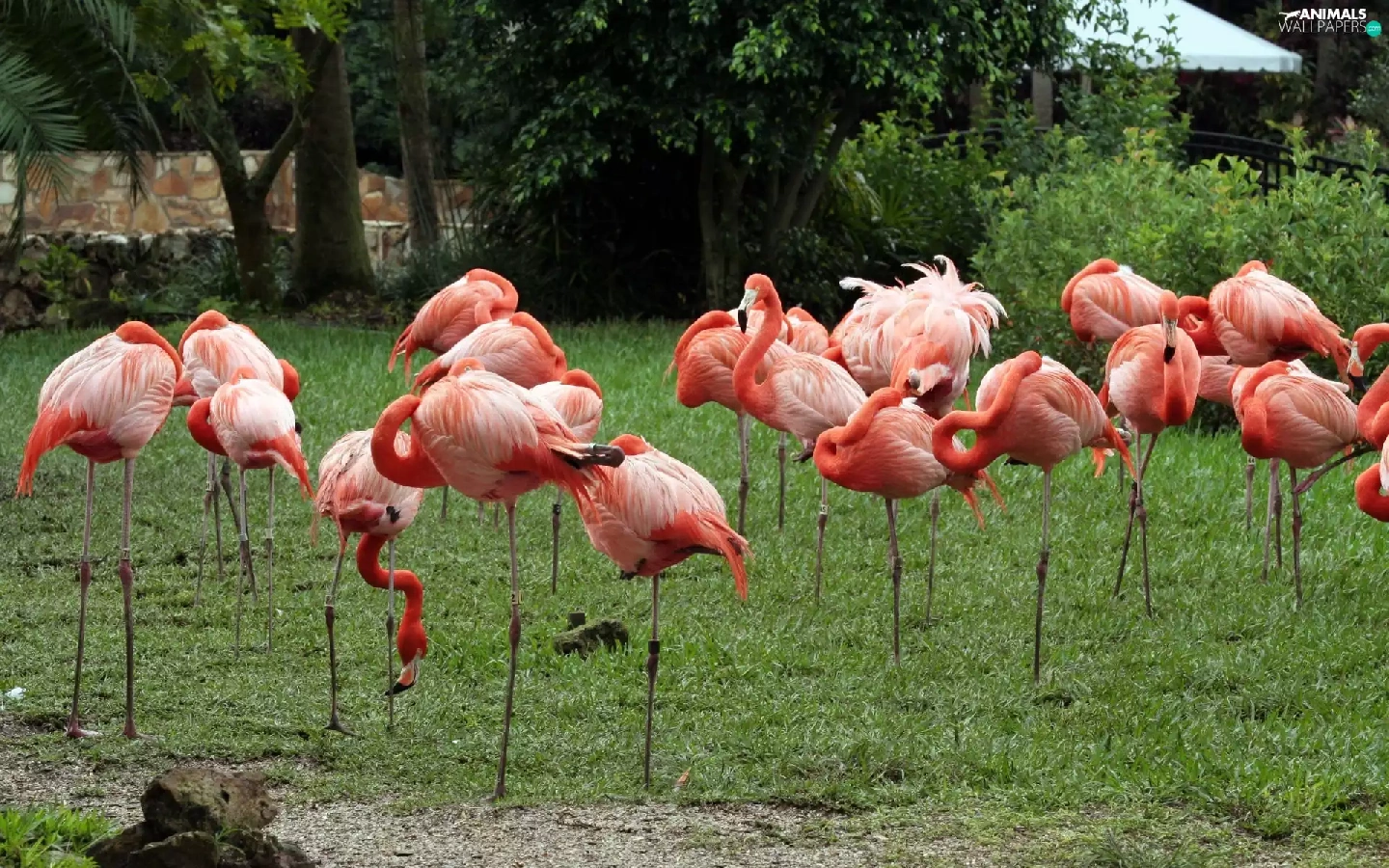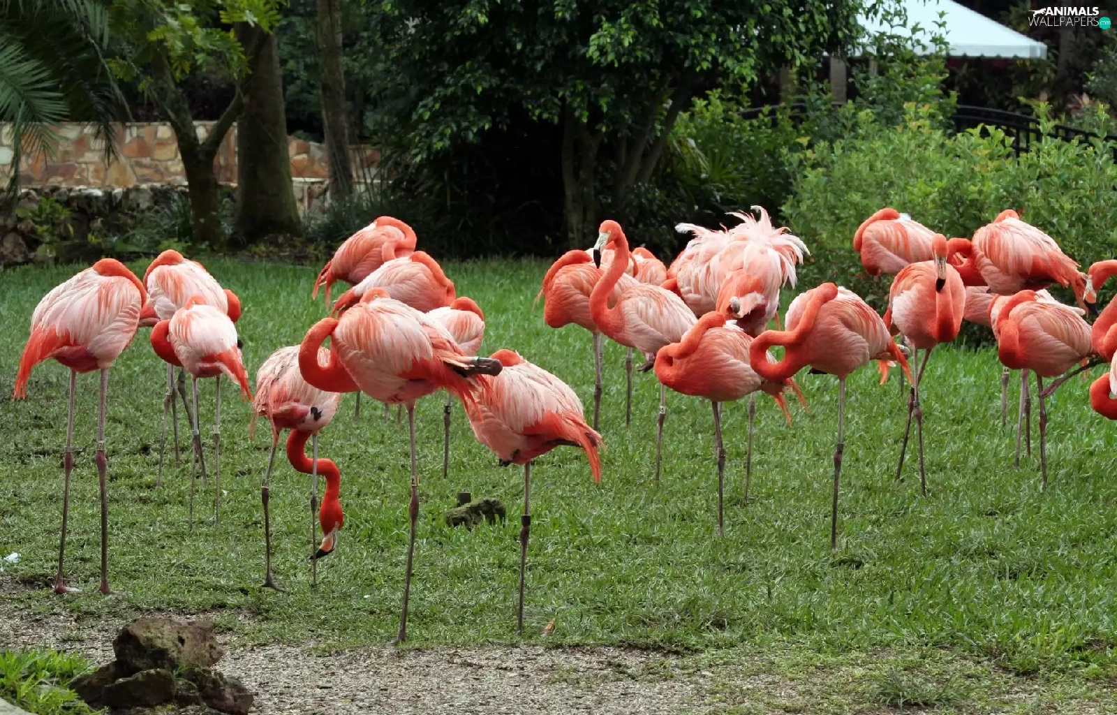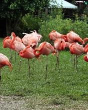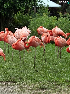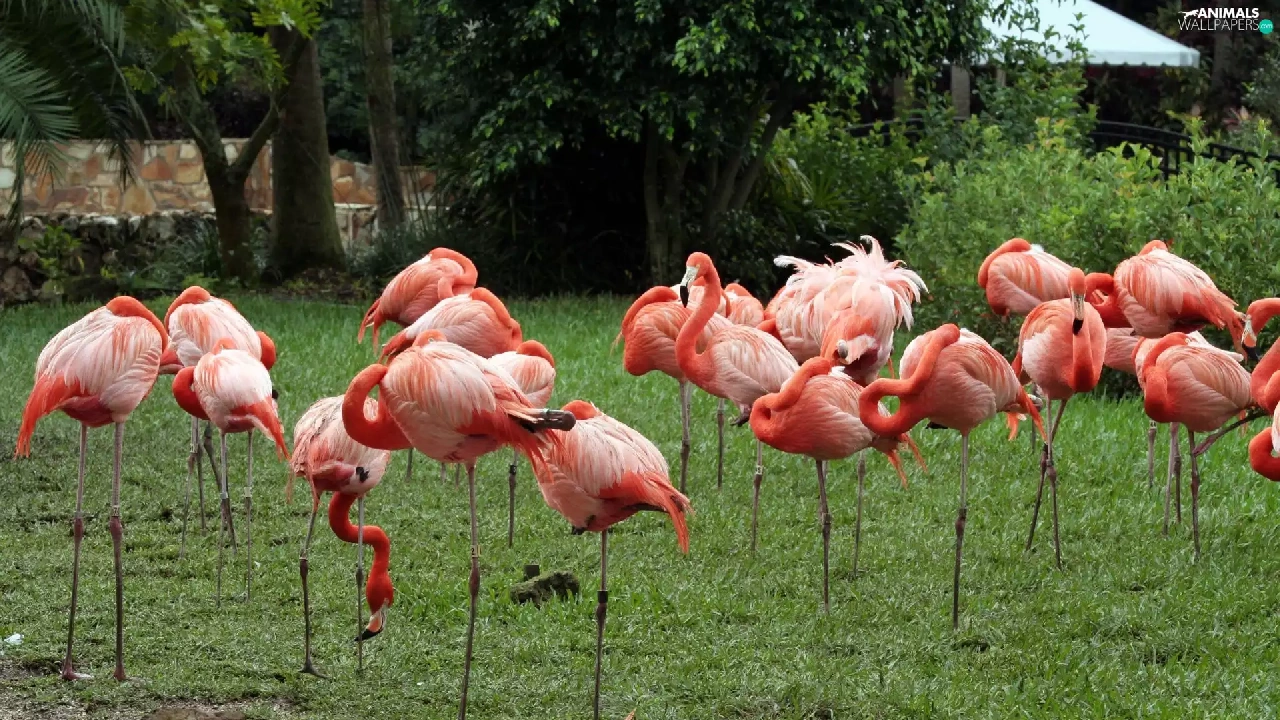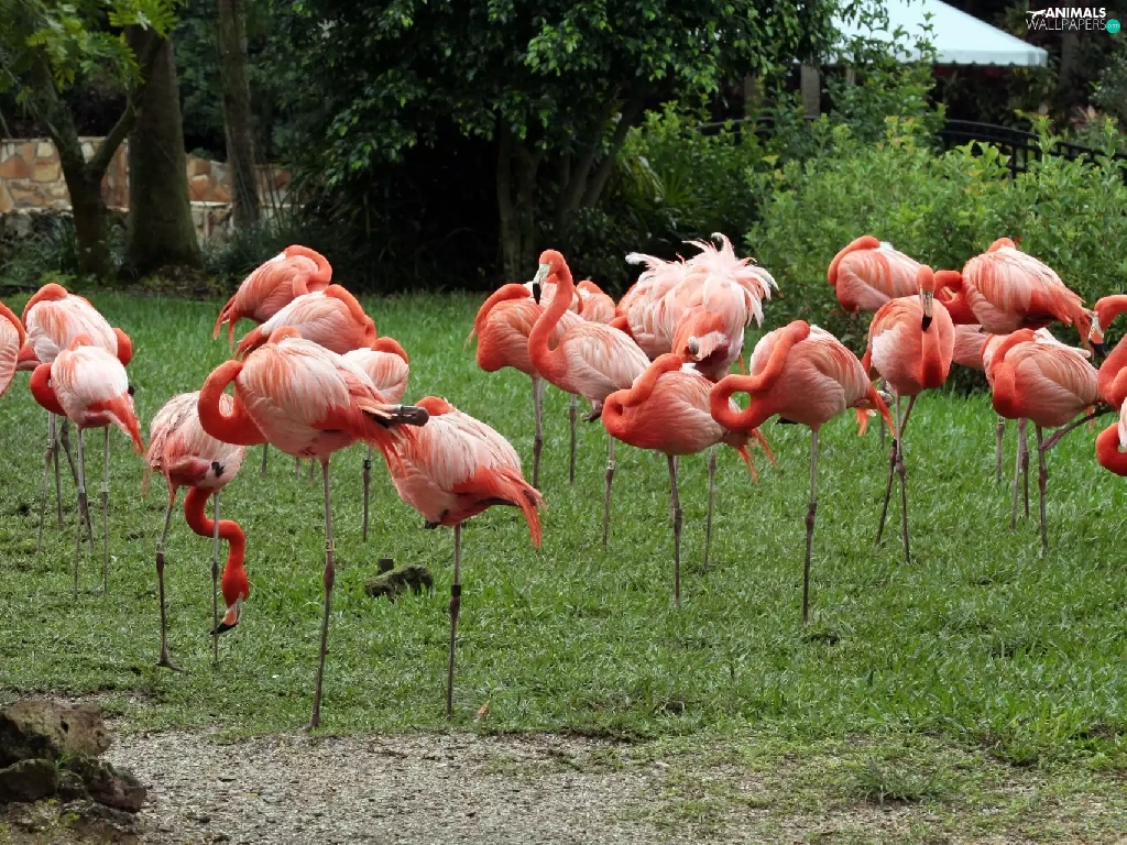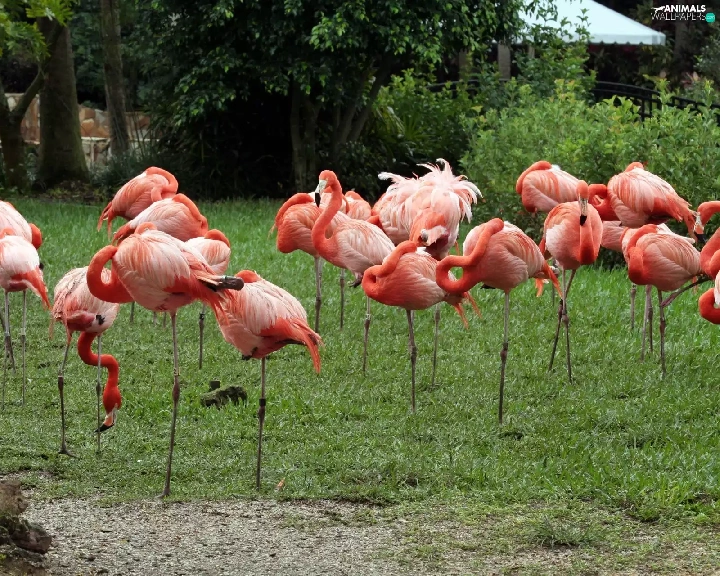 Flamingos, viewes, grass, trees
