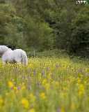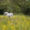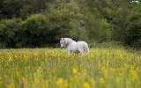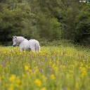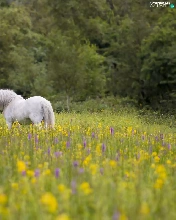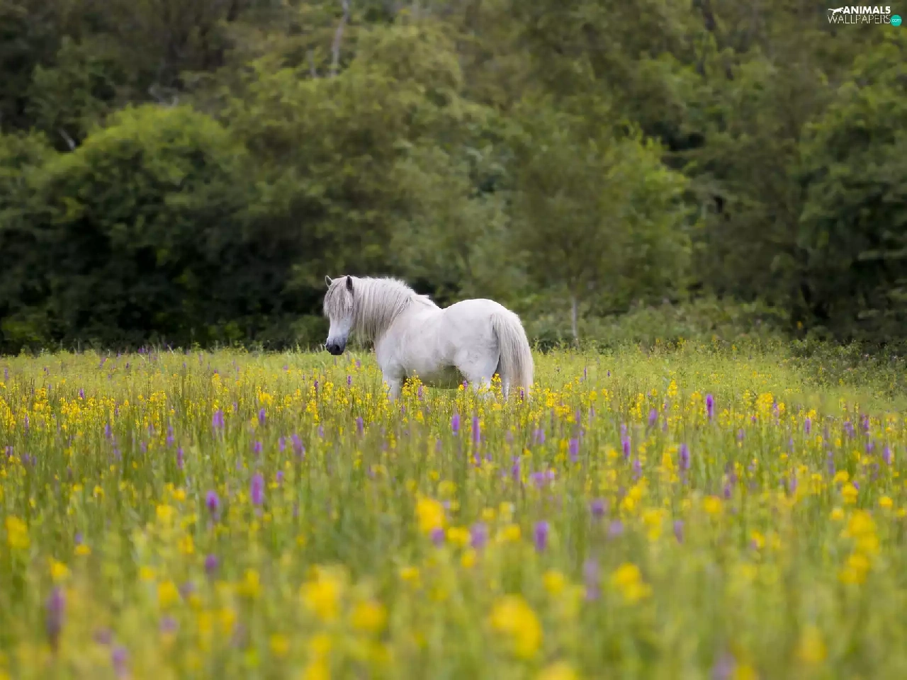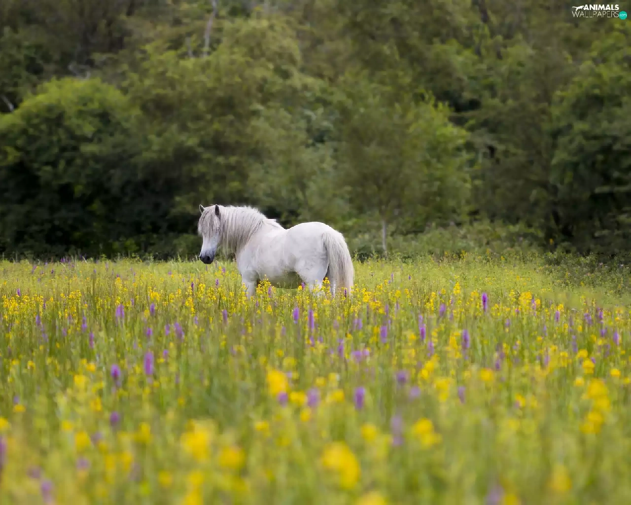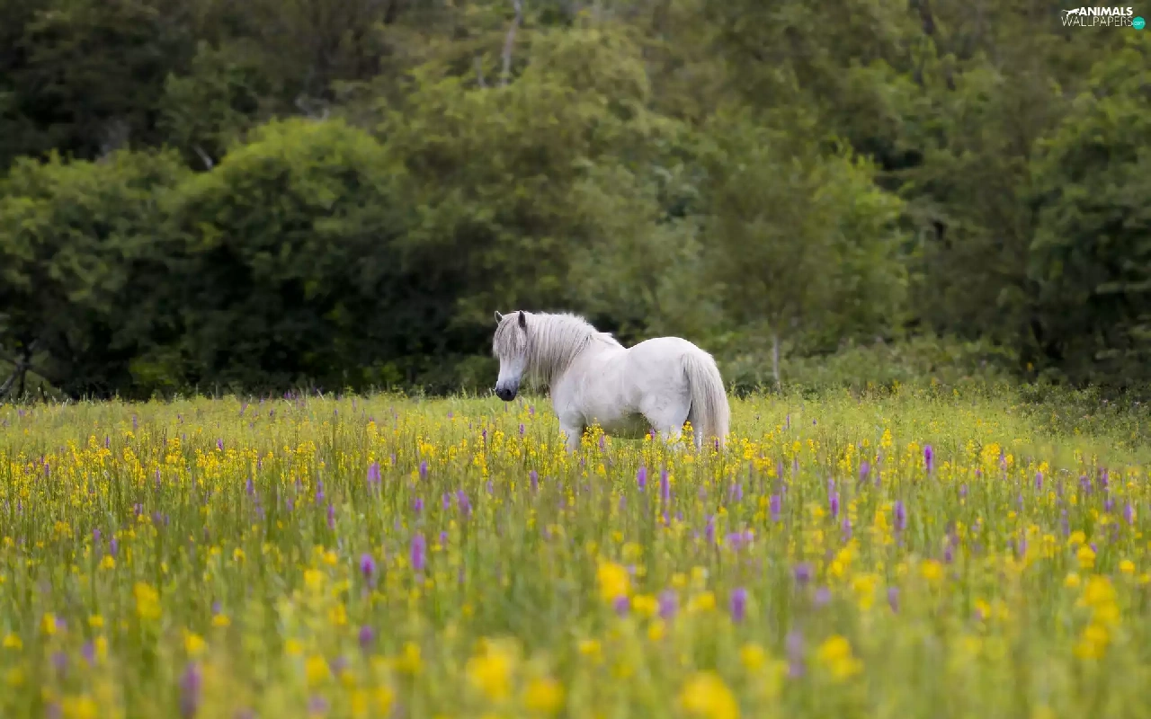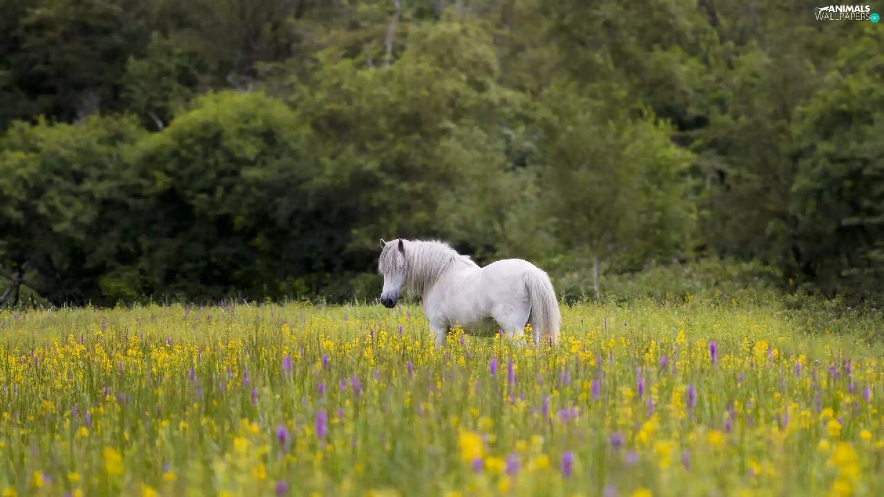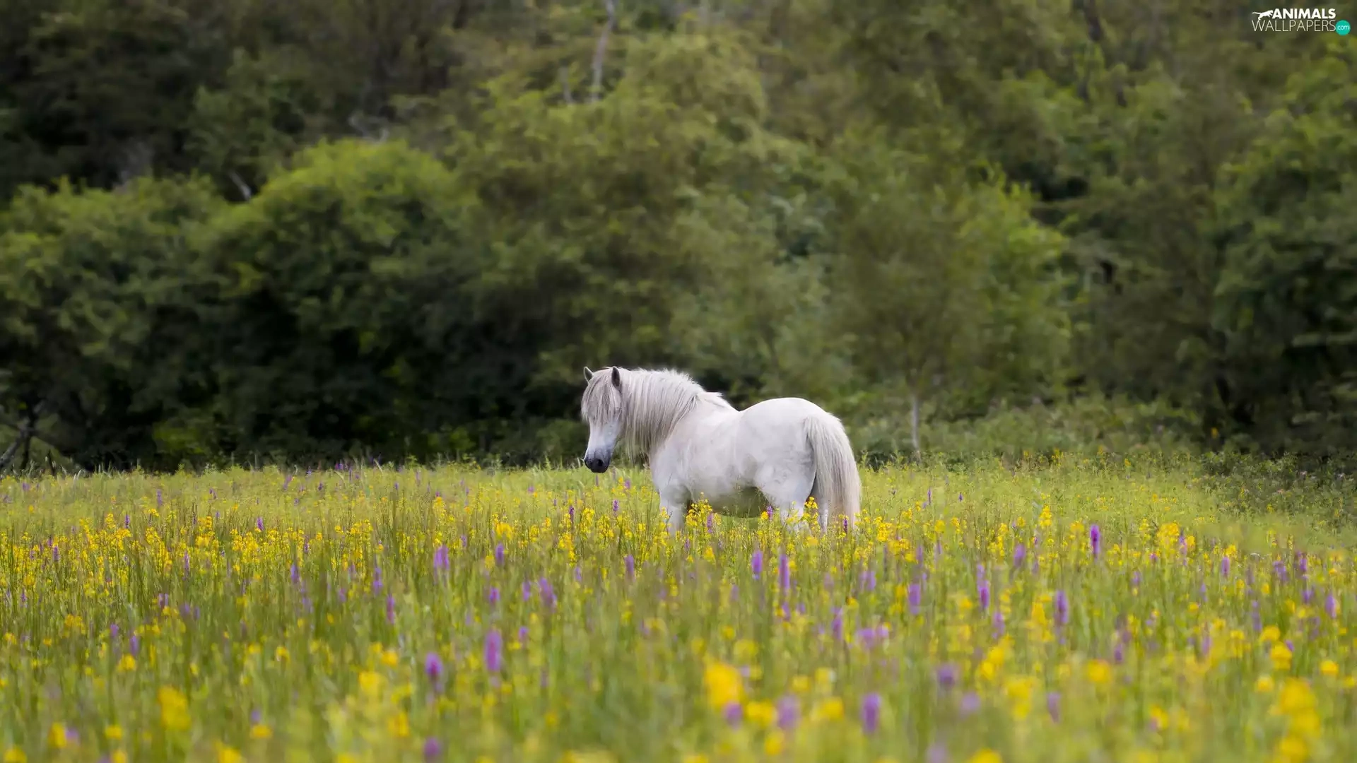 viewes, White, Flowers, trees, Horse, Meadow, summer