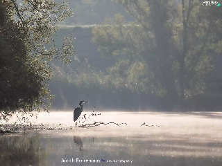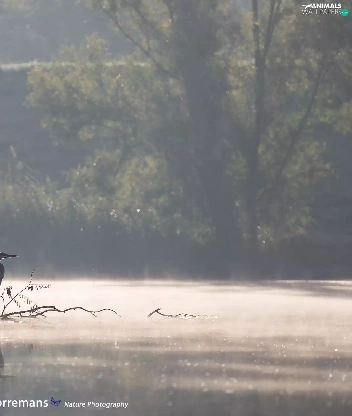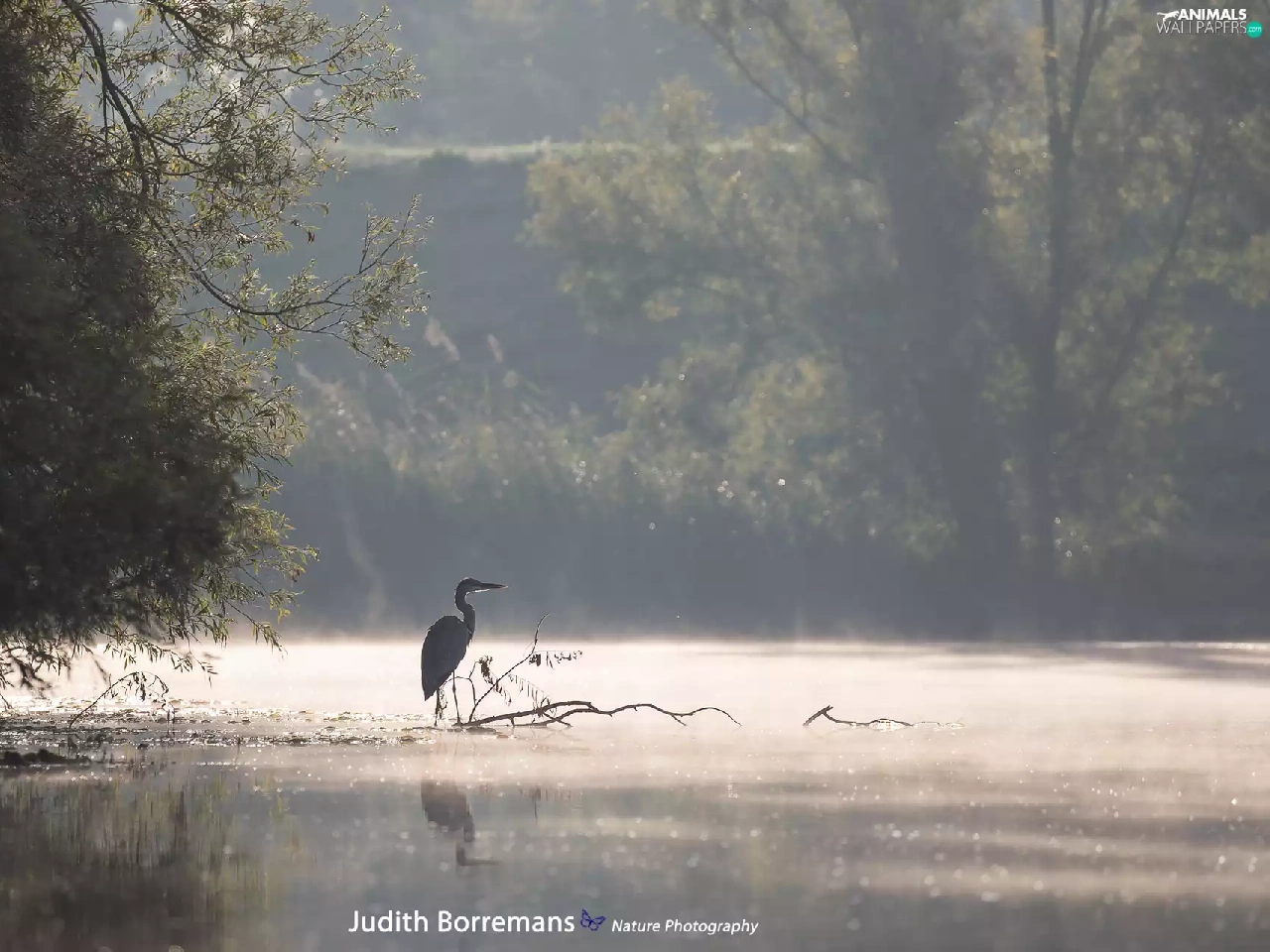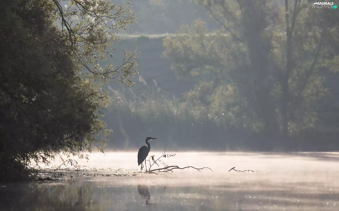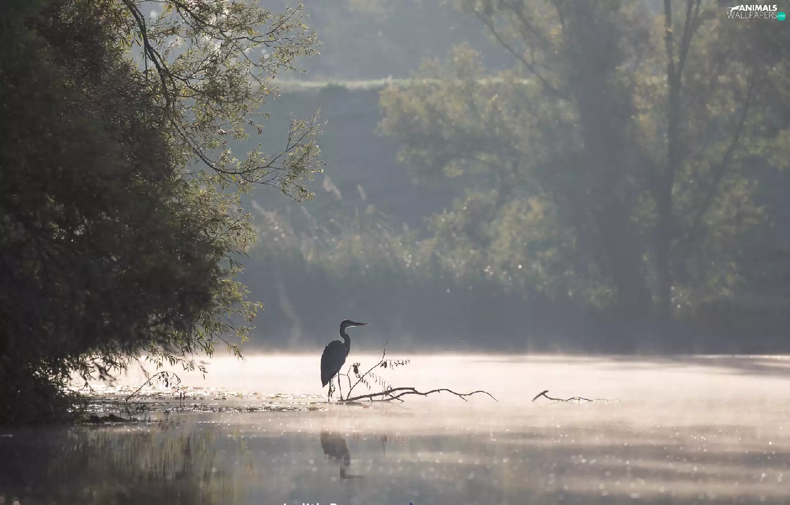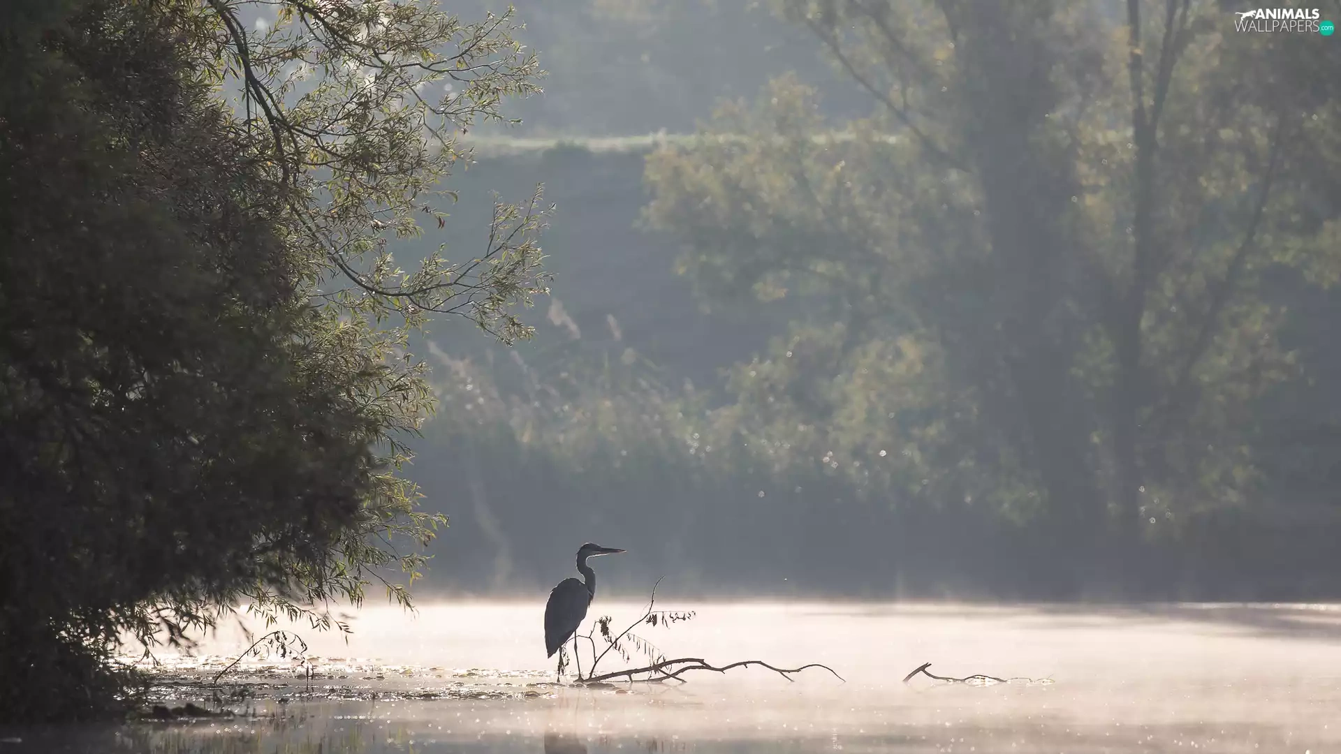 trees, viewes, heron, branch pics, Fog, forest, lake, rushes