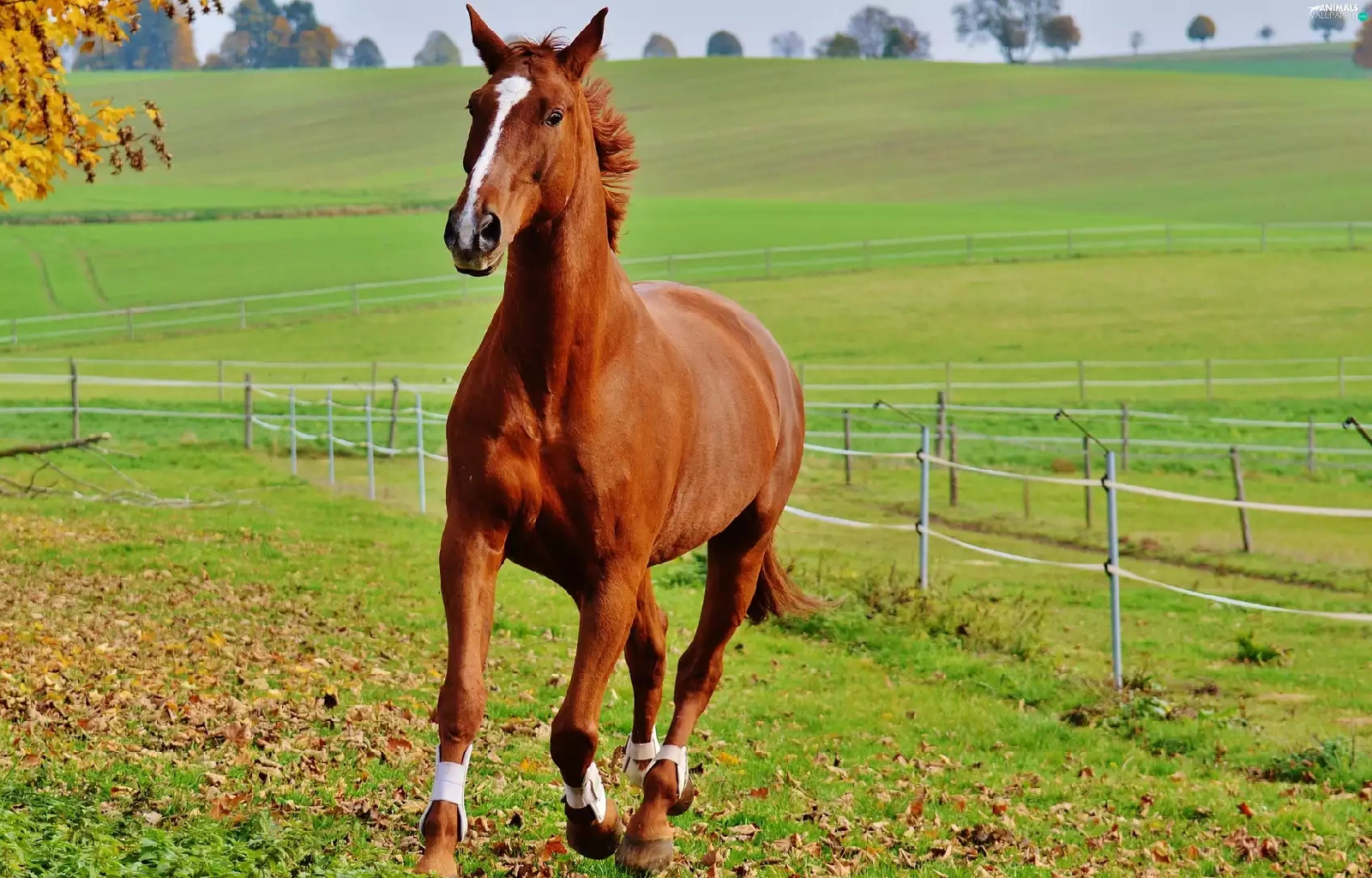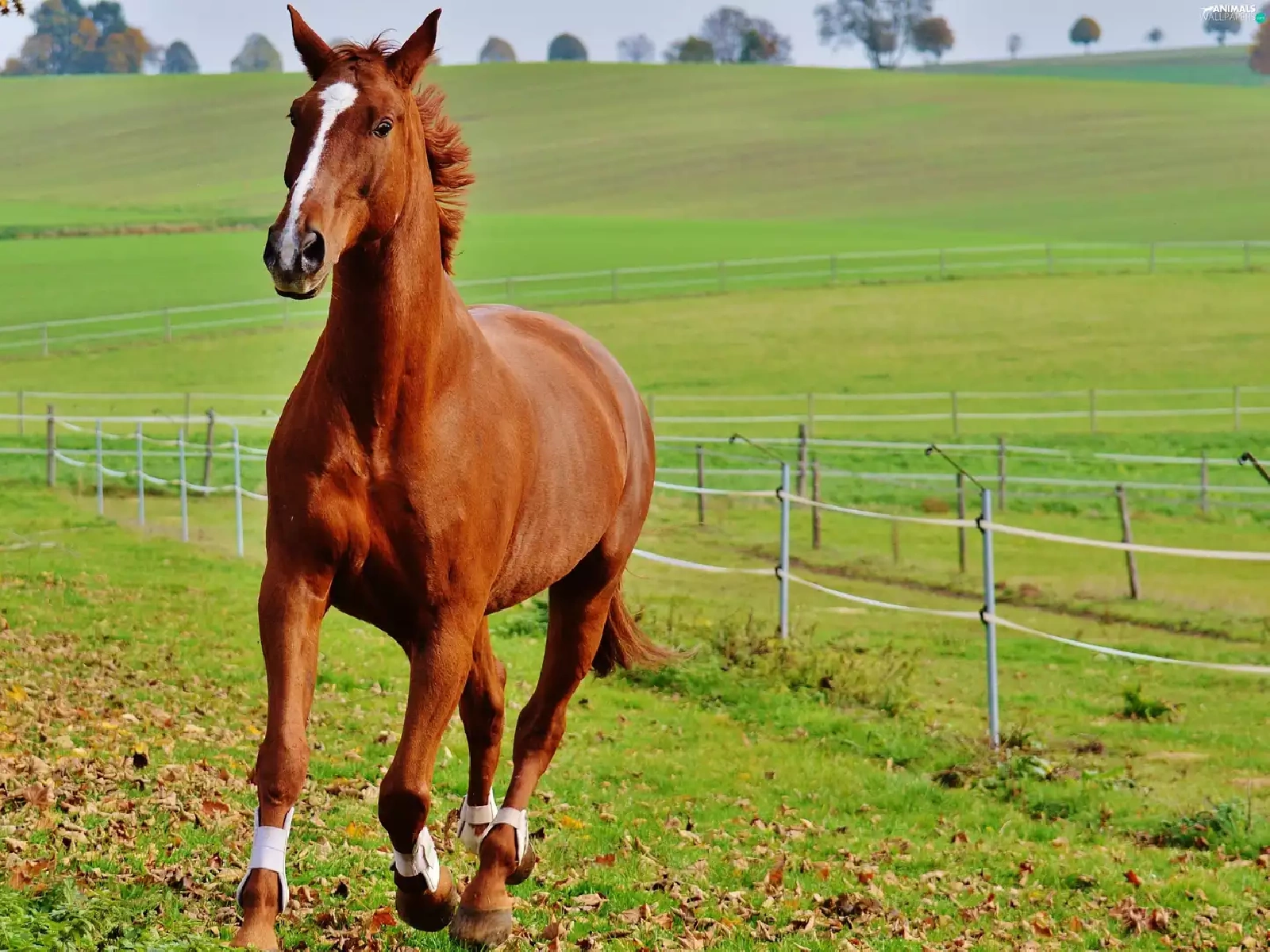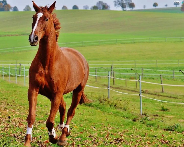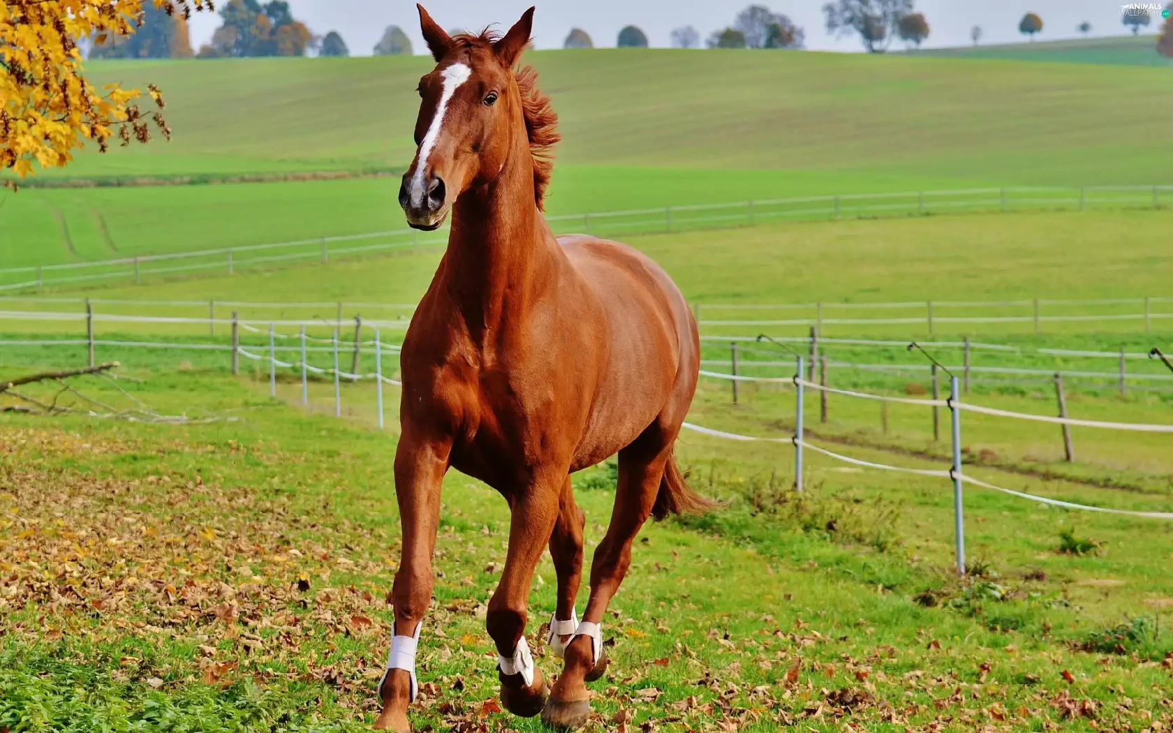 fence, trees, gallop, pasture, Horse