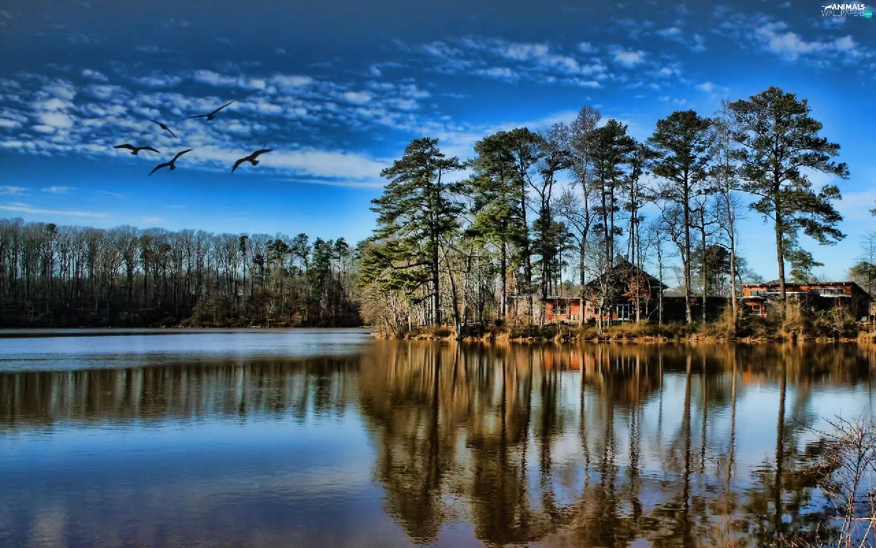 lake, viewes, birds, trees
