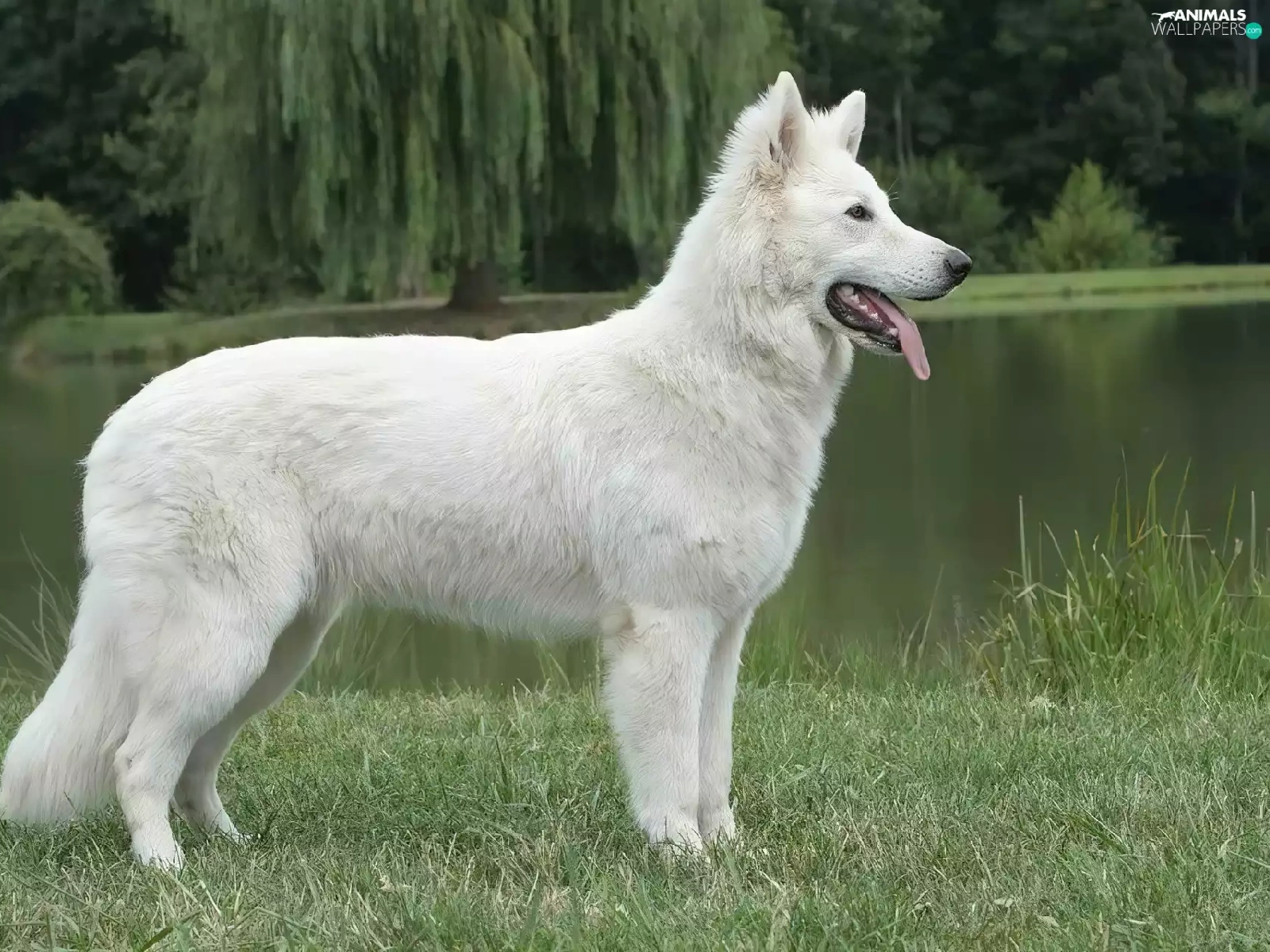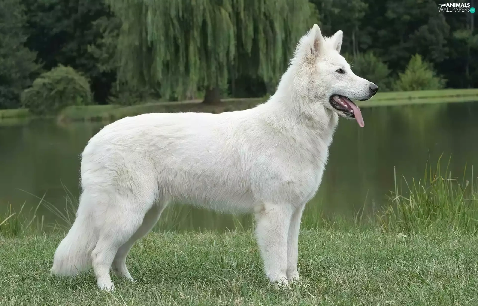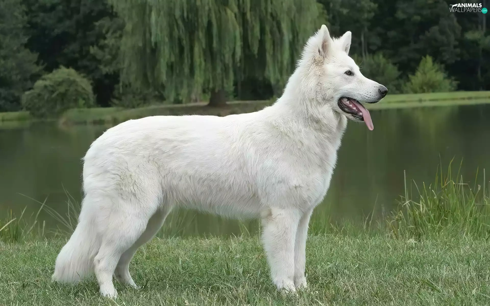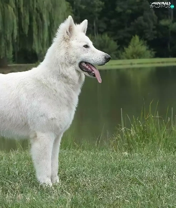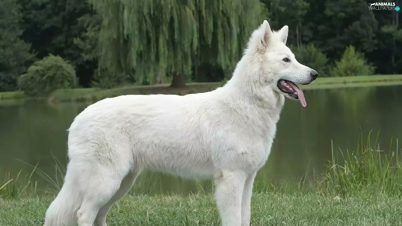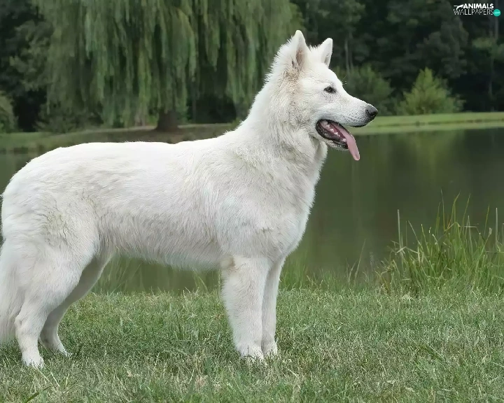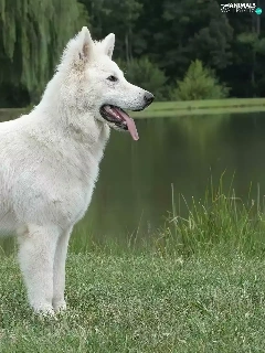trees, viewes, Shepherd US-Canadian, water, White Swiss Shepherd