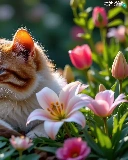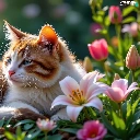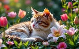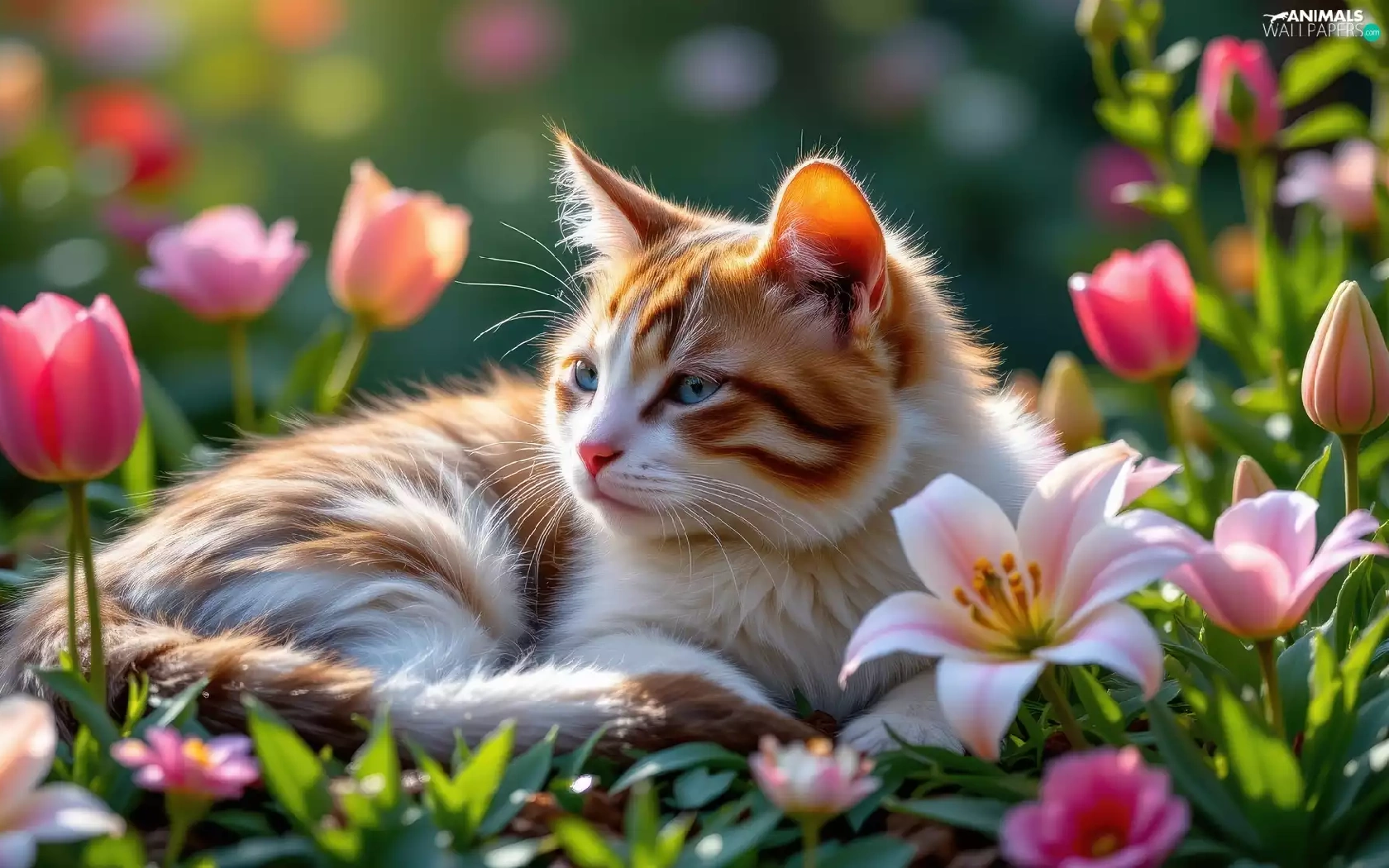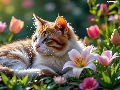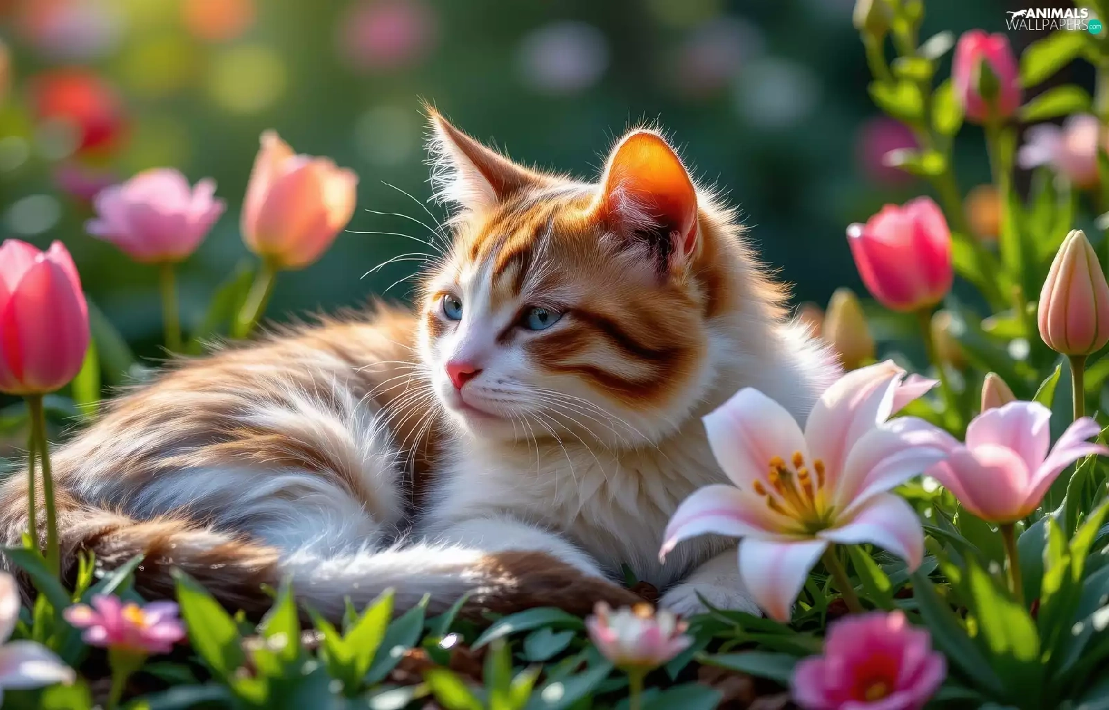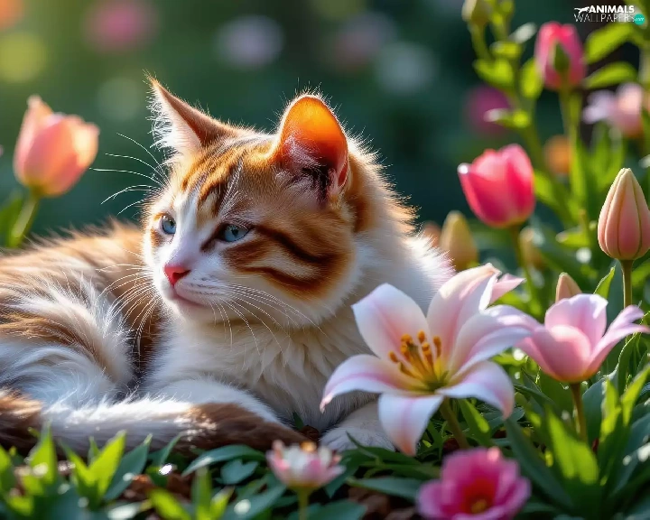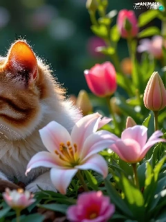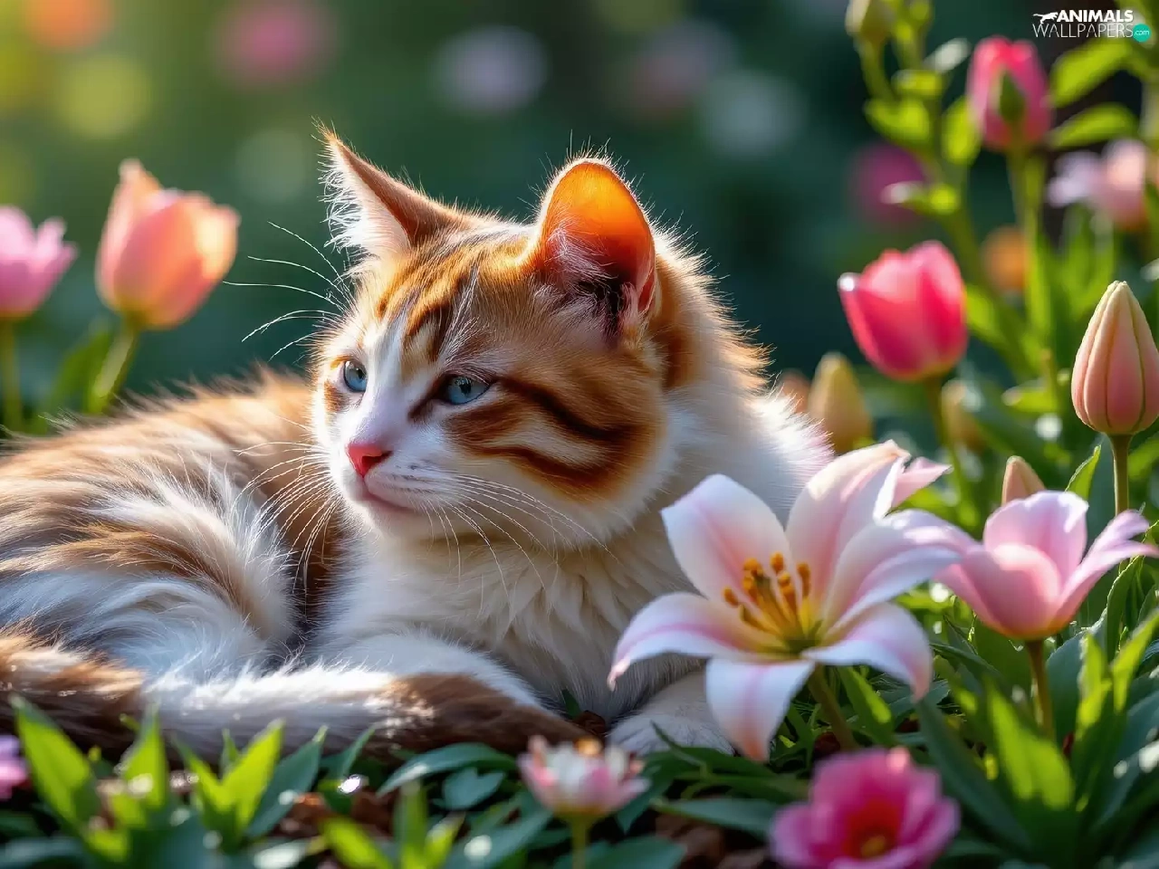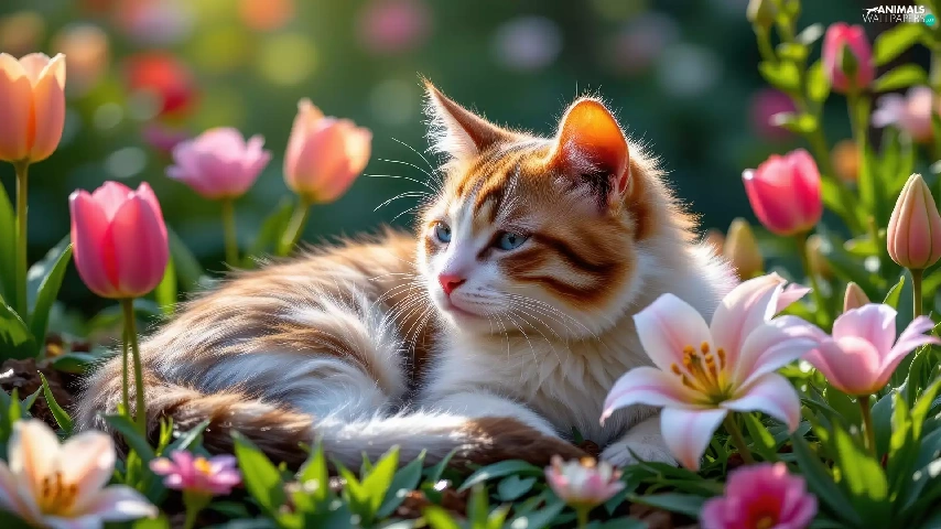 lilies, Tulips, cat, Flowers, lying