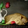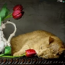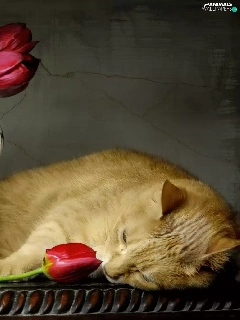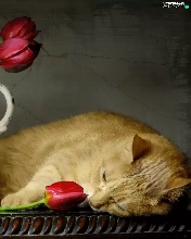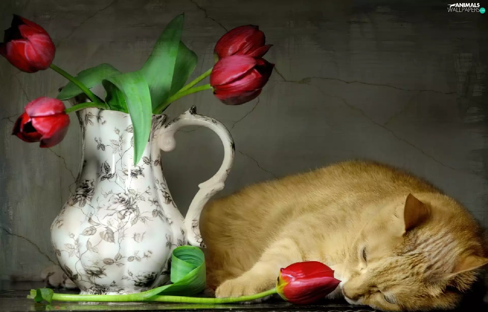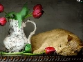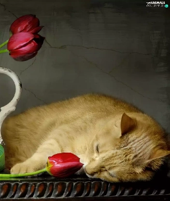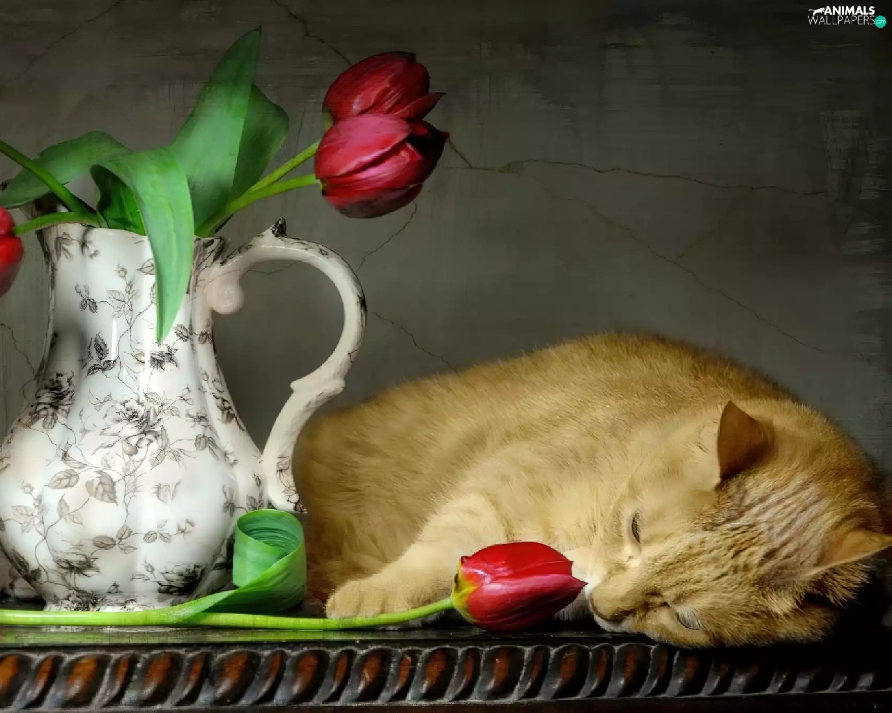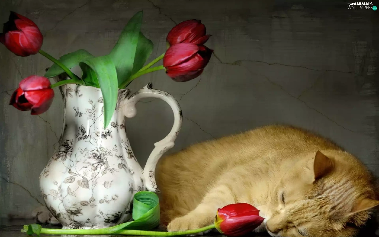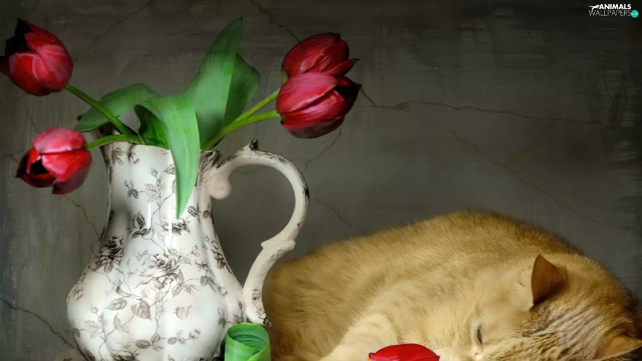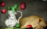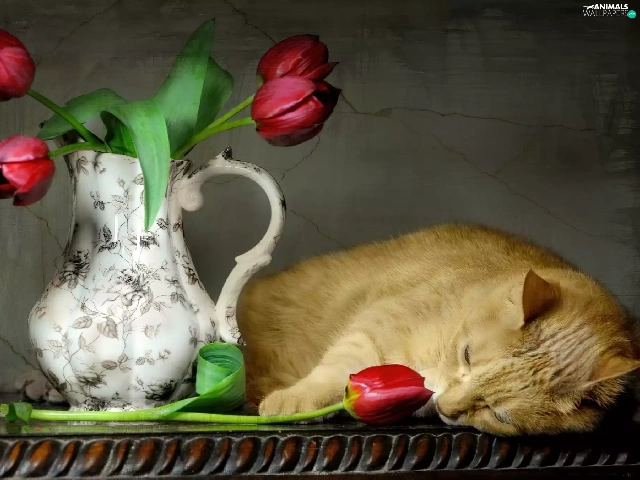 Tulips, cat, pitcher
