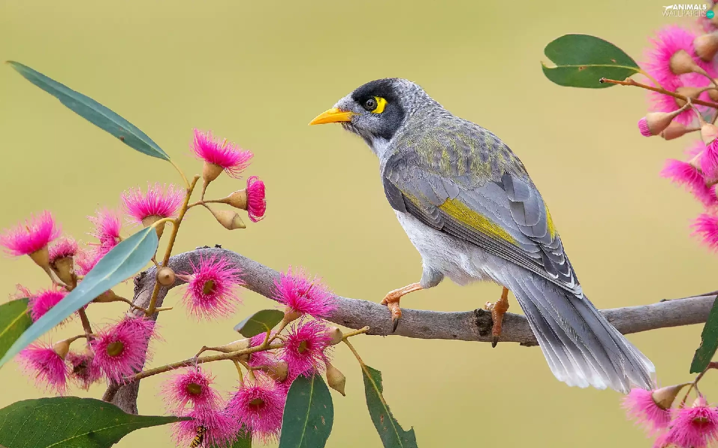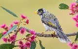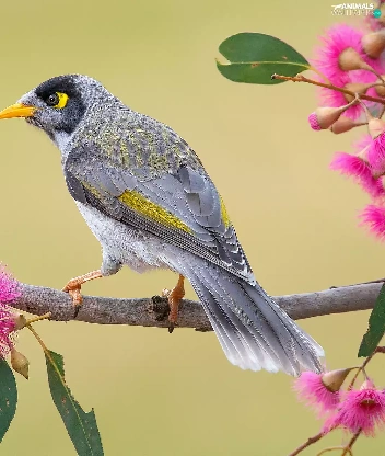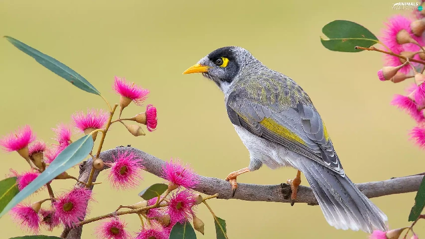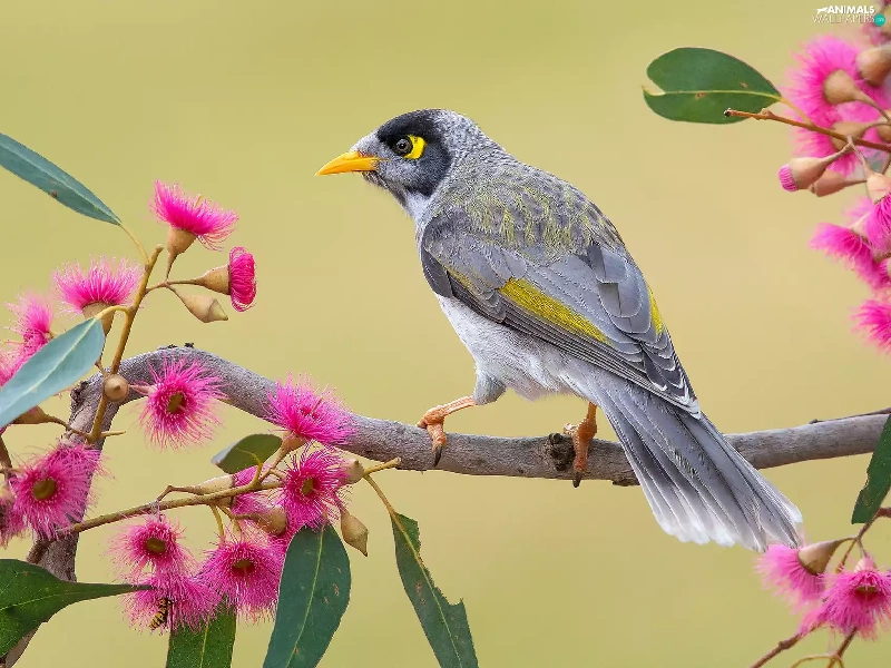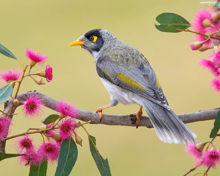 Bird, twig, Flowers, Noisy Miner