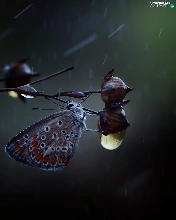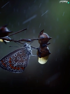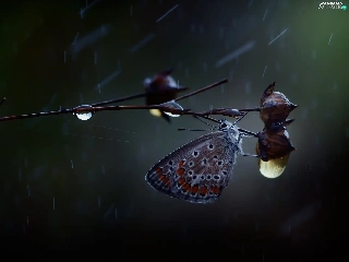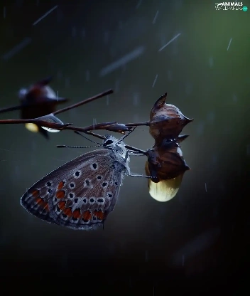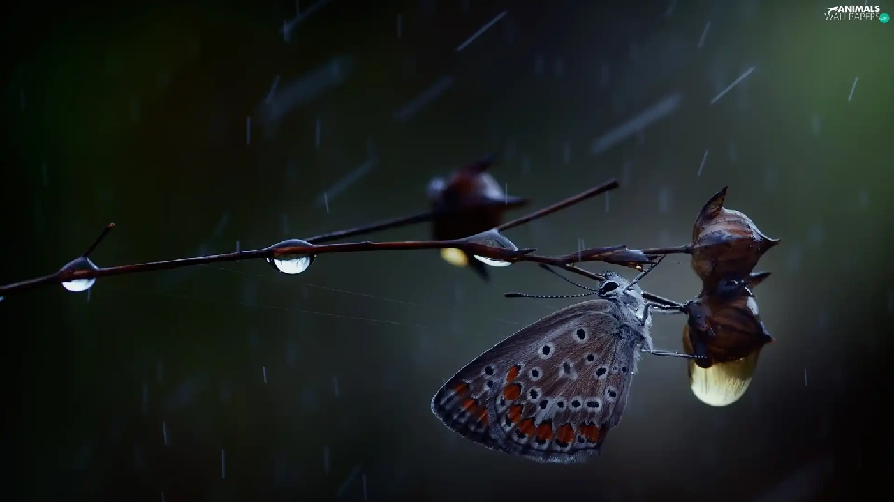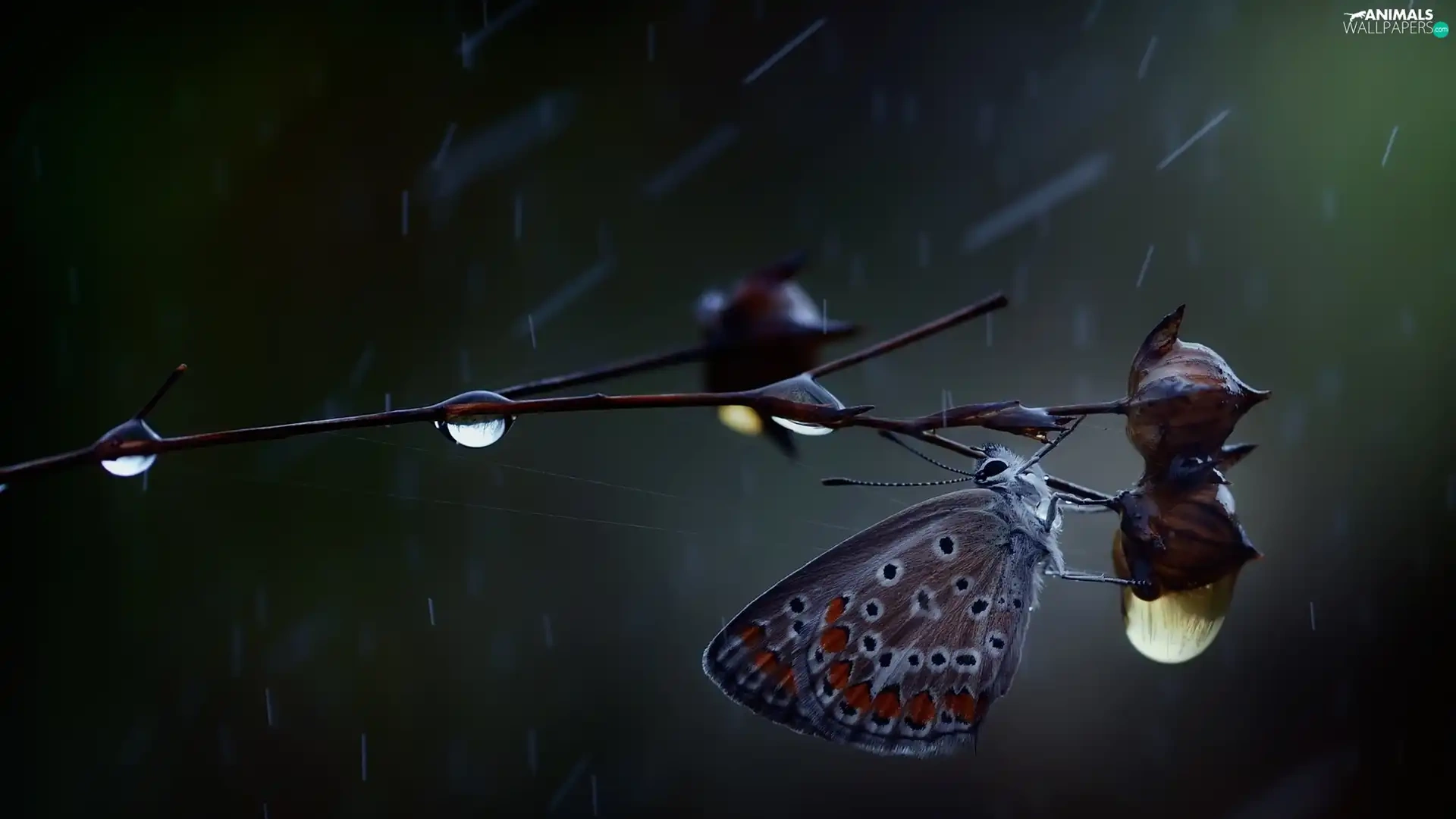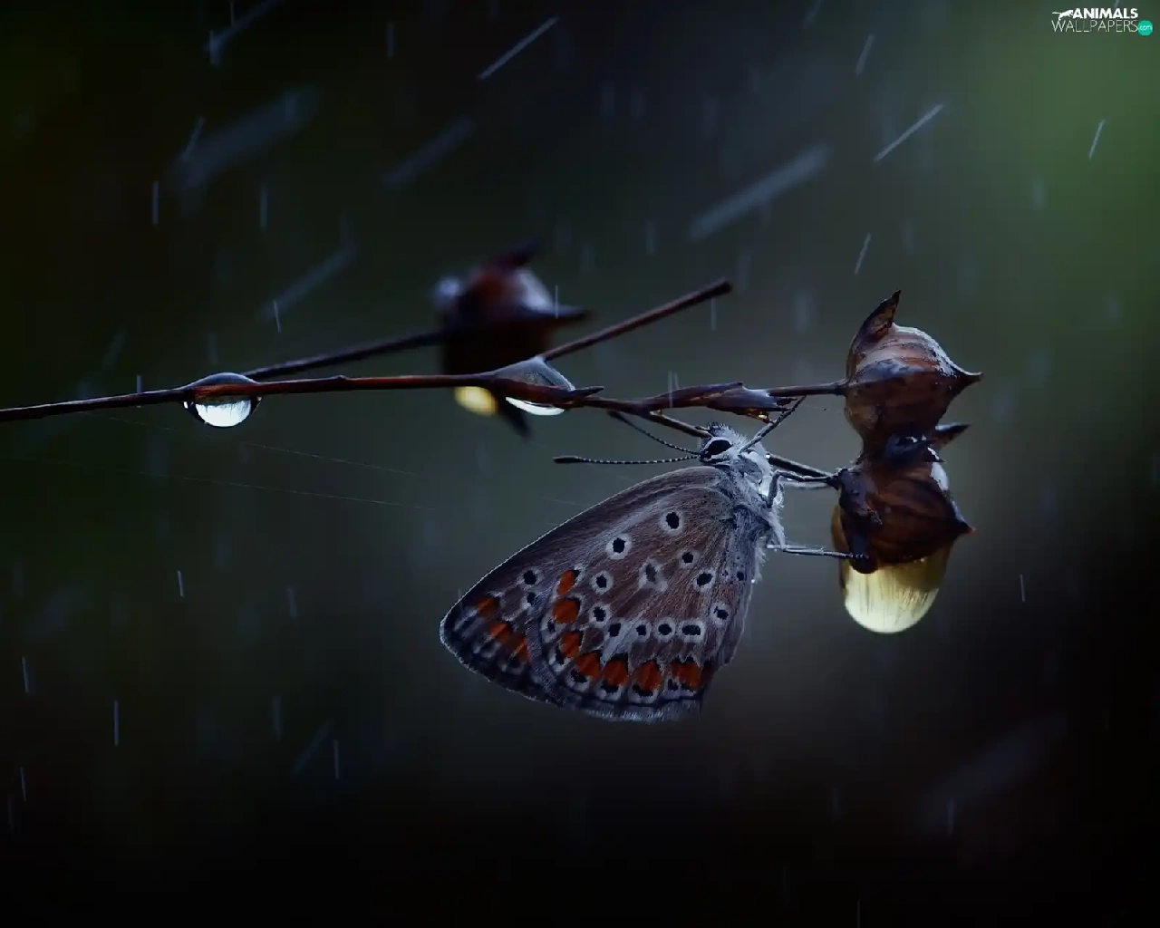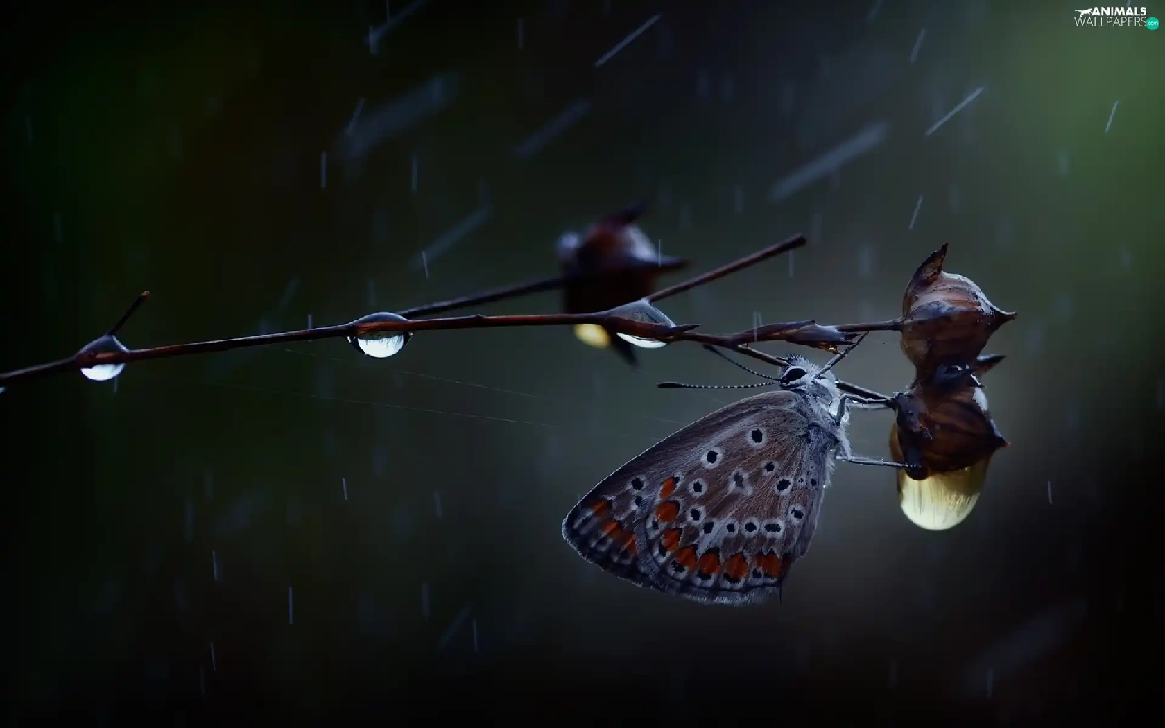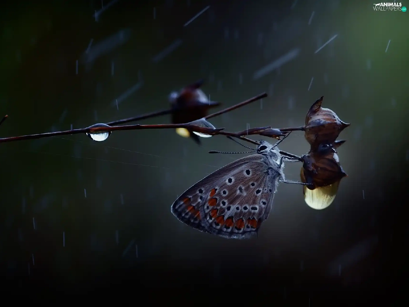 twig, butterfly, drops, Rain, The herb, Dusky Icarus