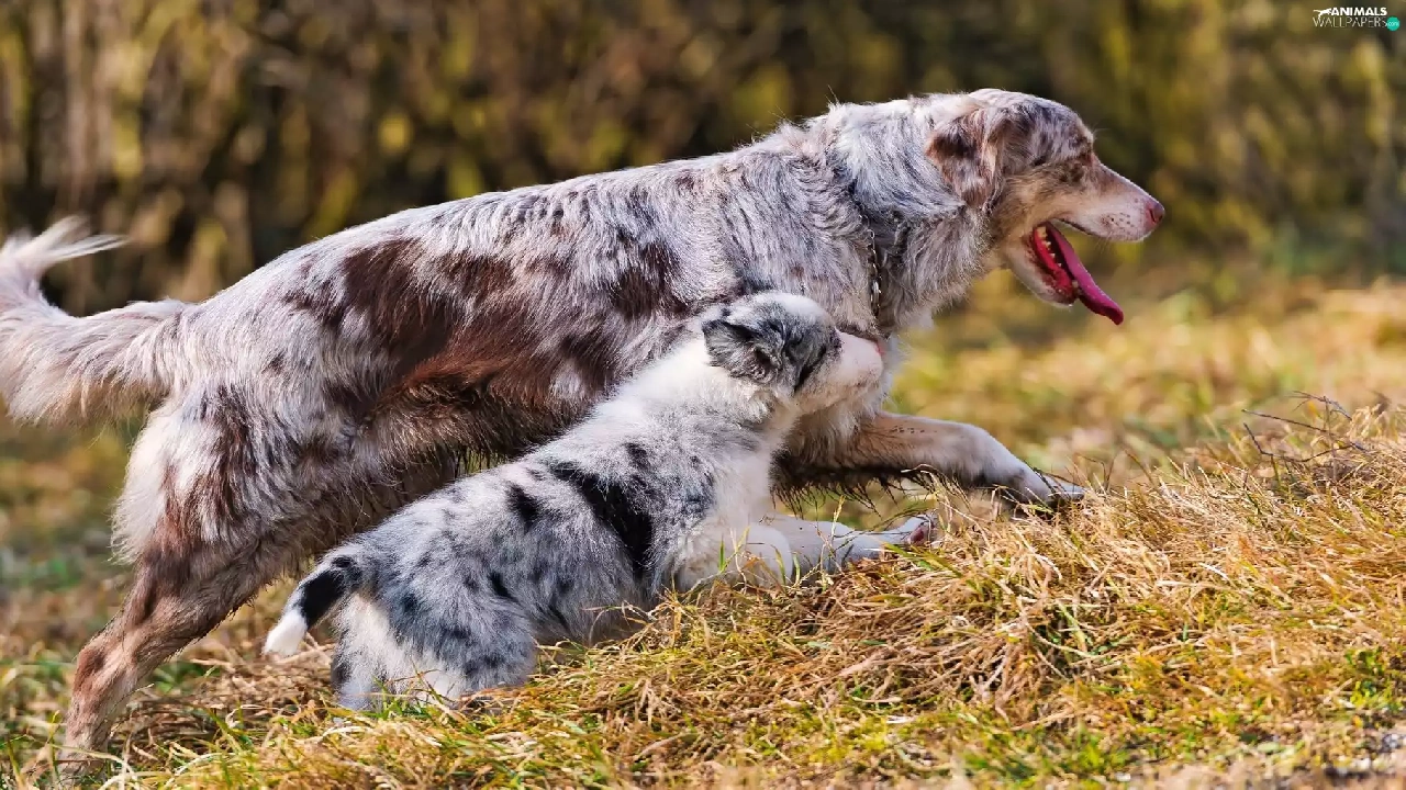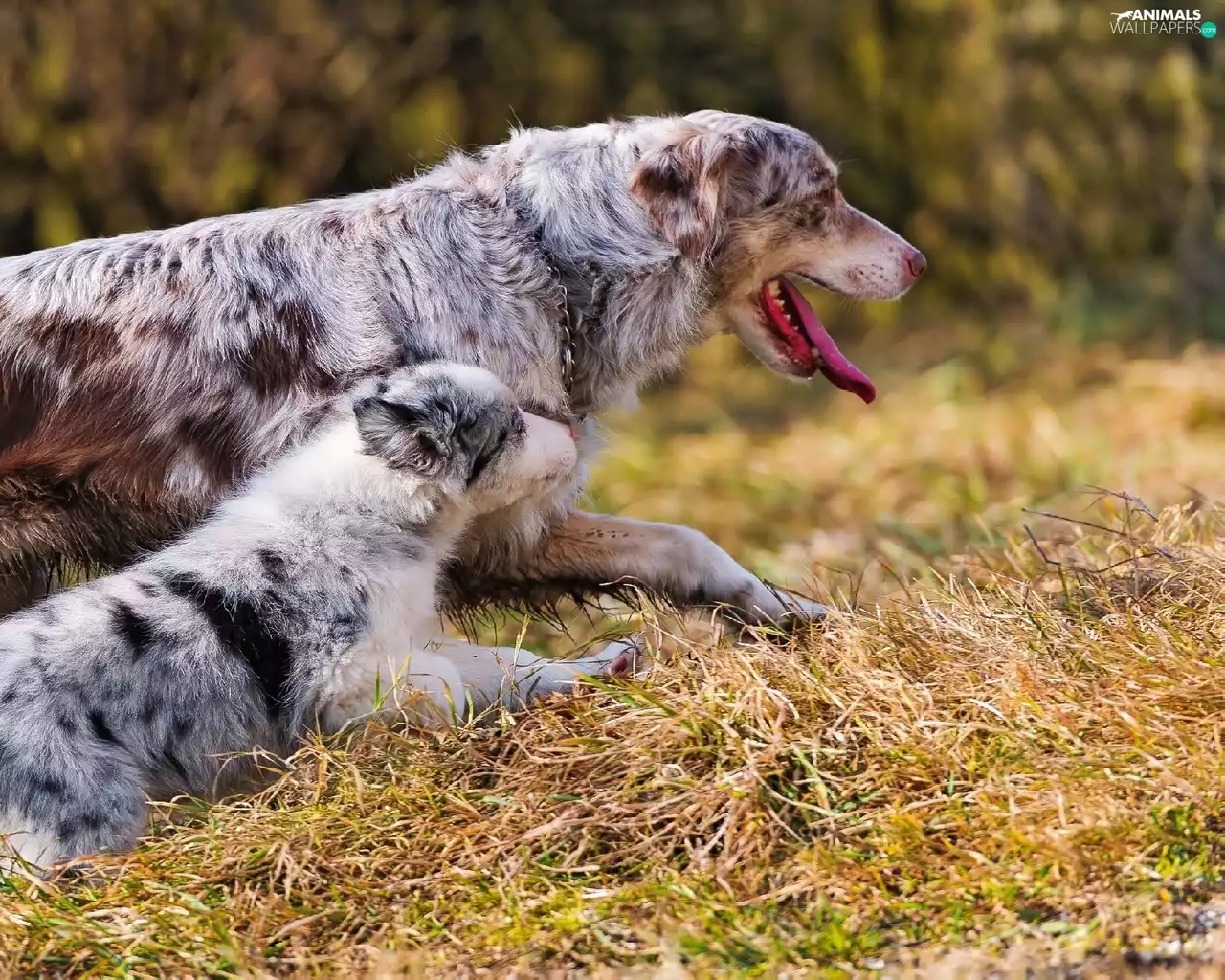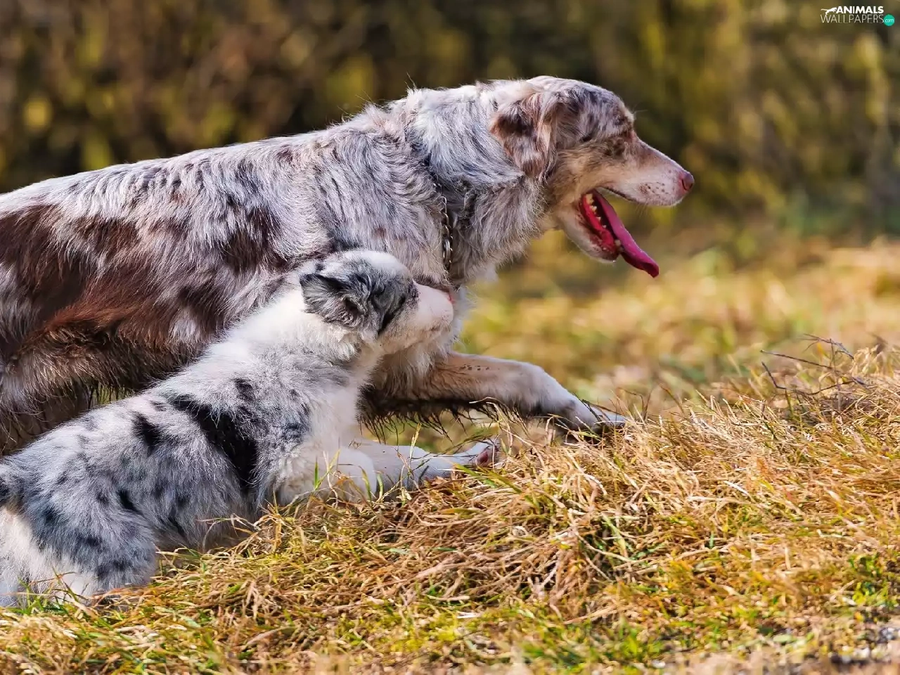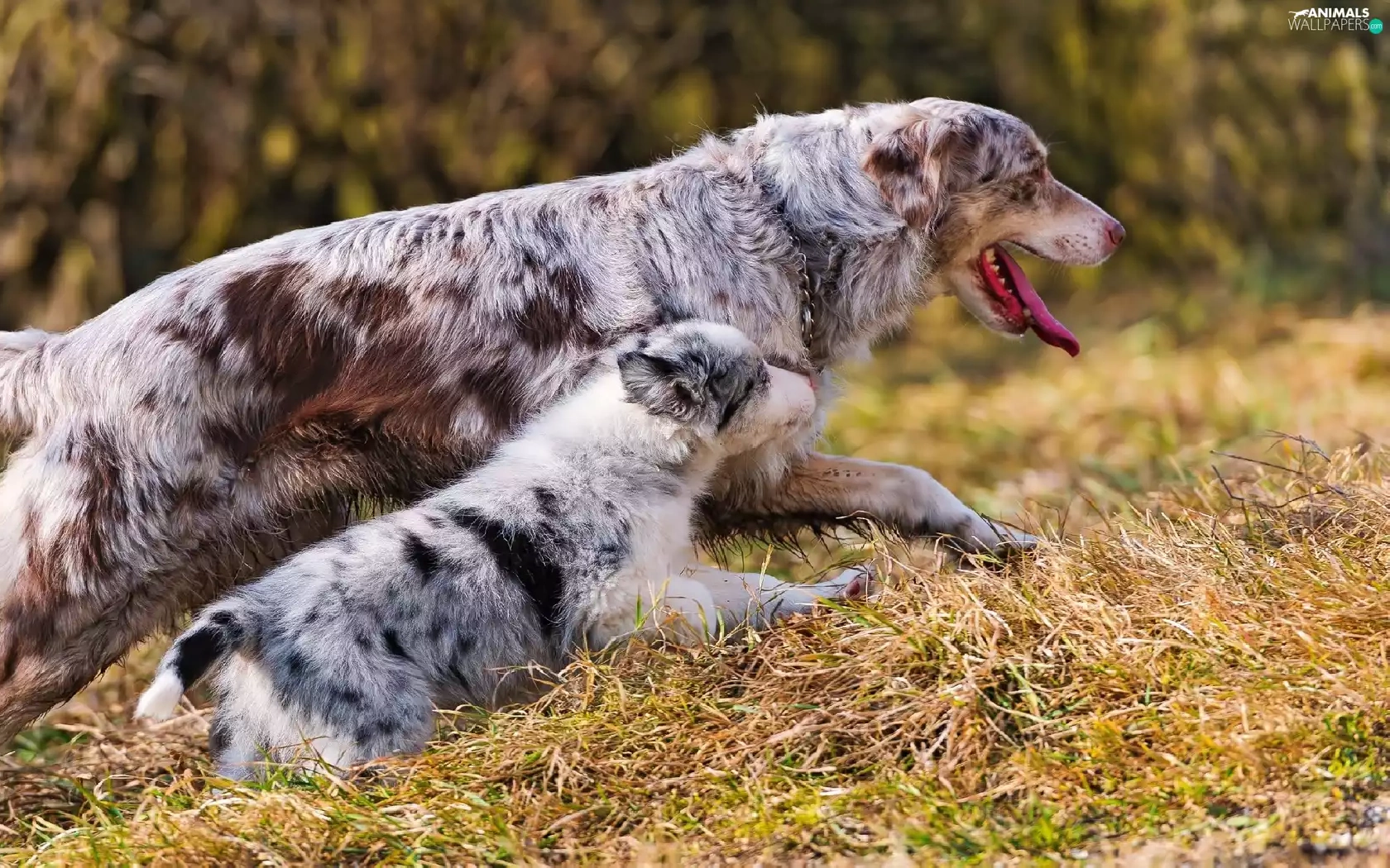 grass, Two cars, Australian Shepherds