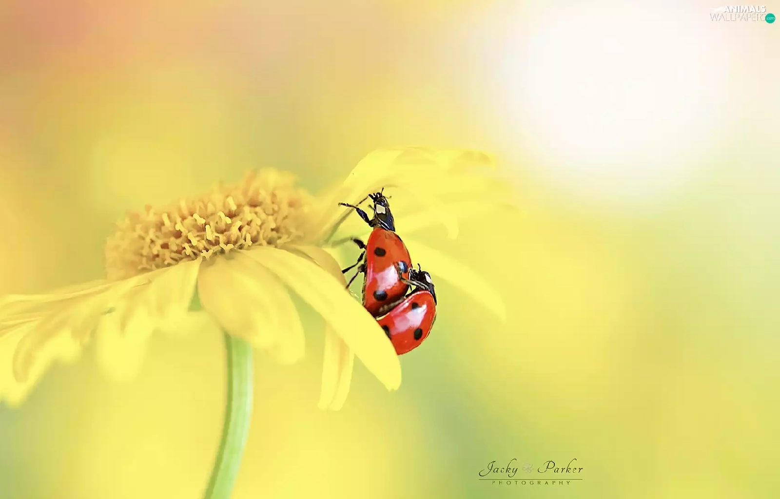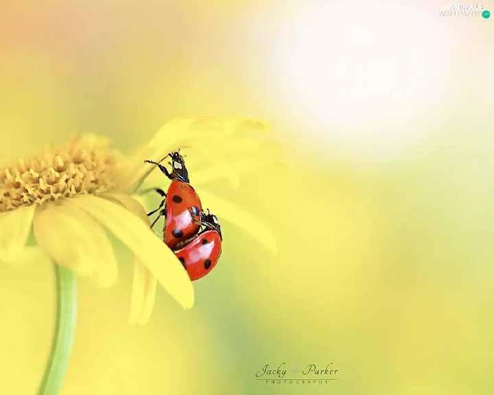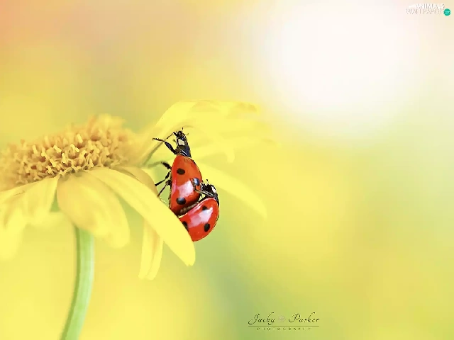 ladybugs, Close, Yellow, Two, Colourfull Flowers