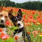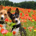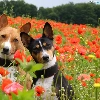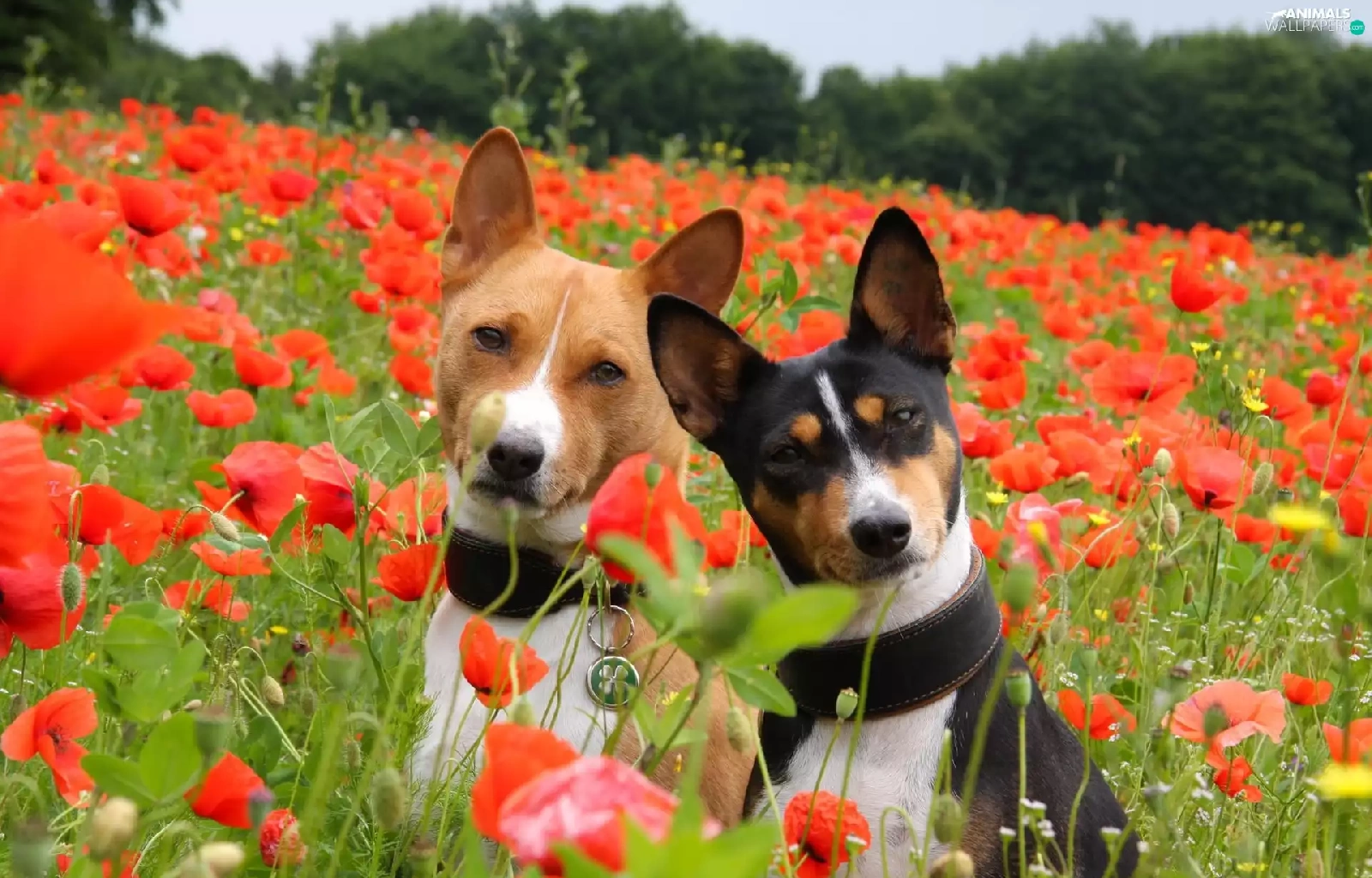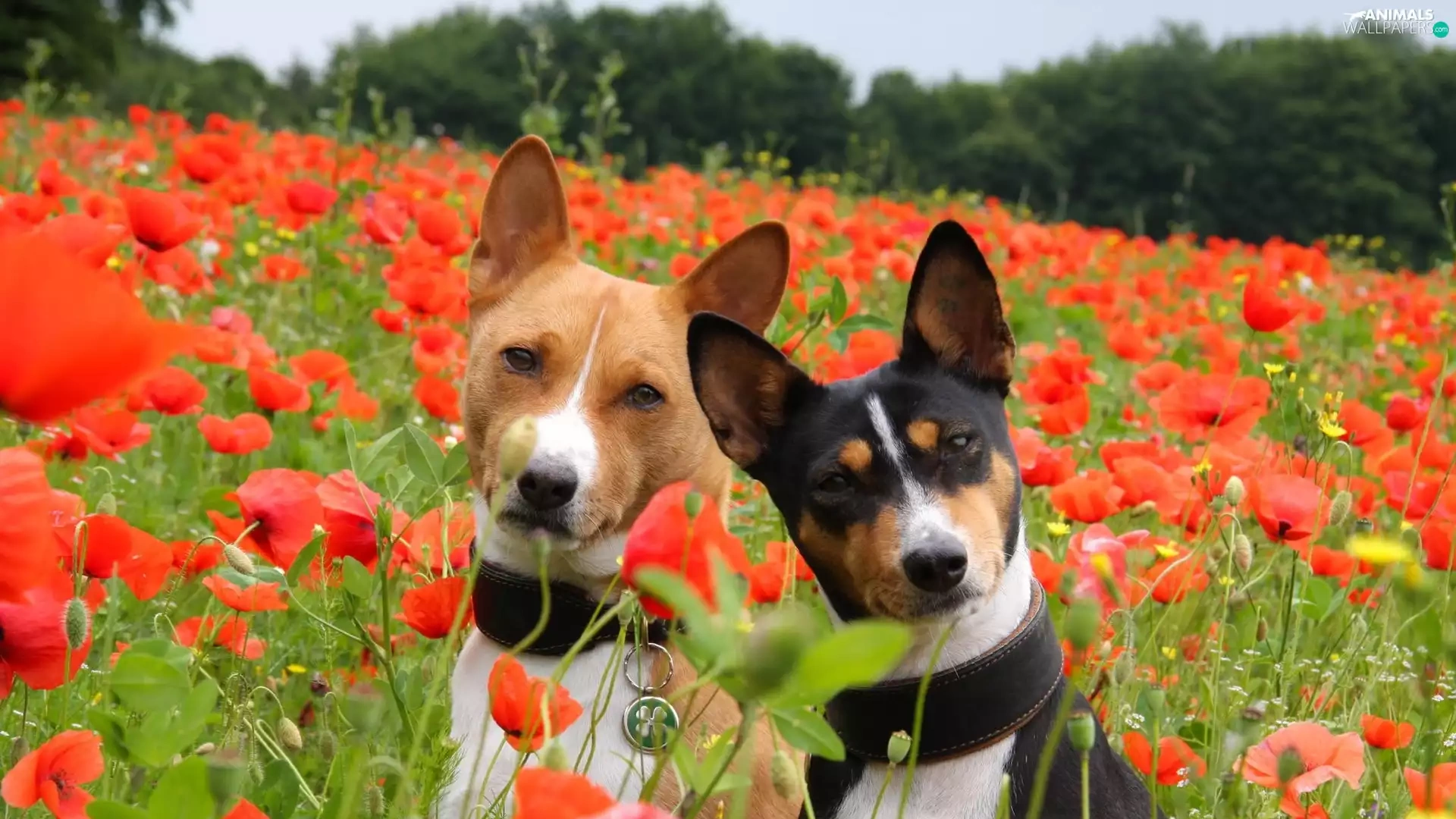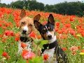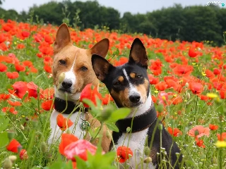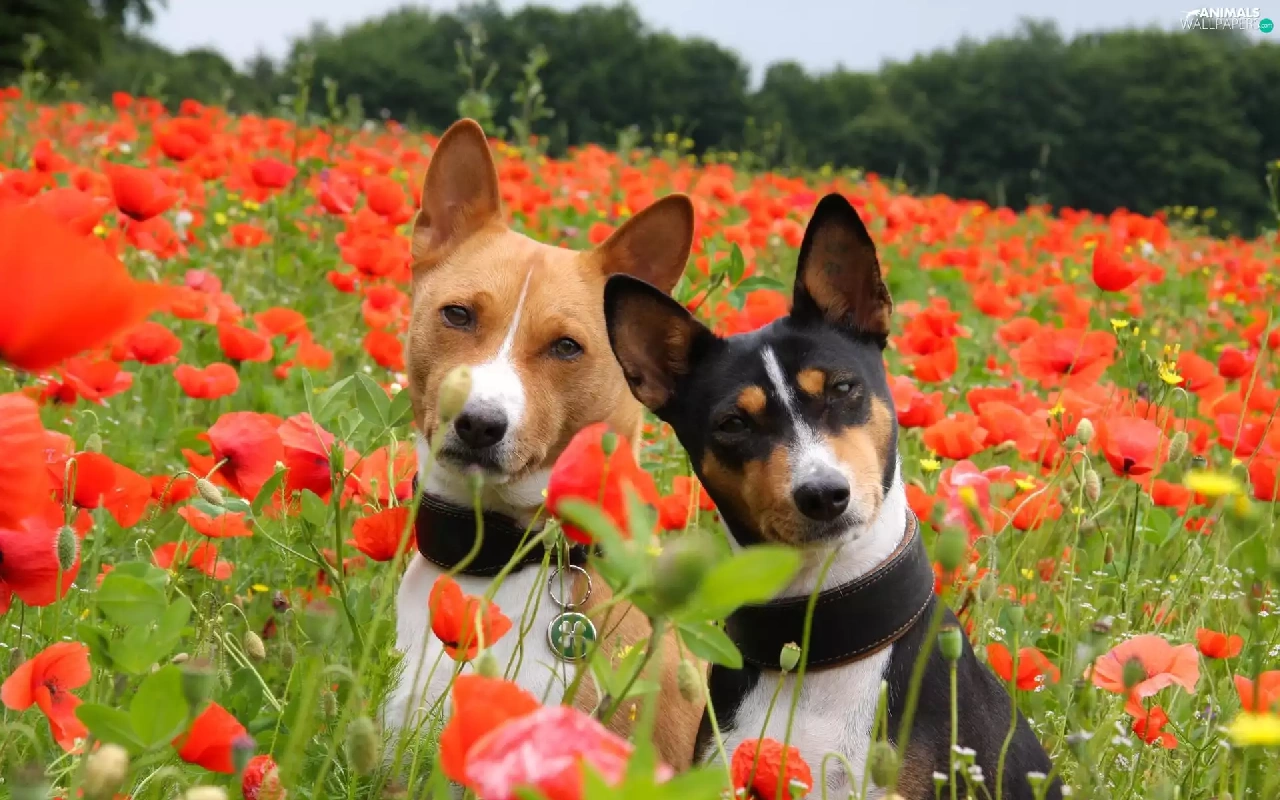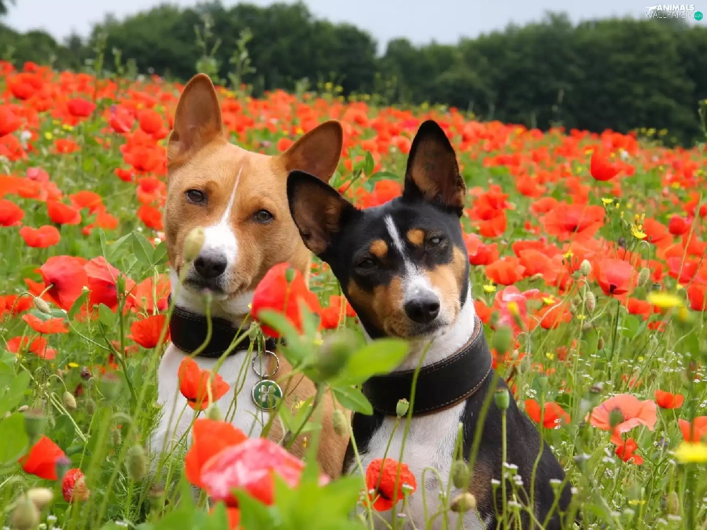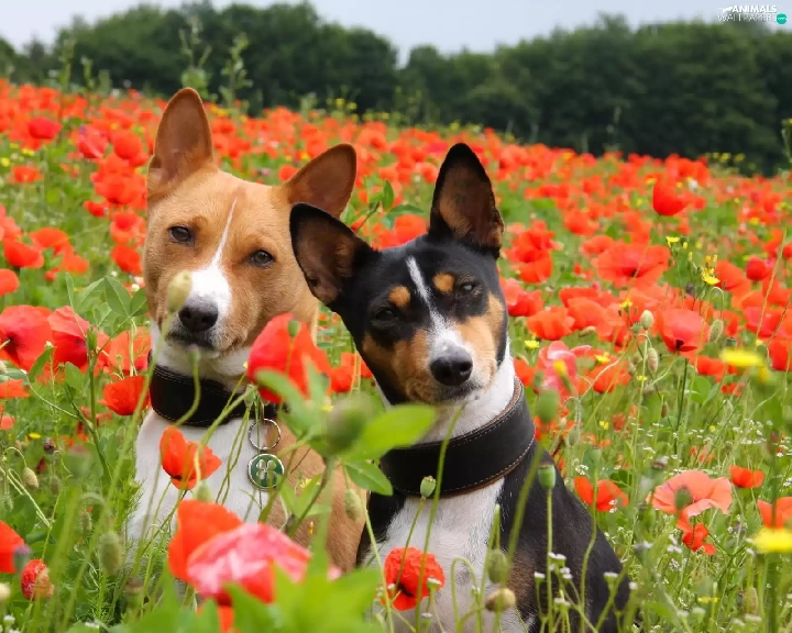 puppies, Basenji, papavers, Two cars, Meadow