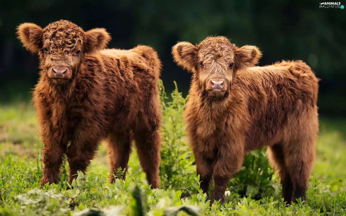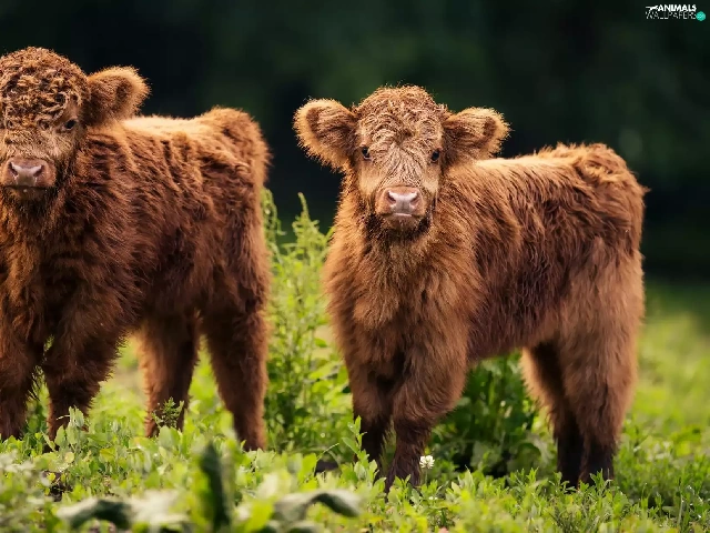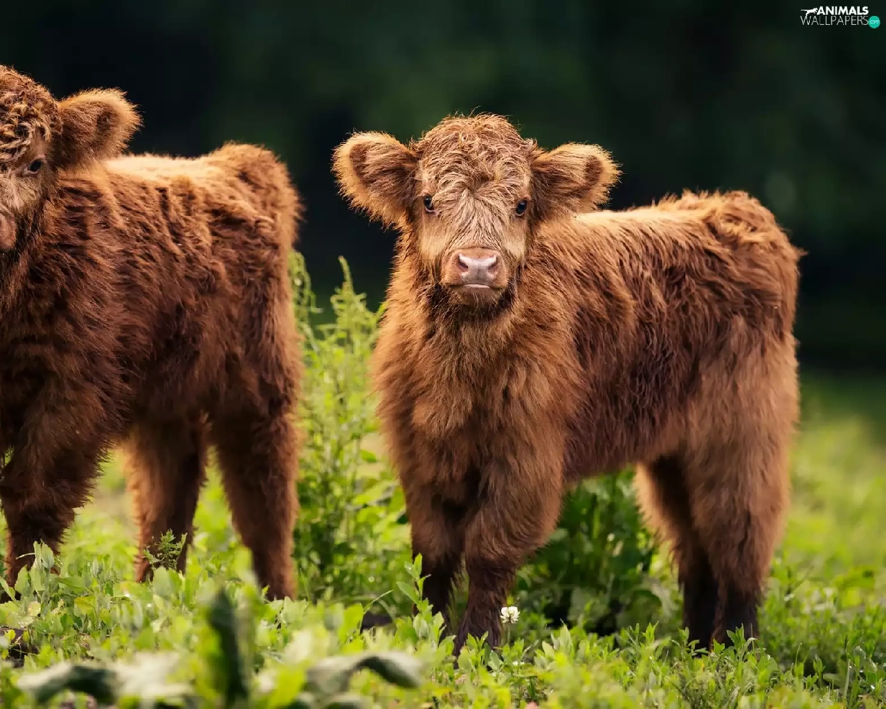 Scottish Highlander Race, Highland Cattle, young, Cows, Two