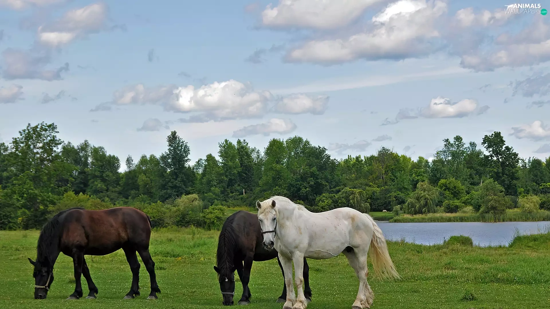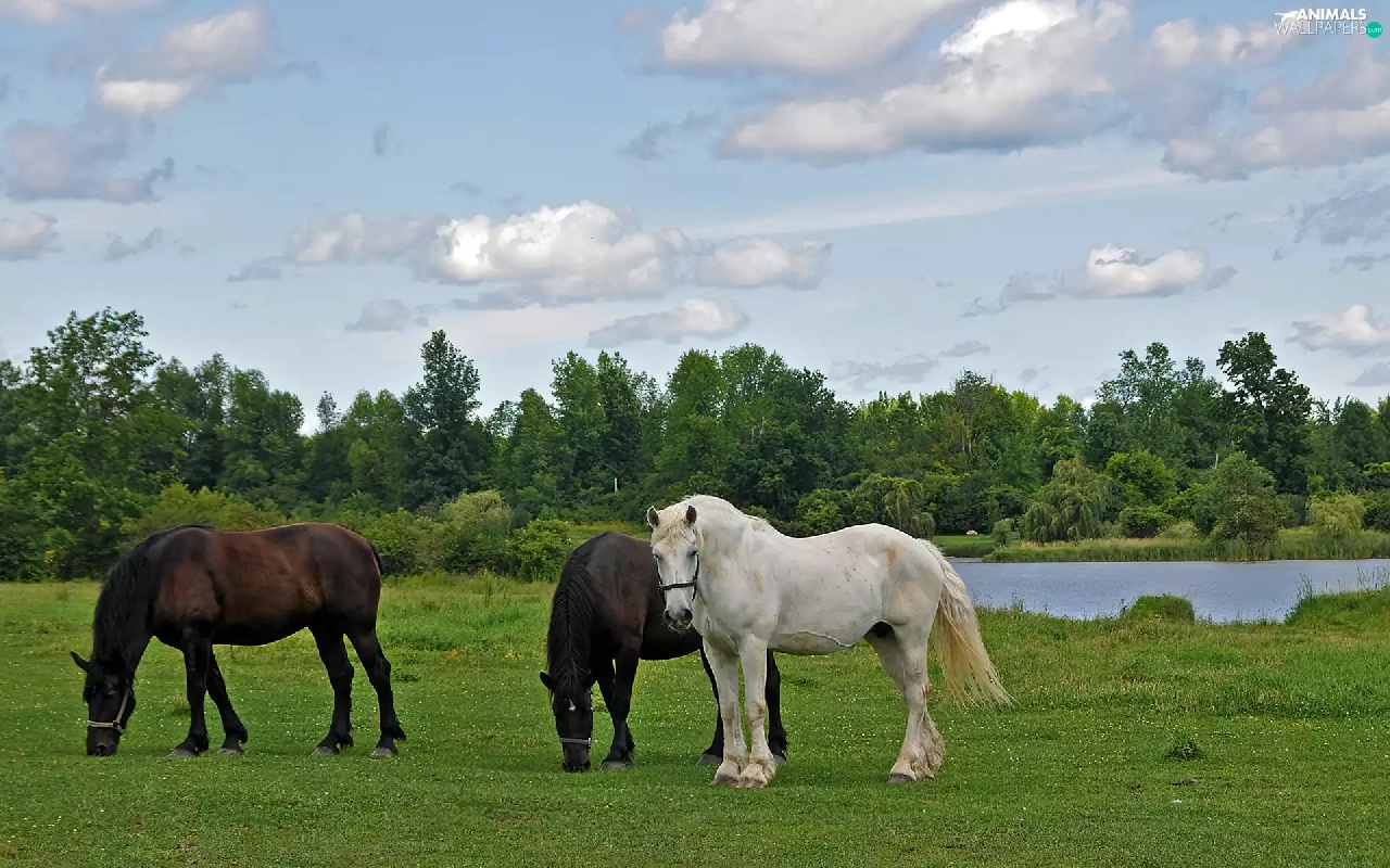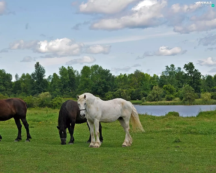 pasture, Three, trees, viewes, River, bloodstock