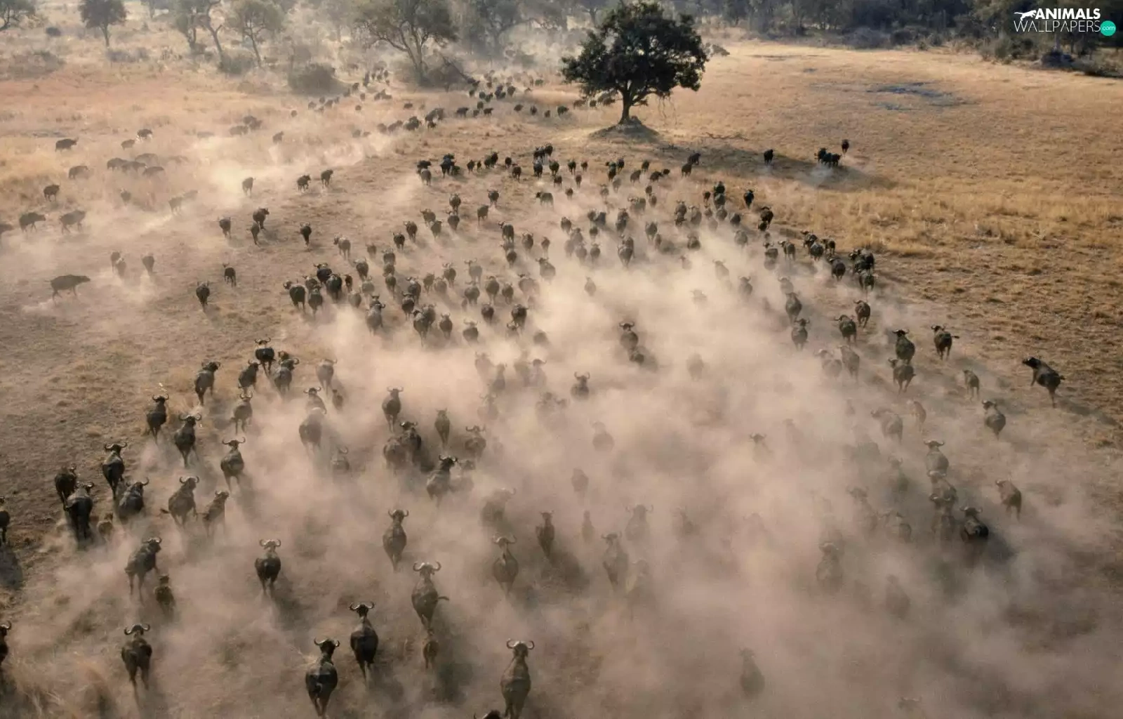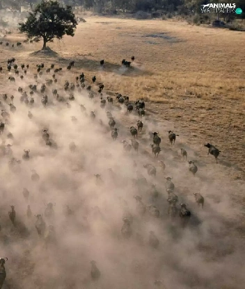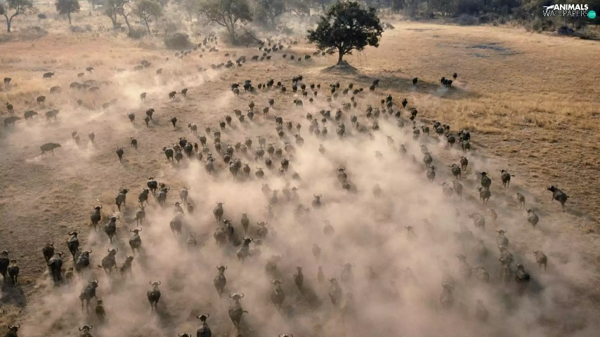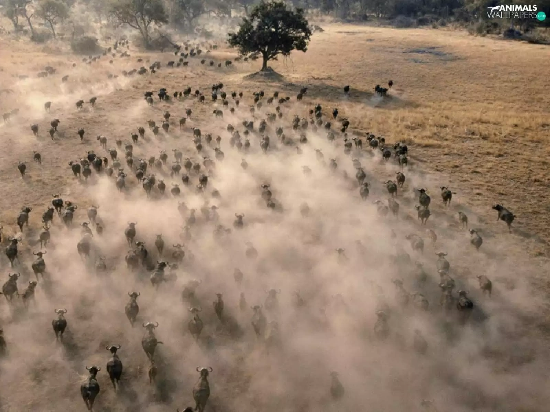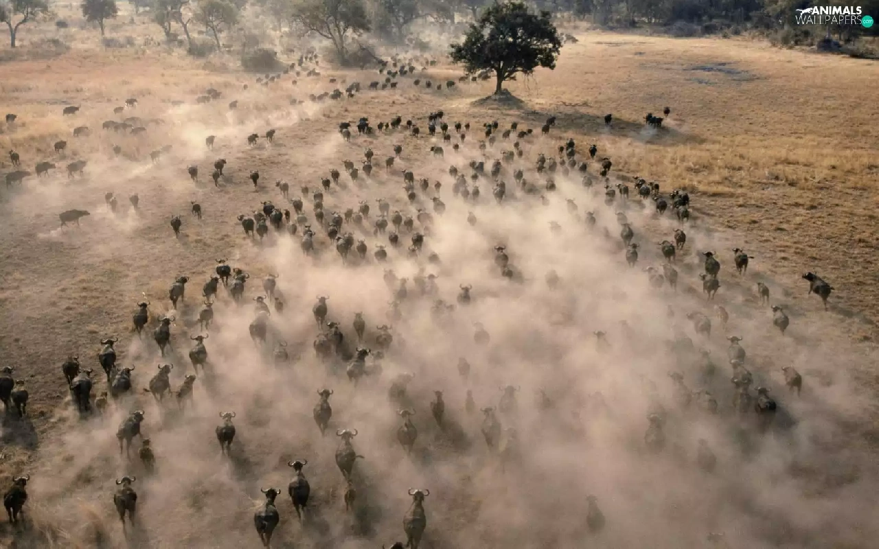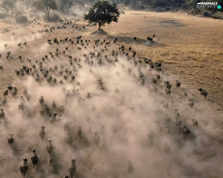 trees, viewes, Buffalo, savanna, herd