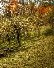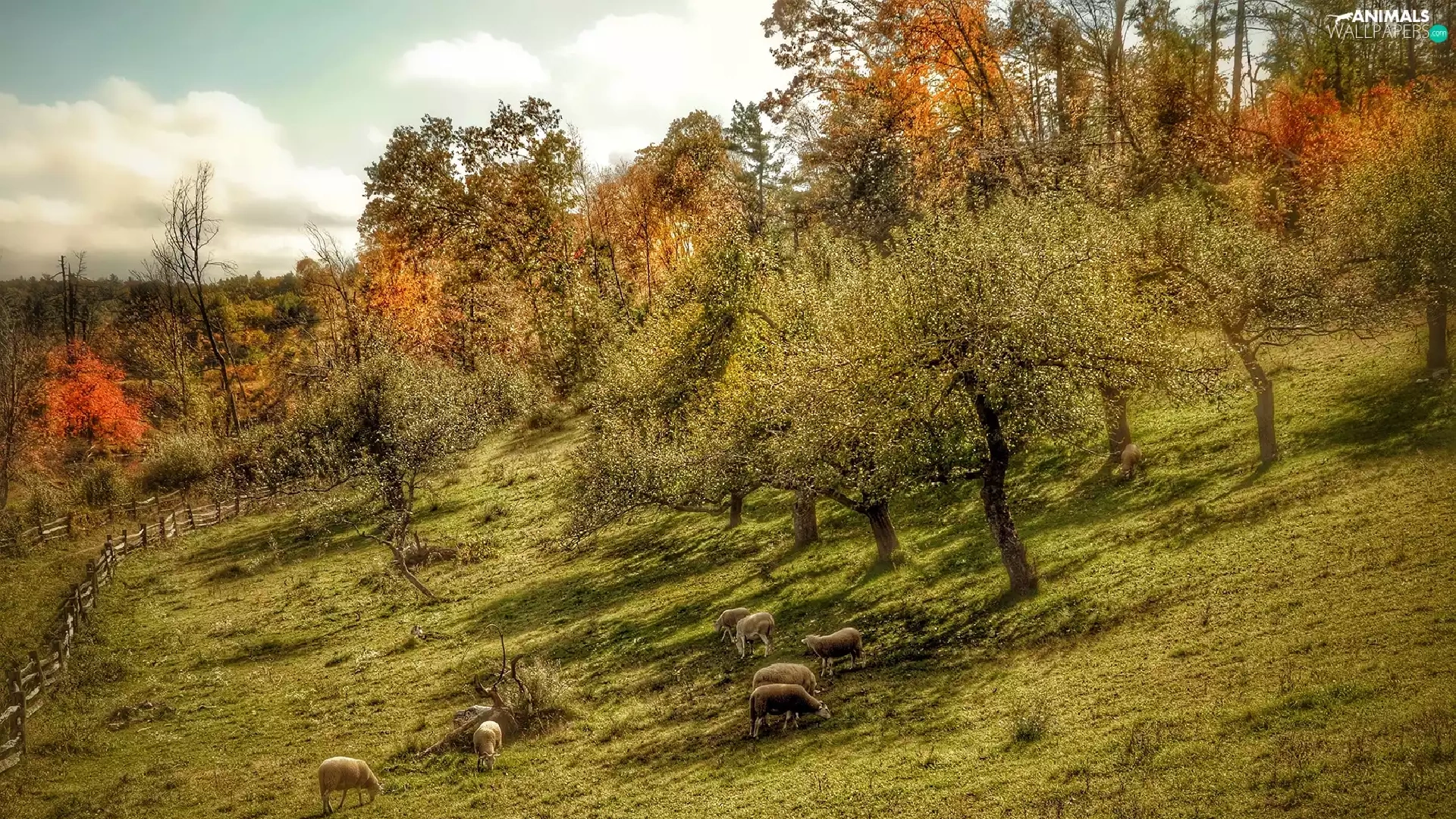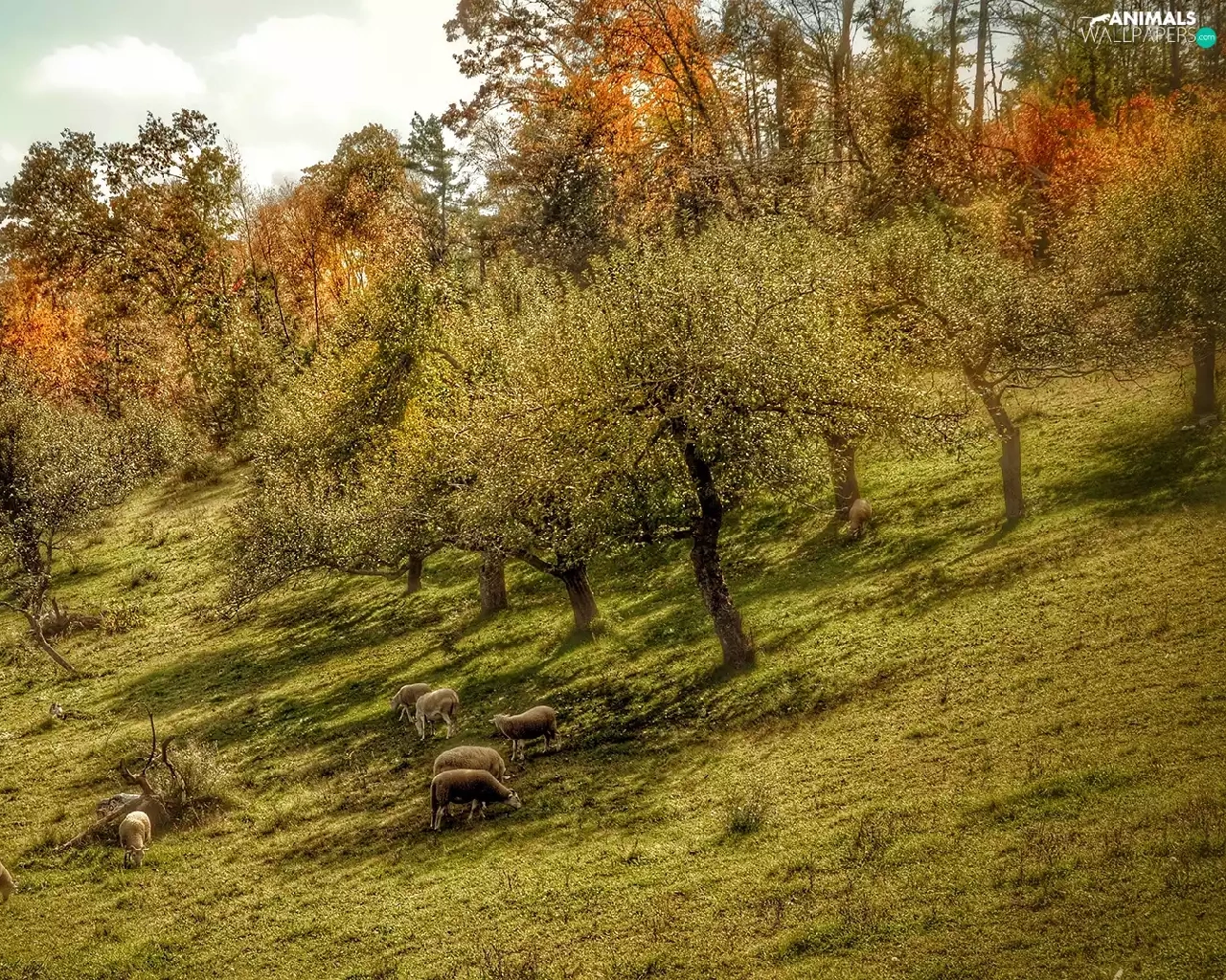 rams, trees, fence, viewes, Meadow, Sheep, Fance