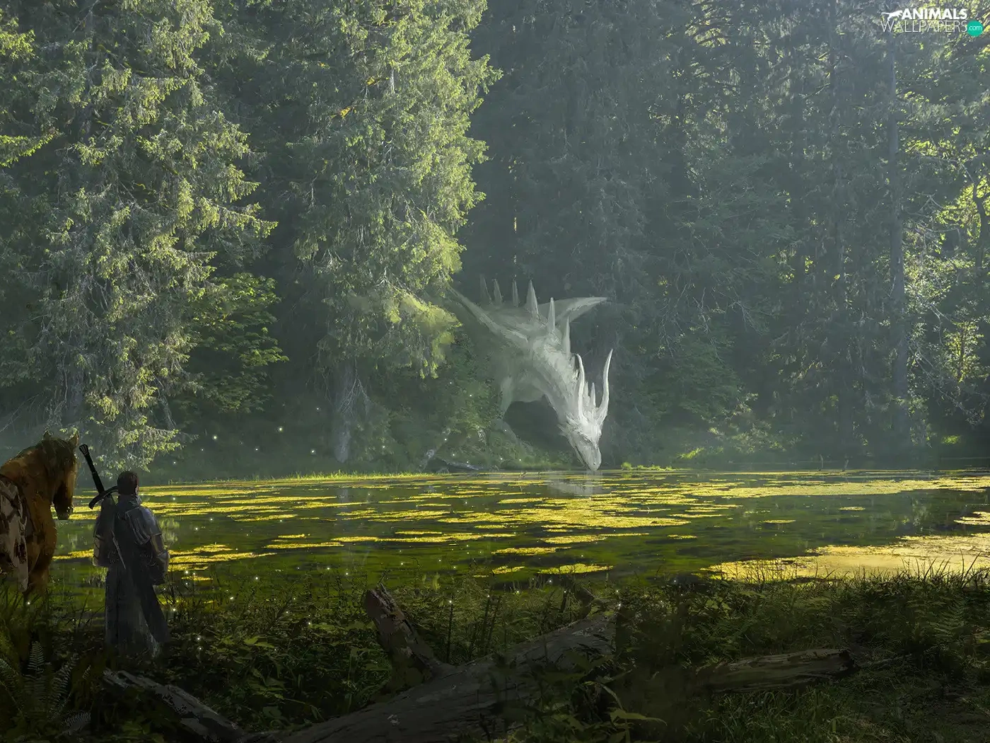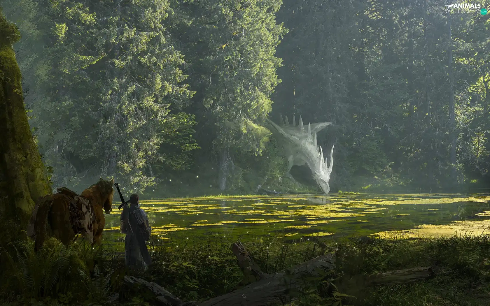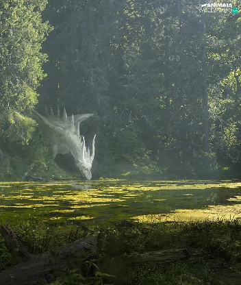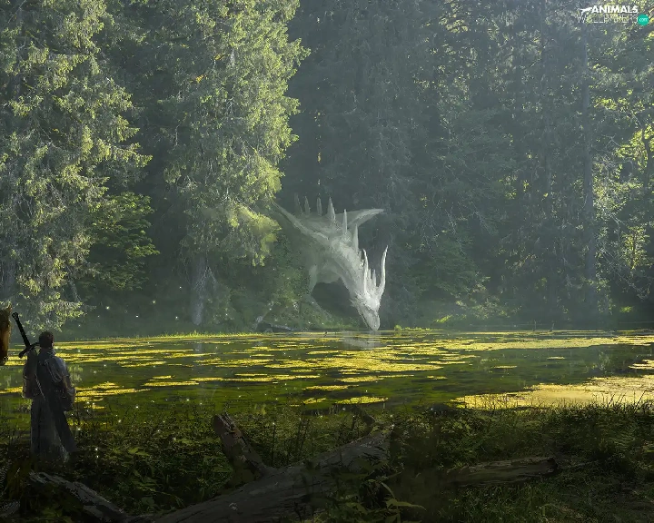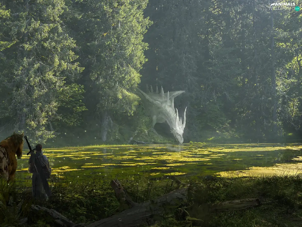 Dragon, trees, fighter, viewes, River, Horse, fantasy