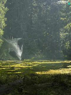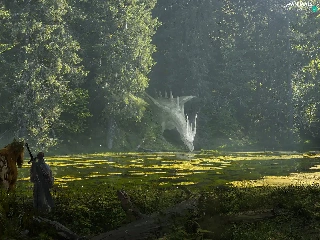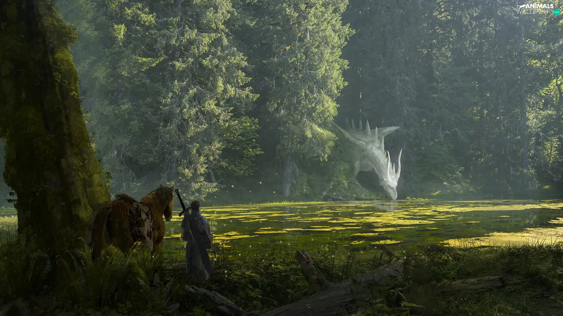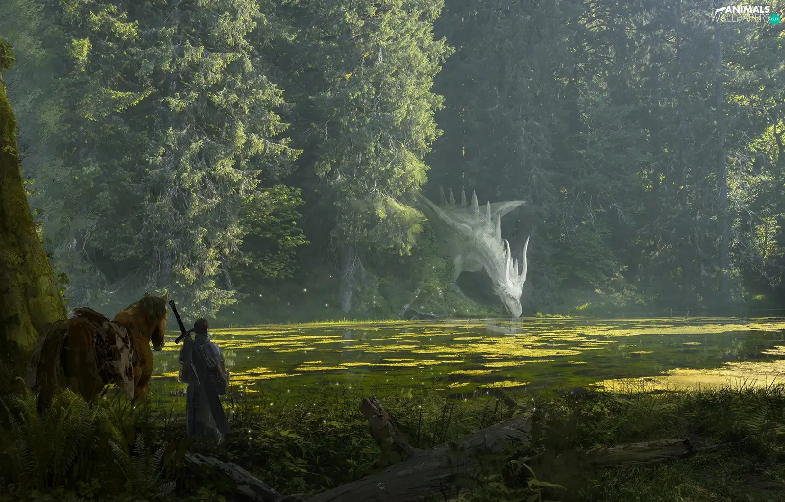Dragon, trees, fighter, viewes, River, Horse, fantasy