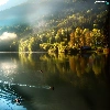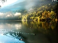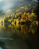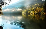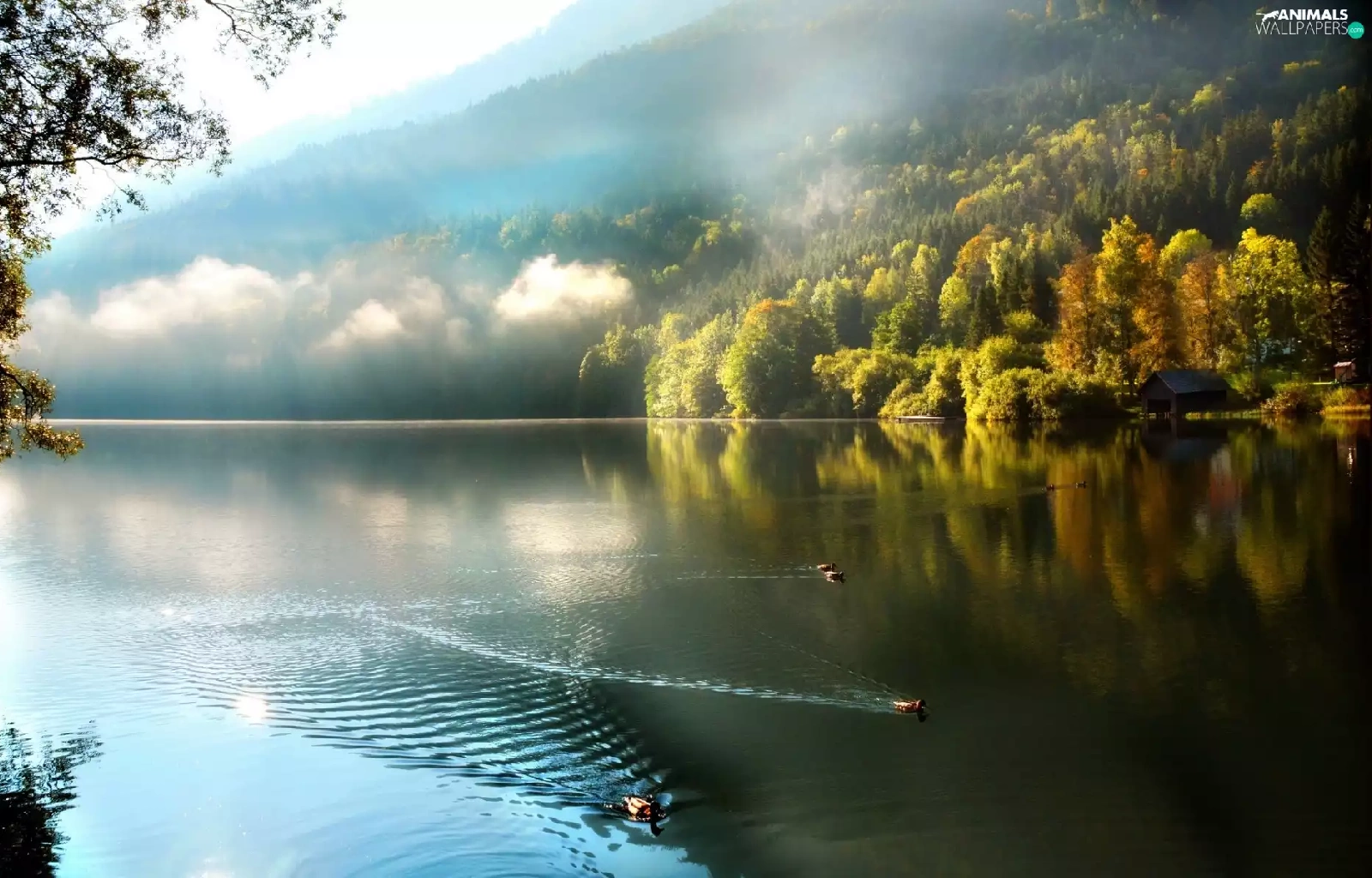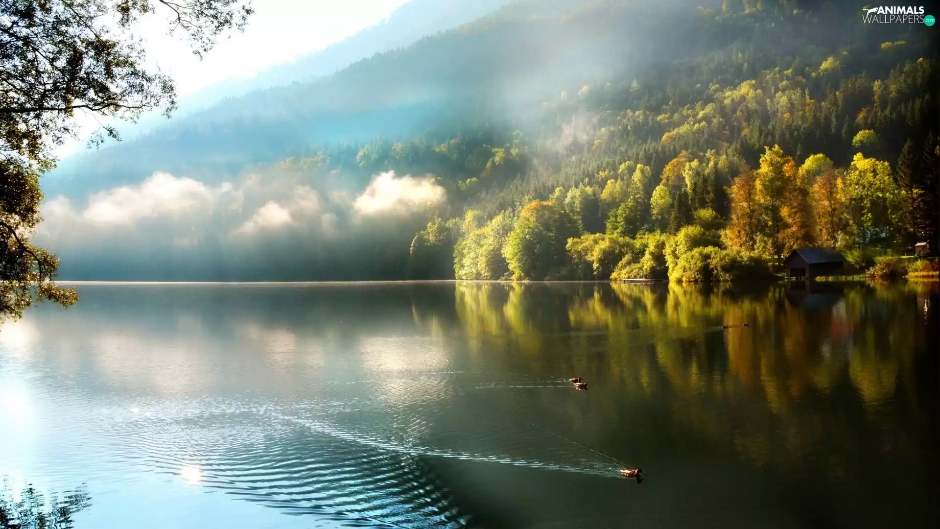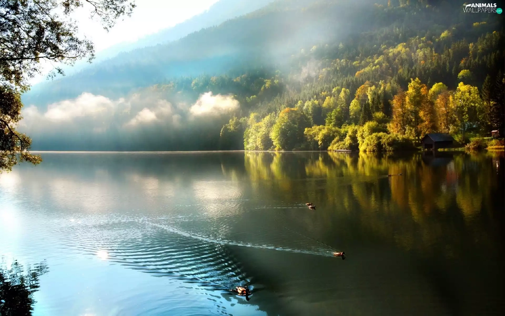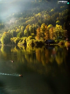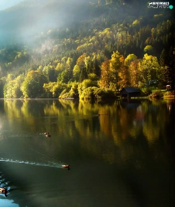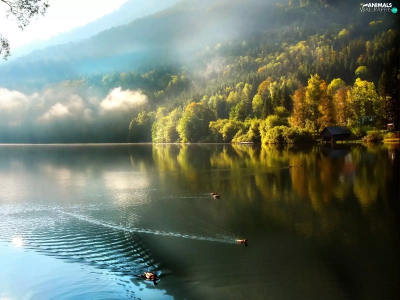trees, viewes, Fog, ducks, lake