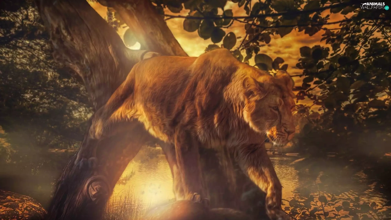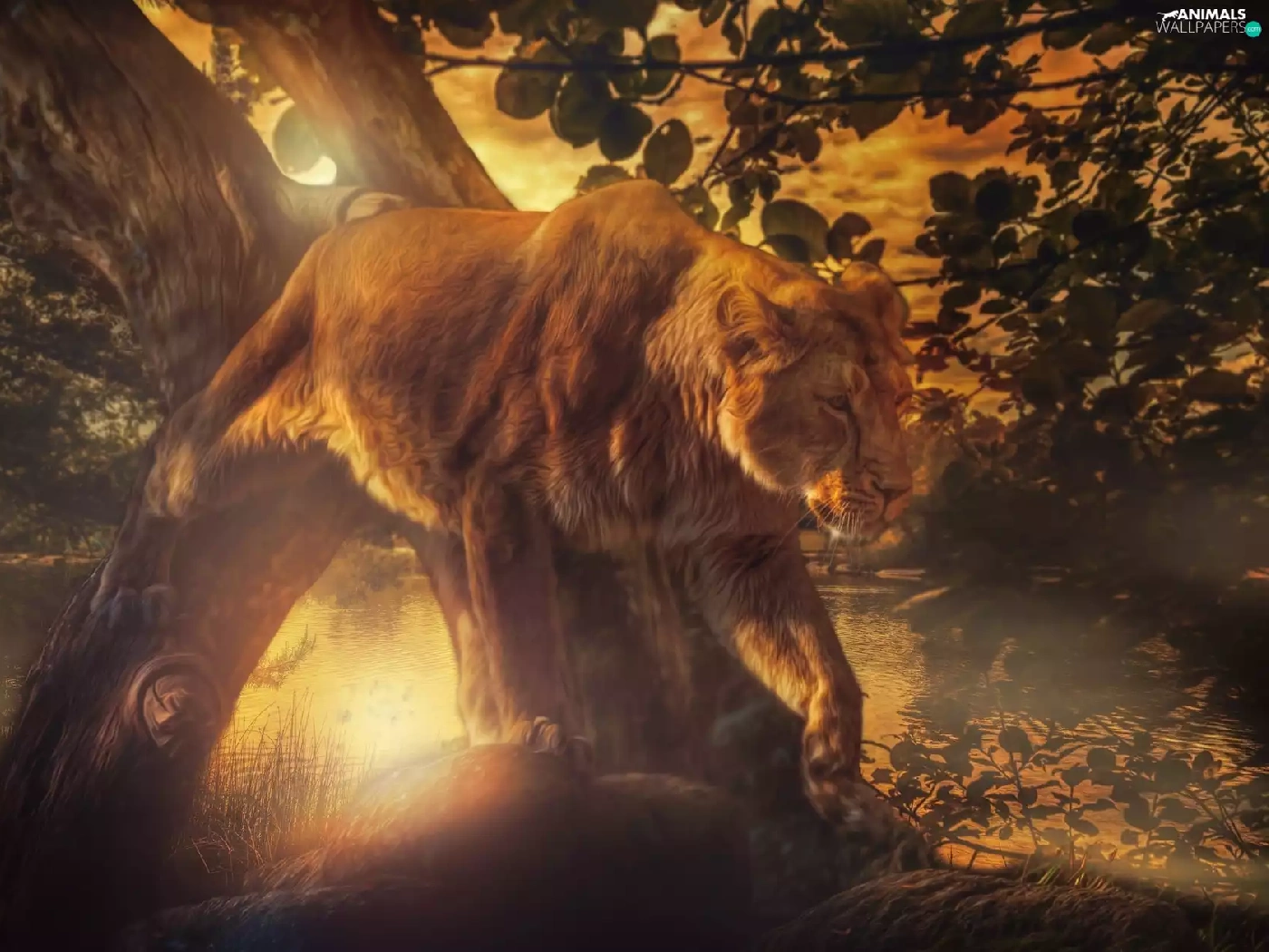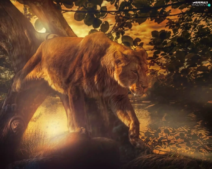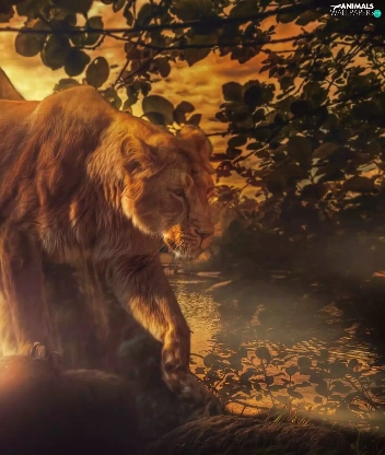 Lion, viewes, Great Sunsets, trees