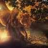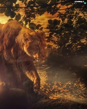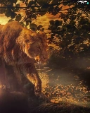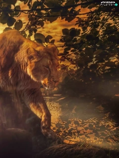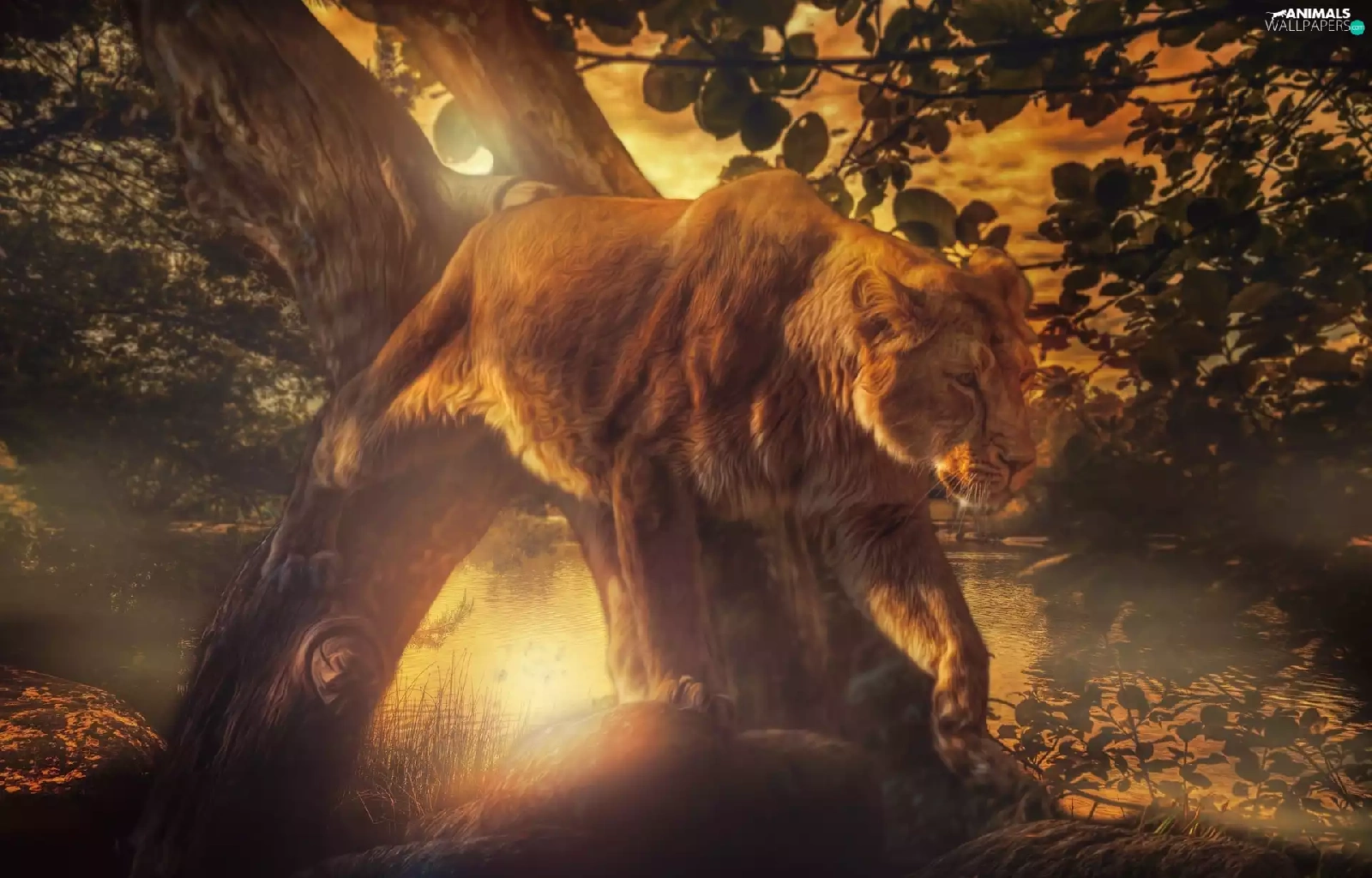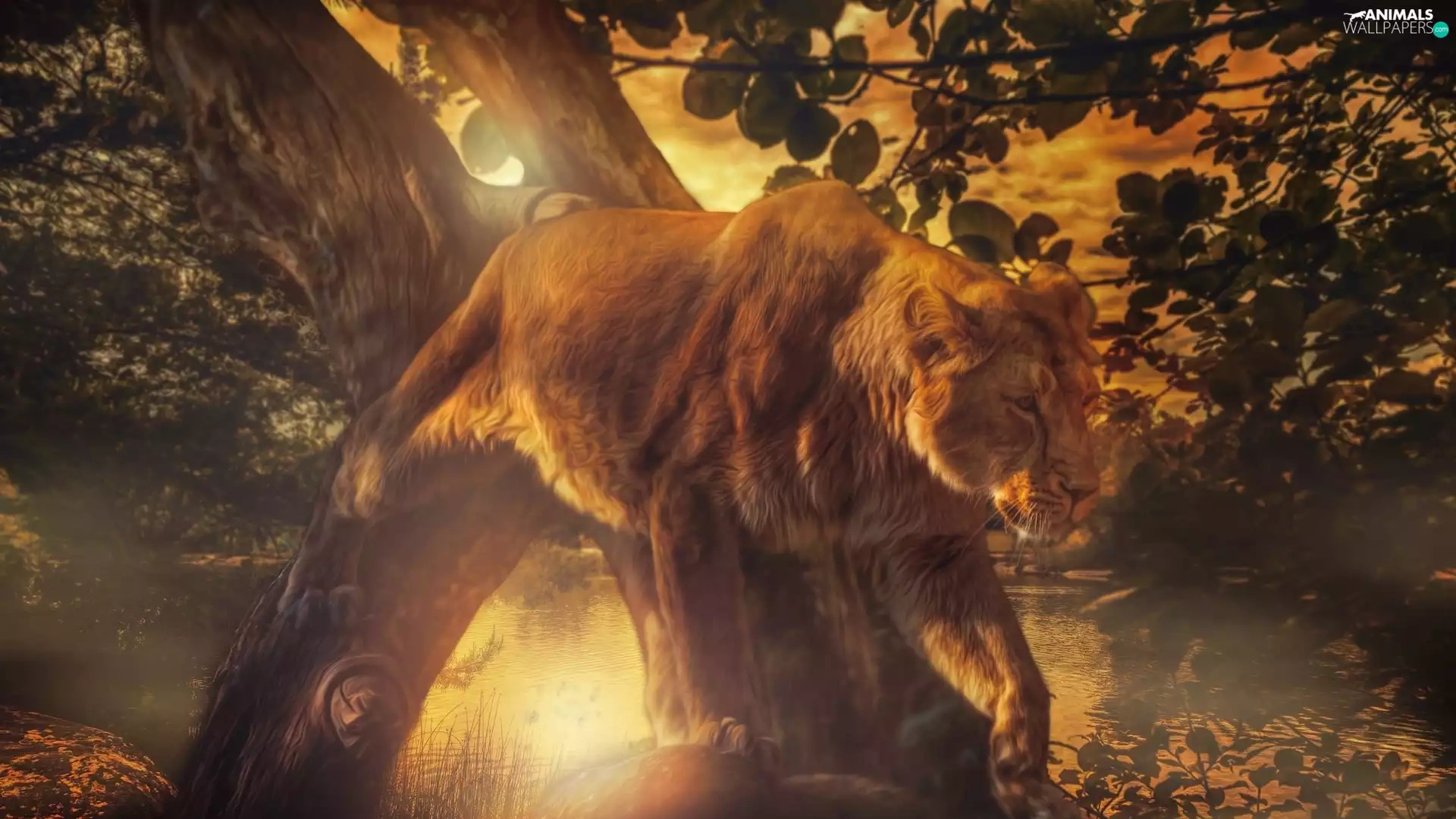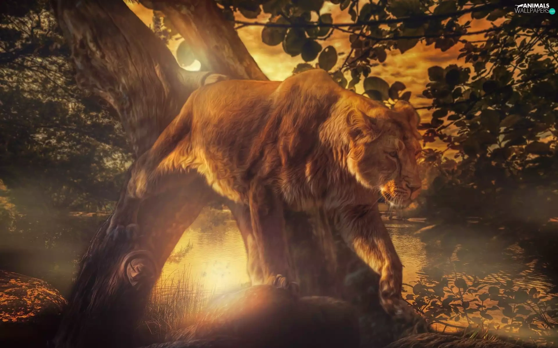 Lion, viewes, Great Sunsets, trees