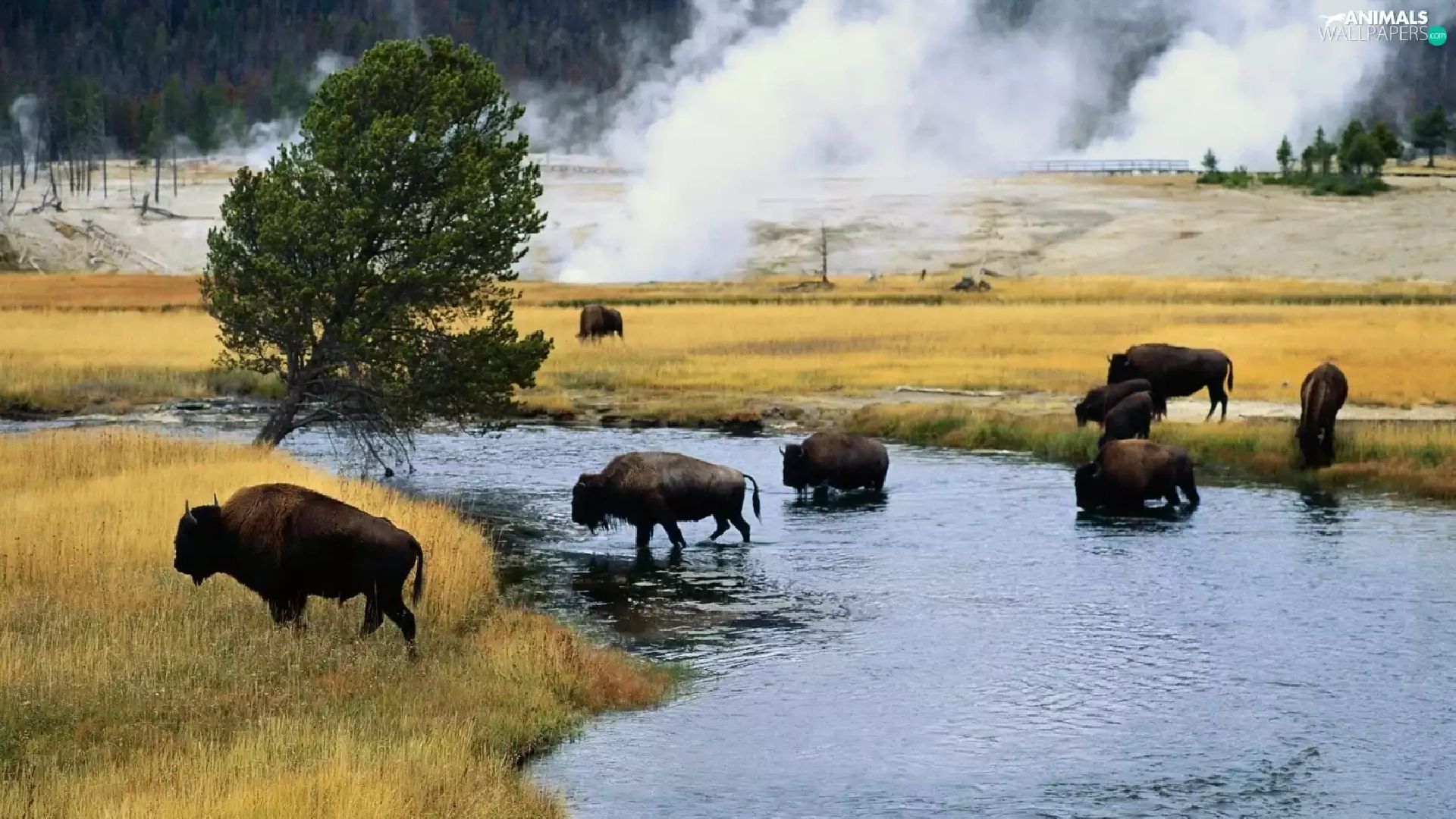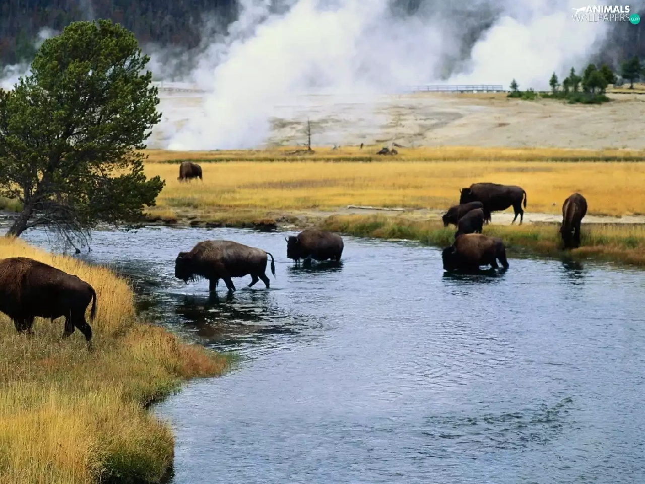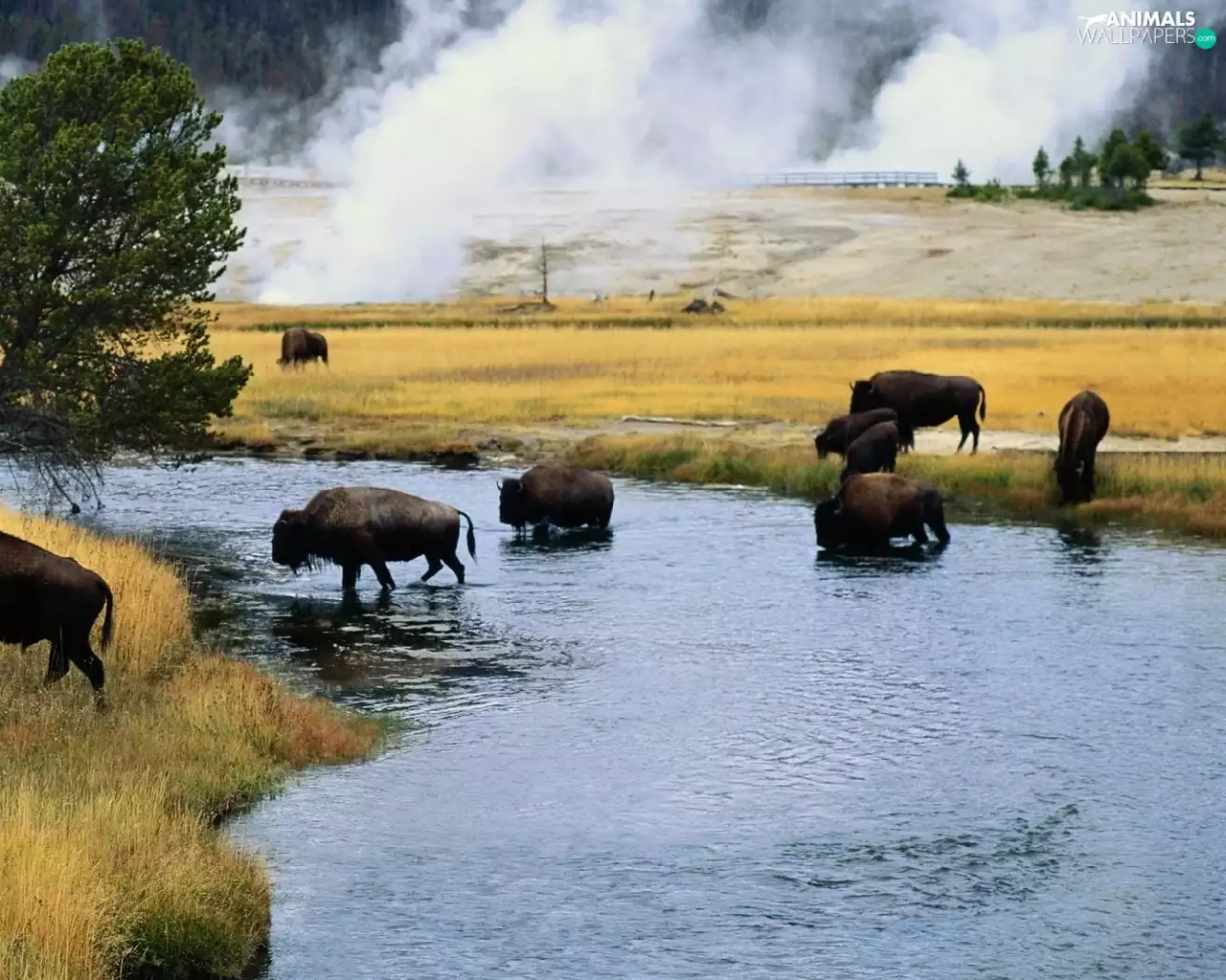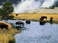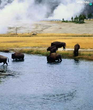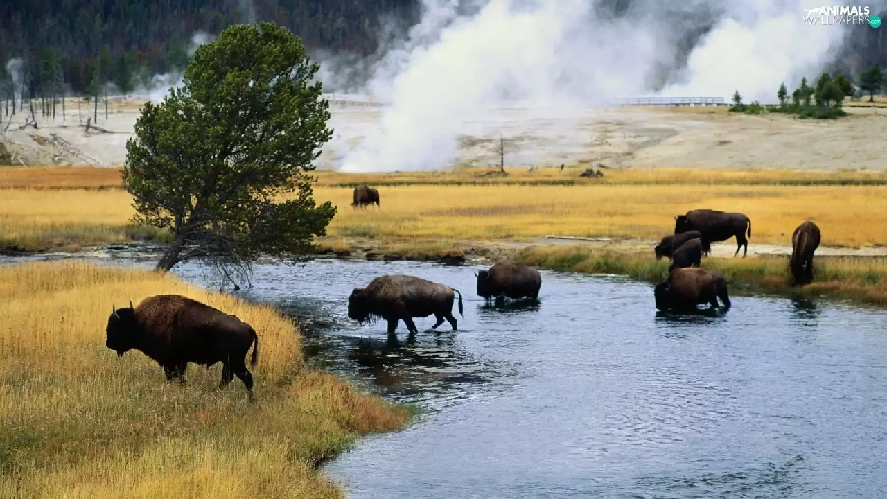 River, bison, trees, viewes, Meadow, herd