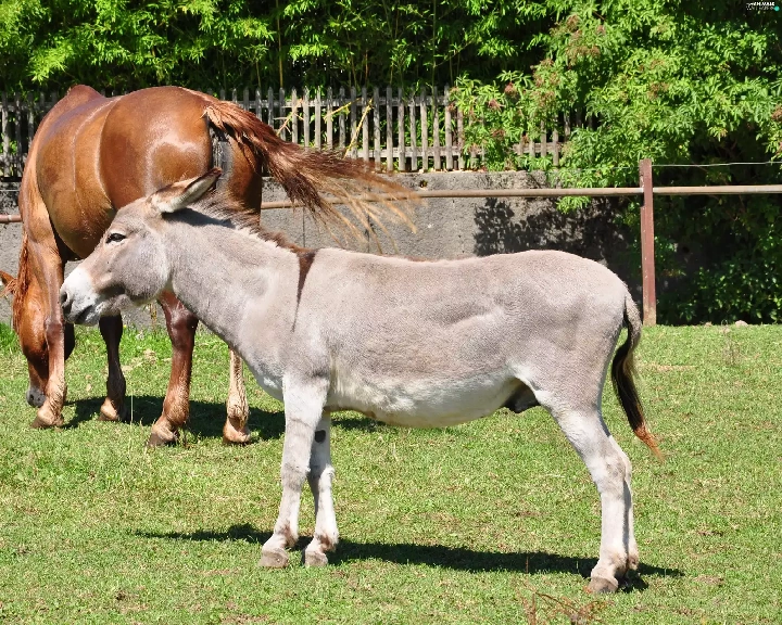 trees, viewes, Horse, grass, donkey