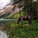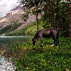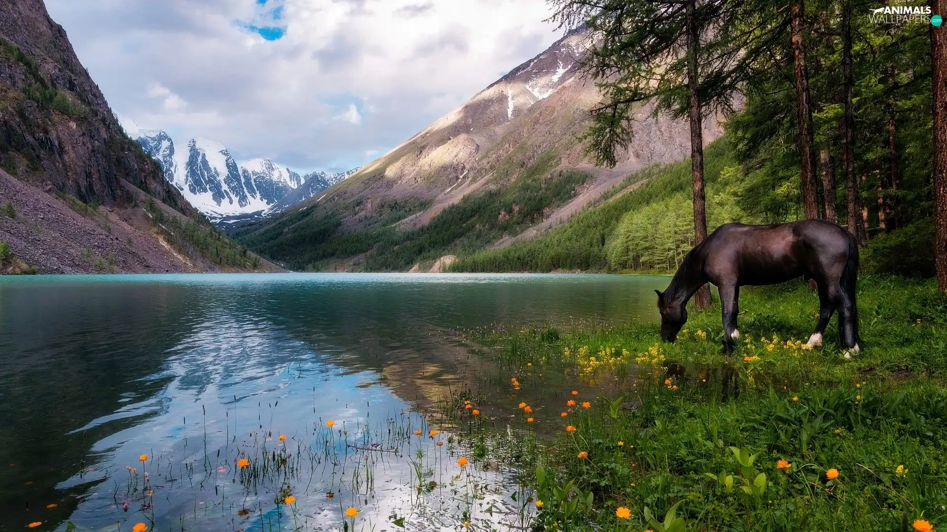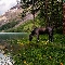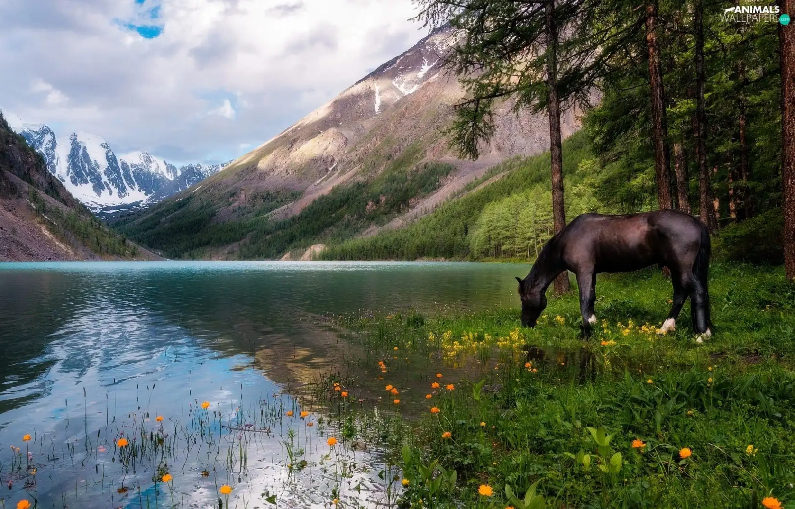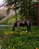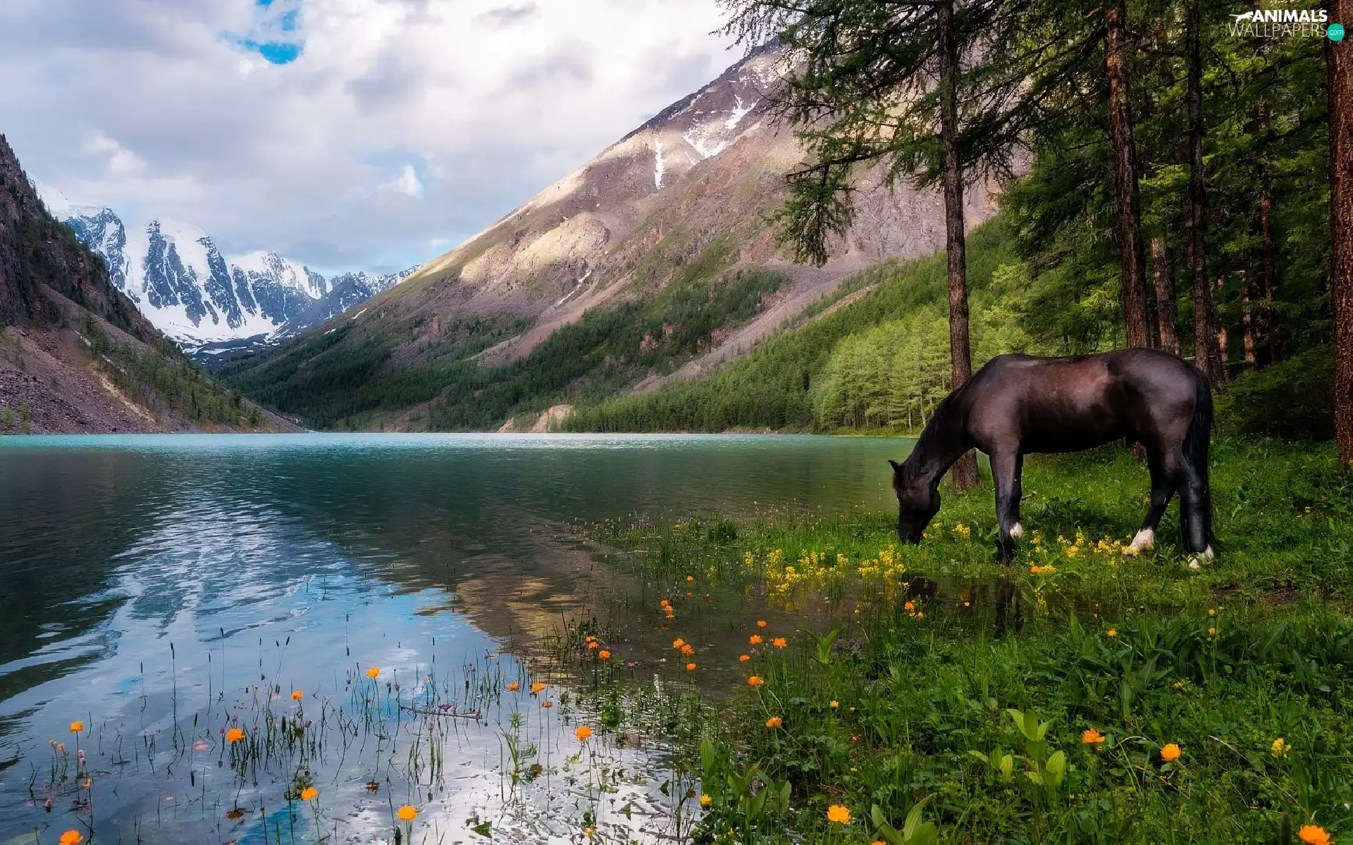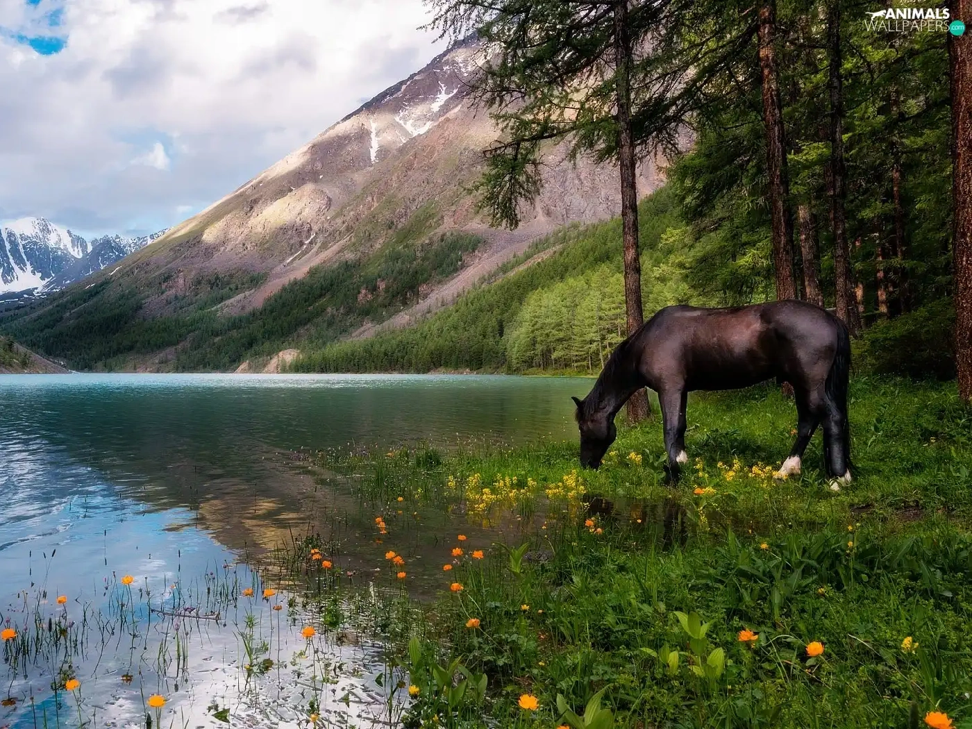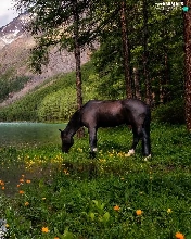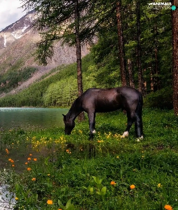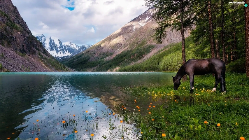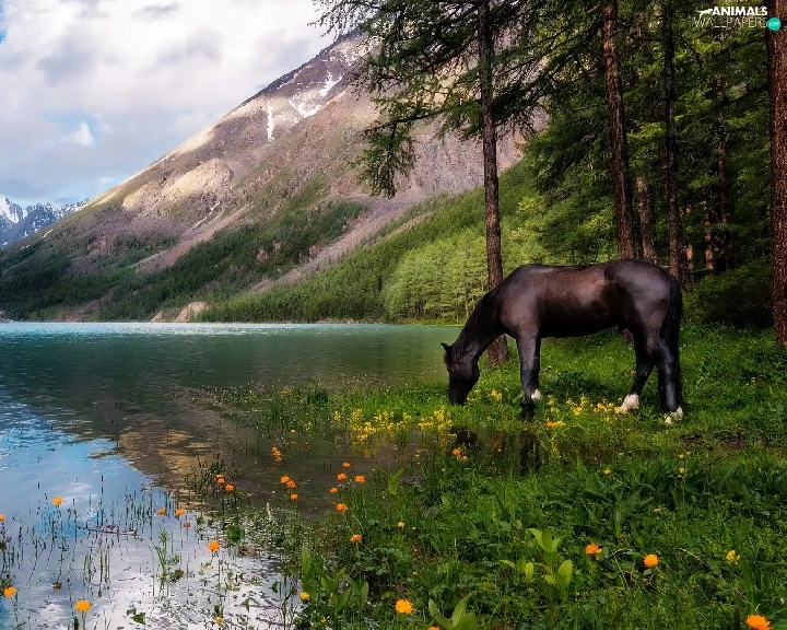 Horse, Mountains, trees, viewes, Flowers, lake