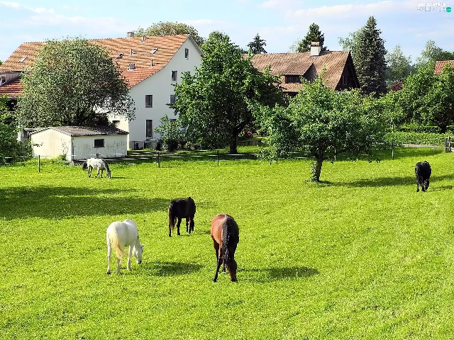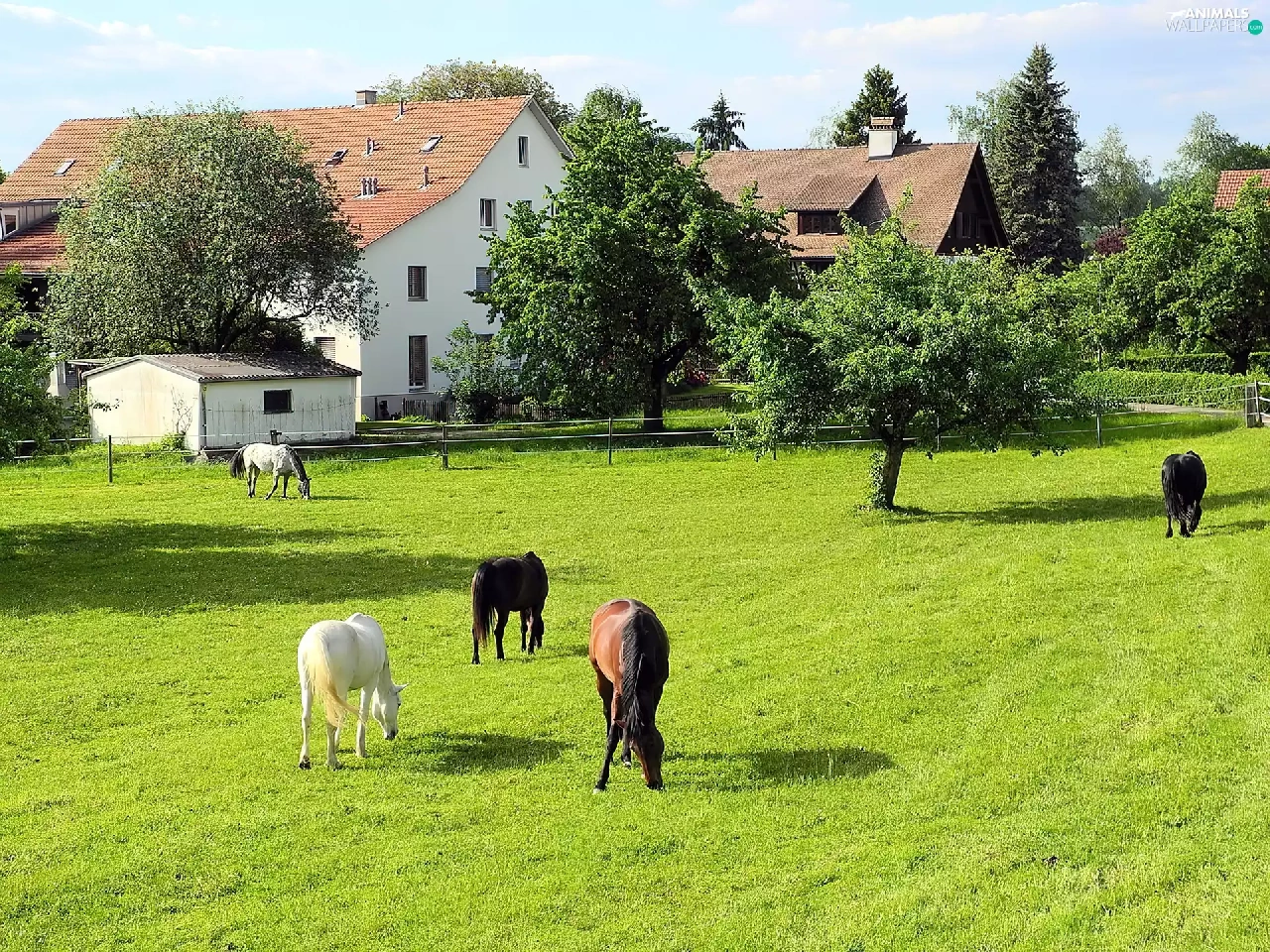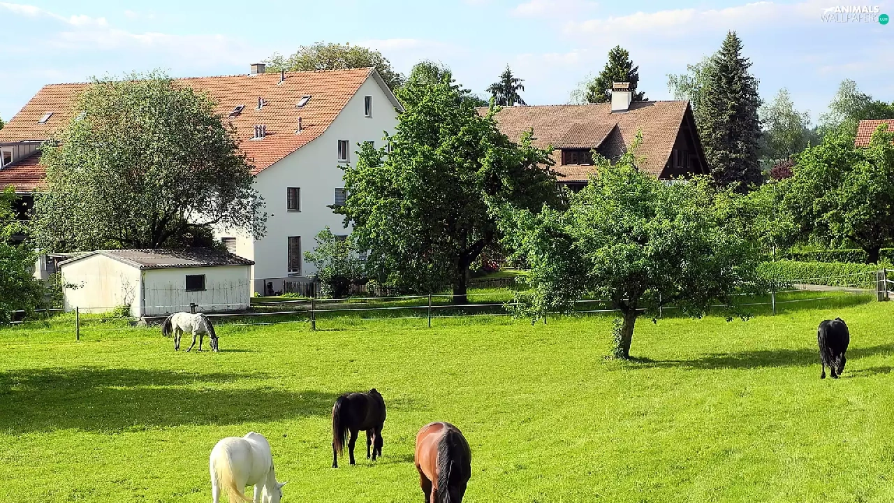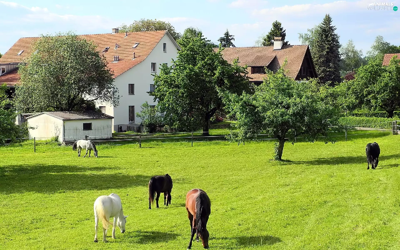 trees, viewes, Meadow, Houses, bloodstock