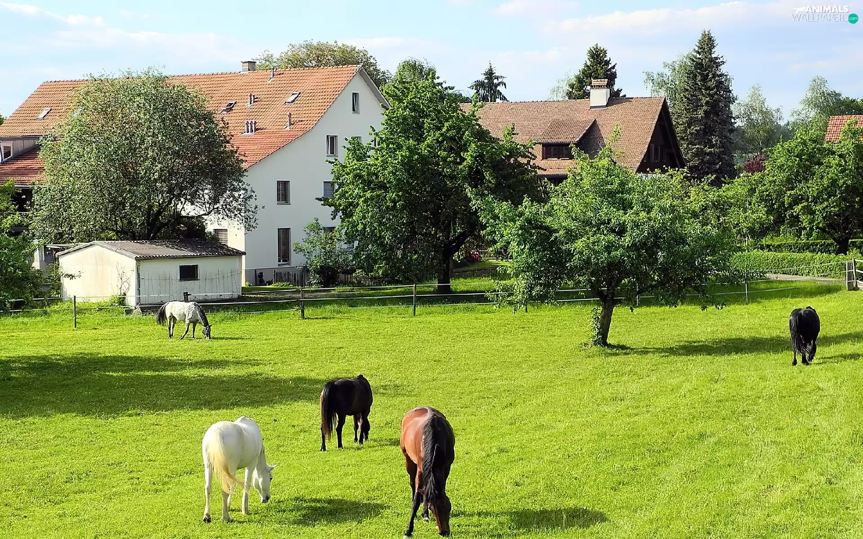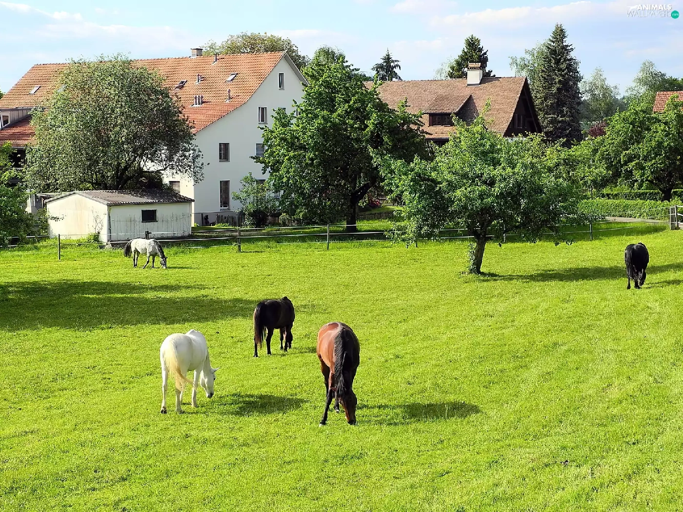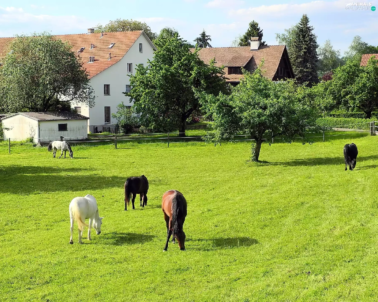 trees, viewes, Meadow, Houses, bloodstock