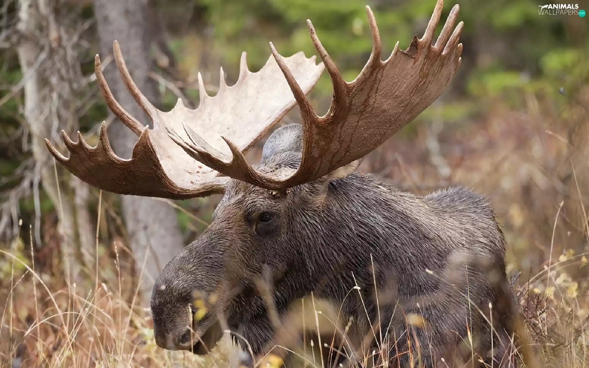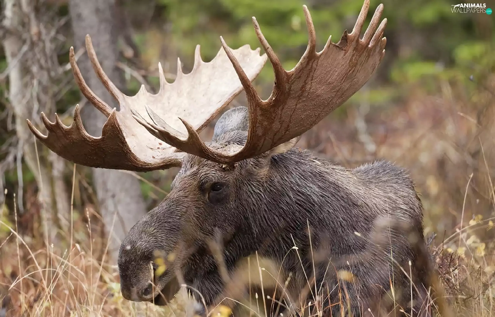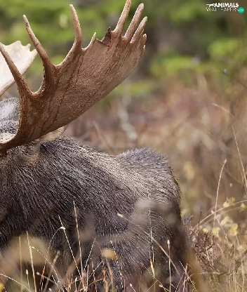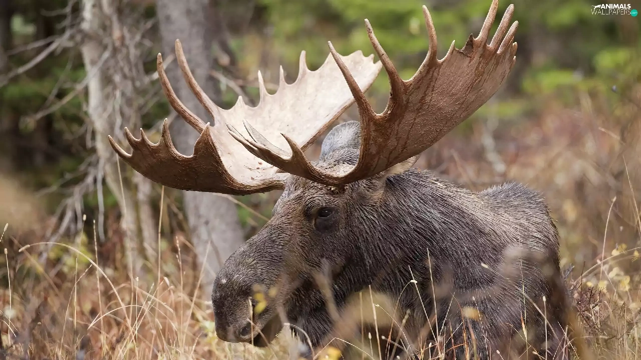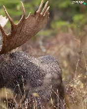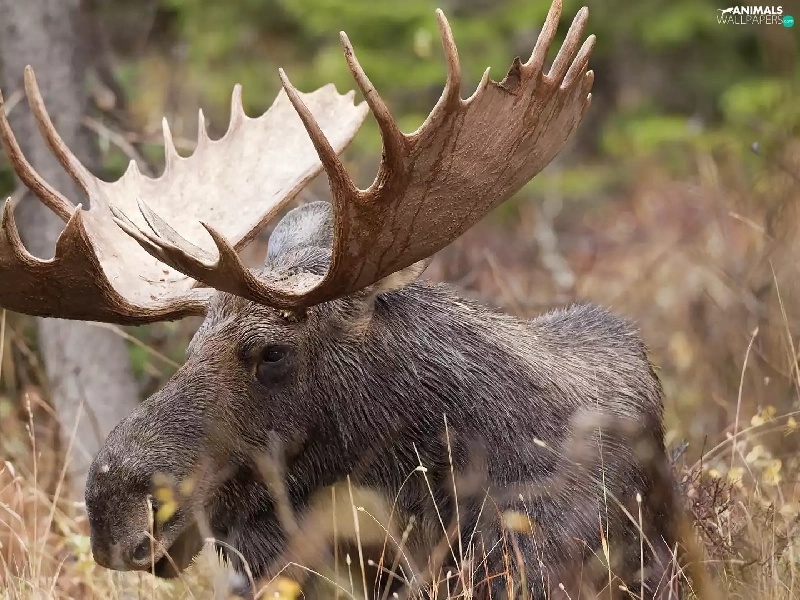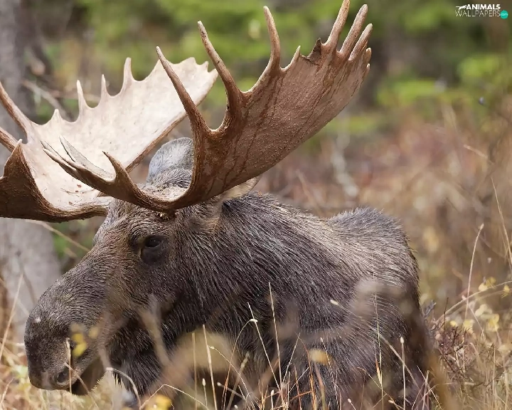antlers, Eurasian Moose, viewes, Plants, trees, head