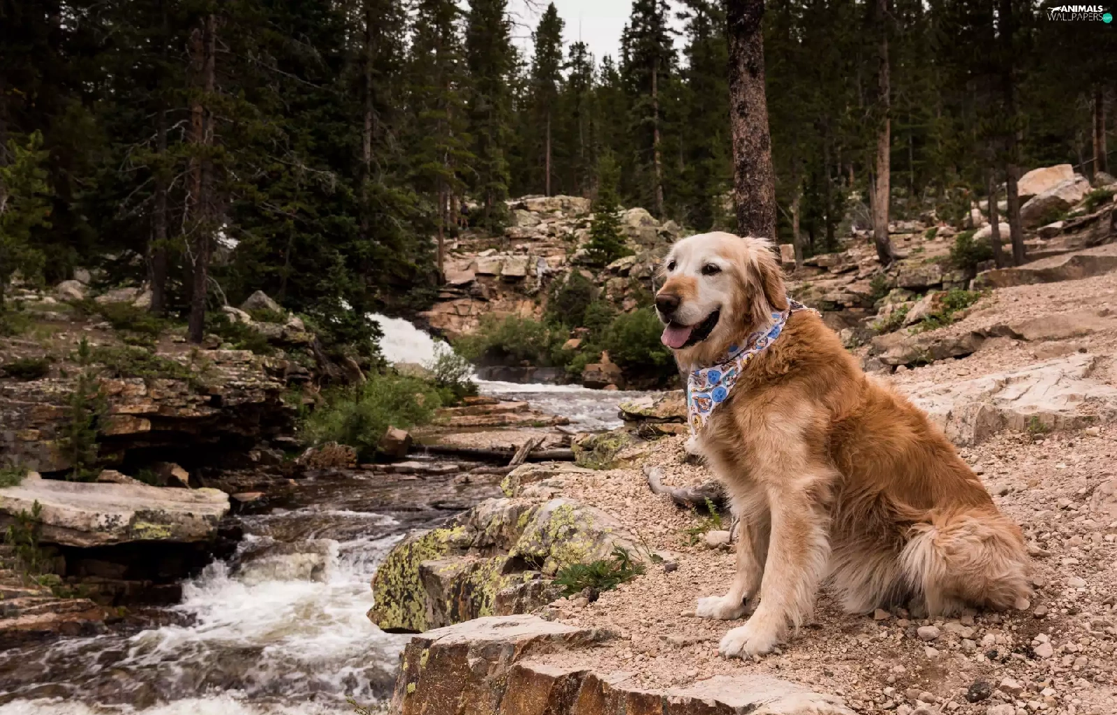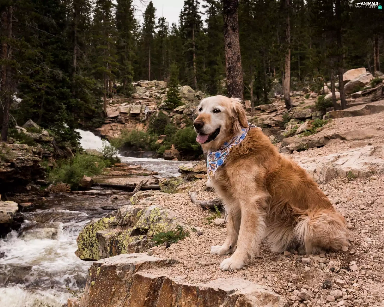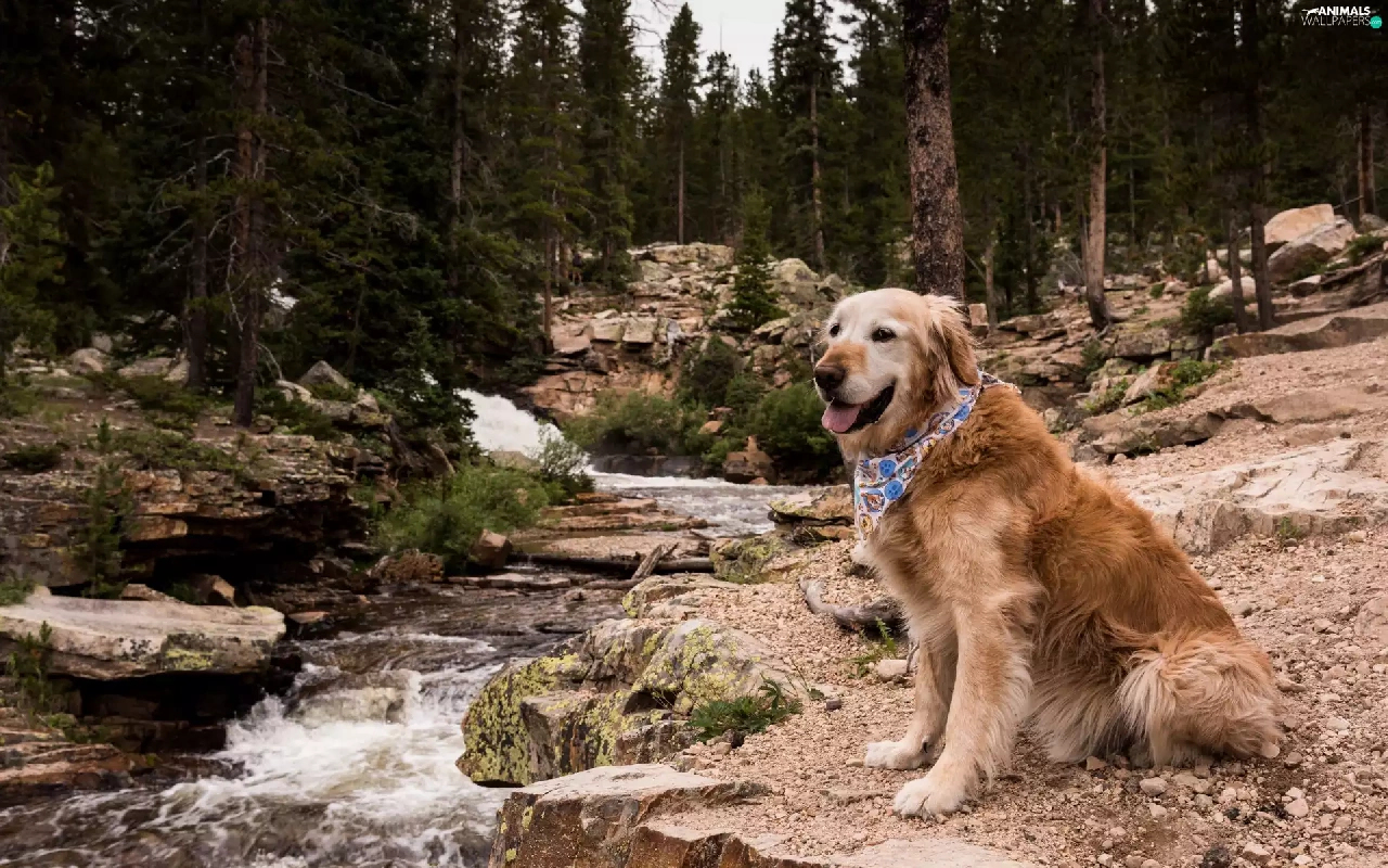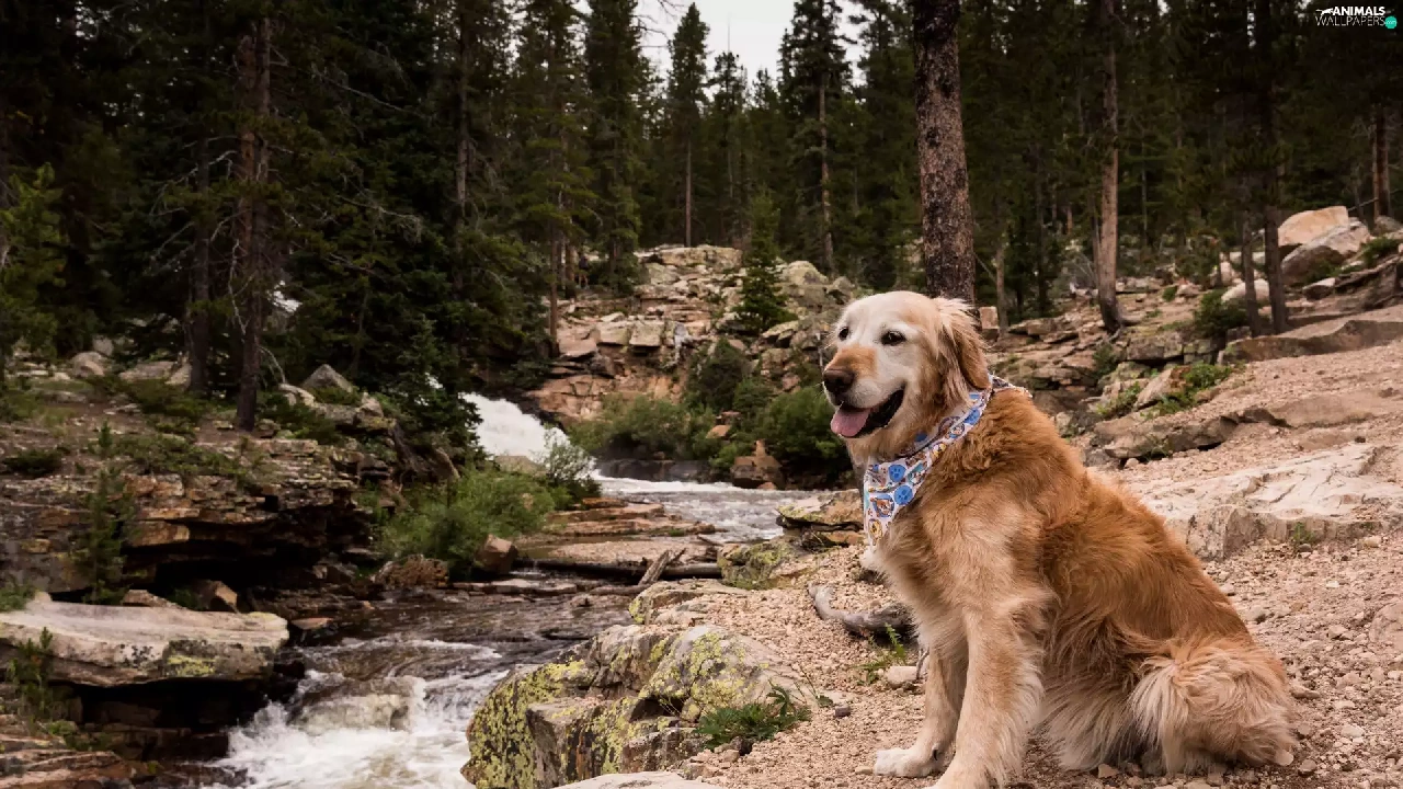 Stones, Golden Retriever, trees, River, dog, forest, viewes