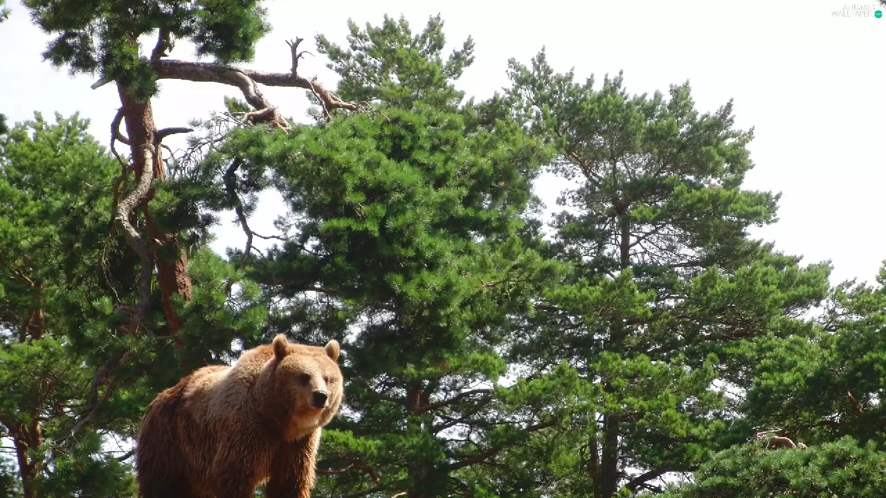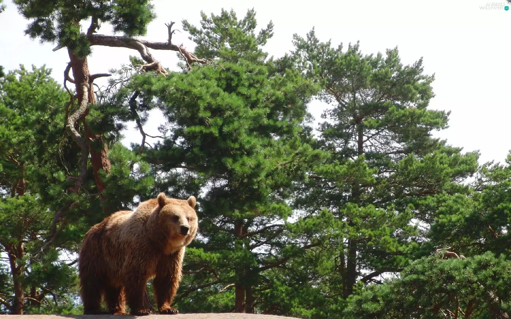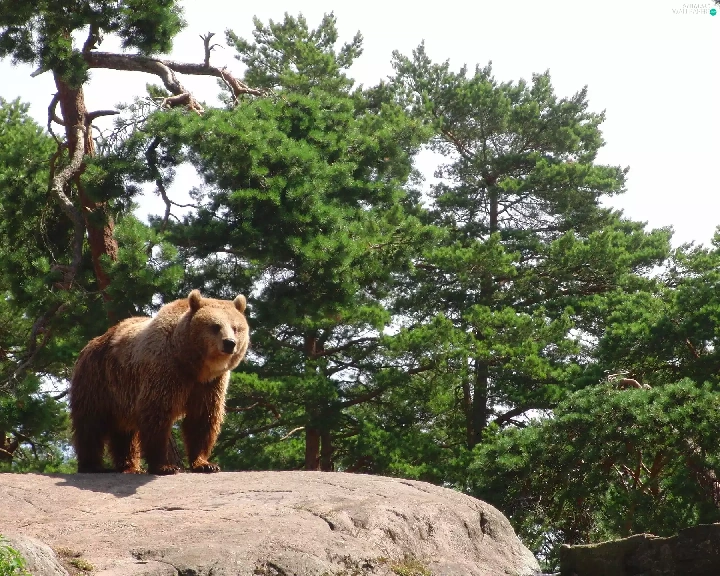 trees, viewes, Rocks, forest, Bear