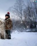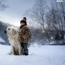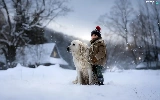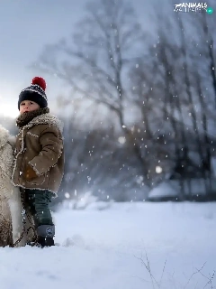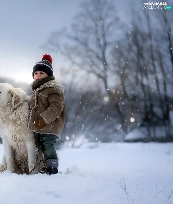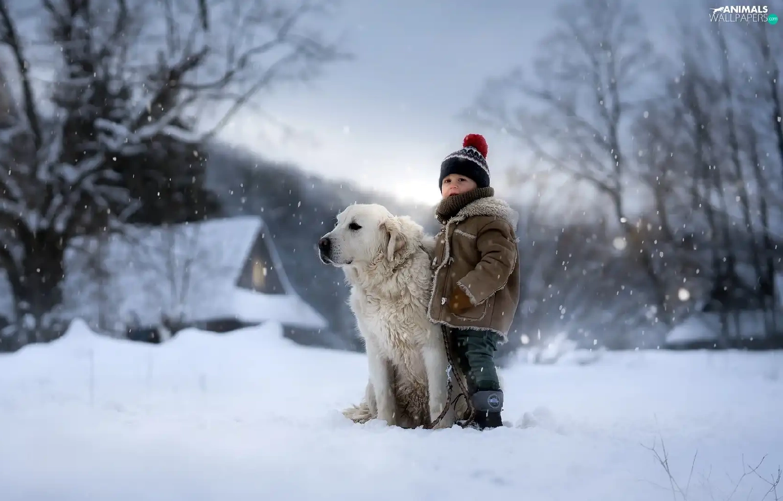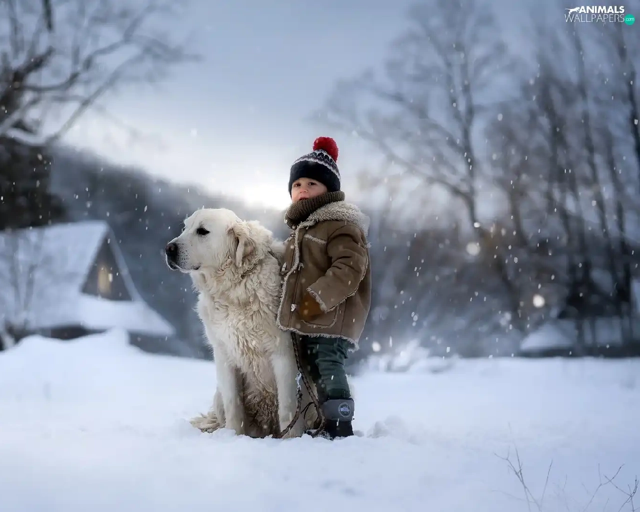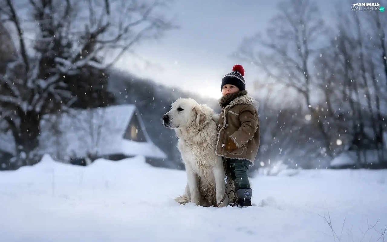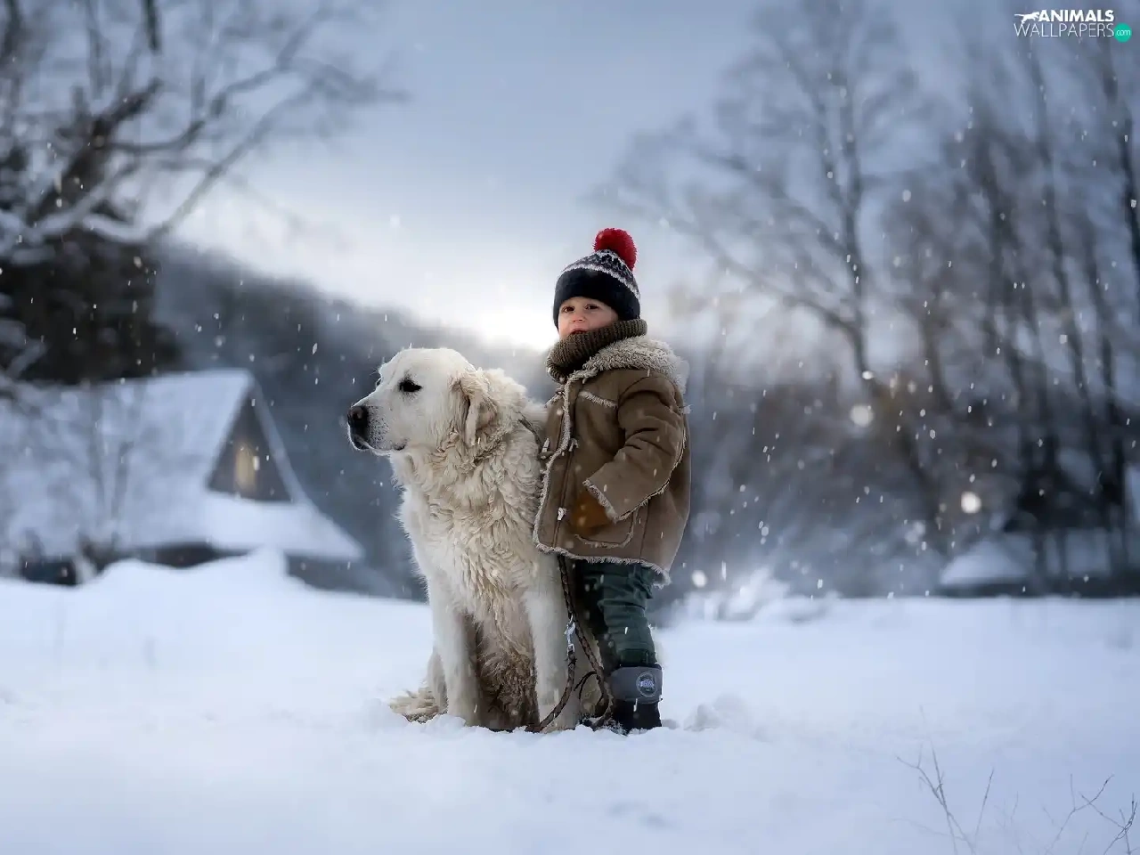 winter, Tatra Sheepdog, trees, Kid, dog, house, viewes