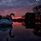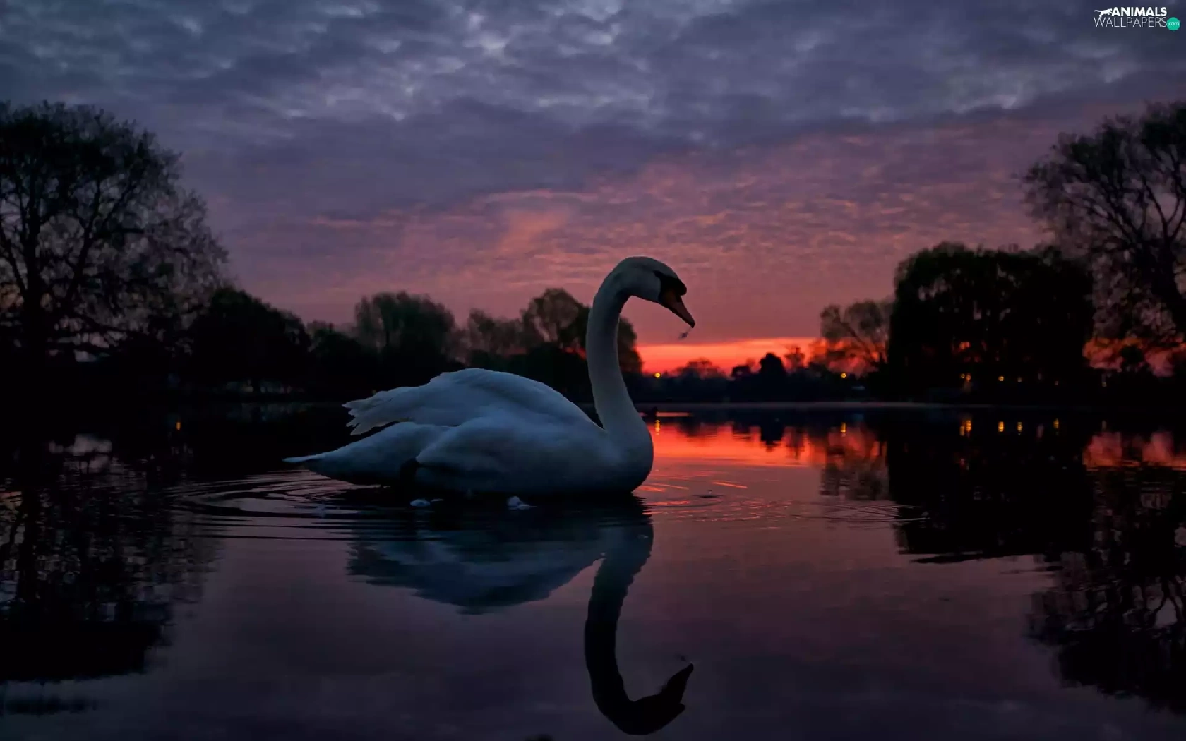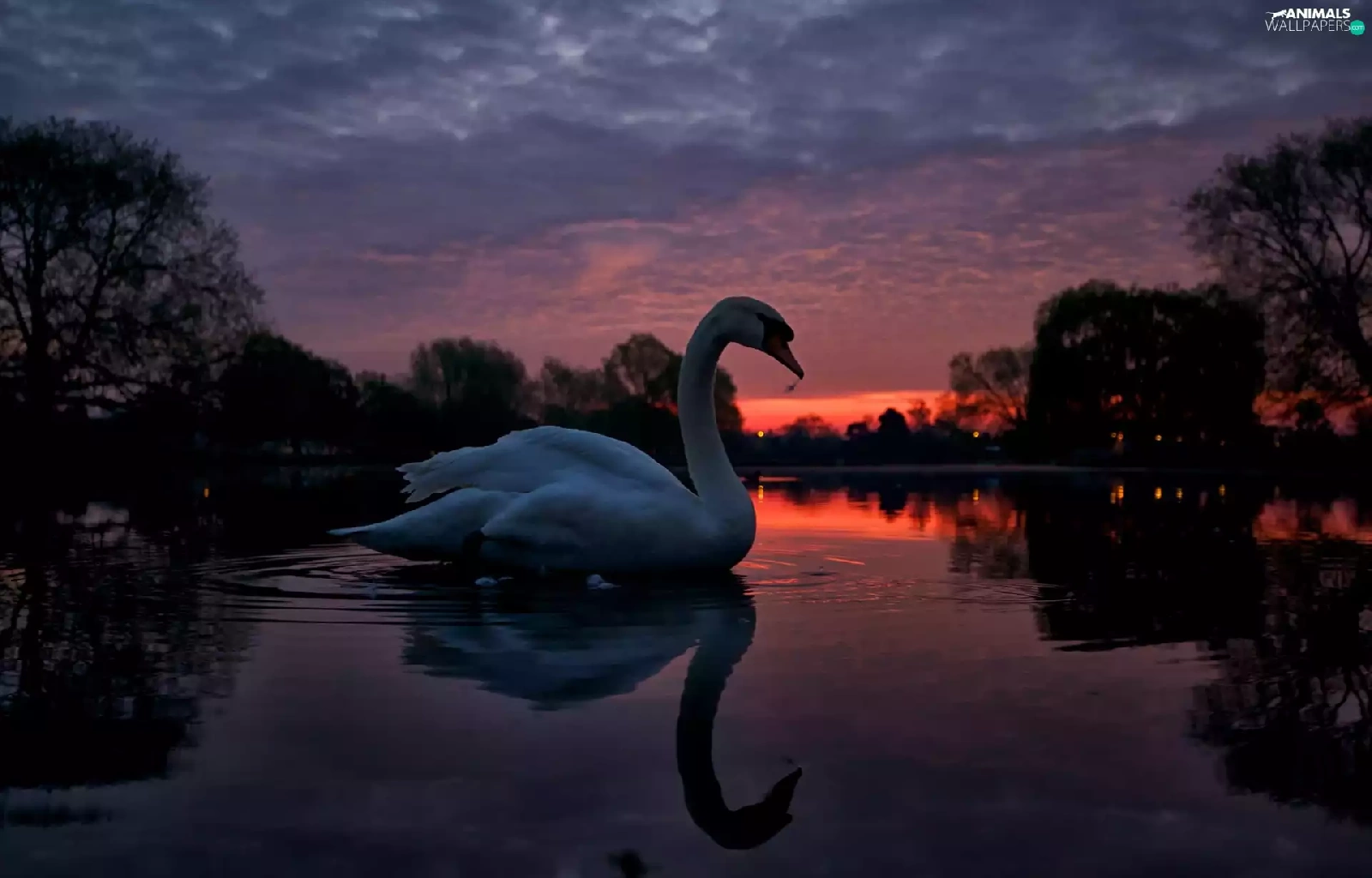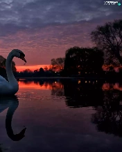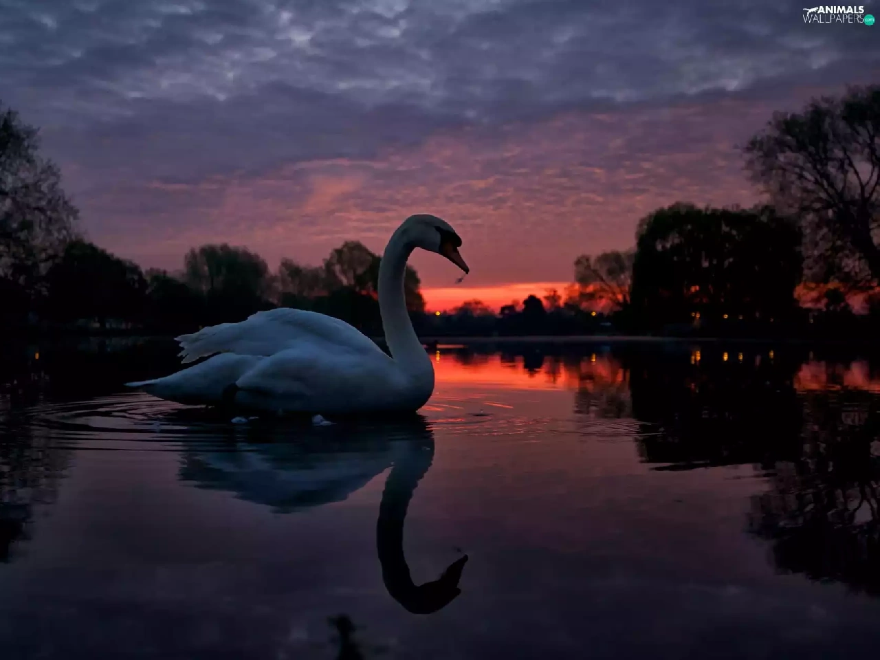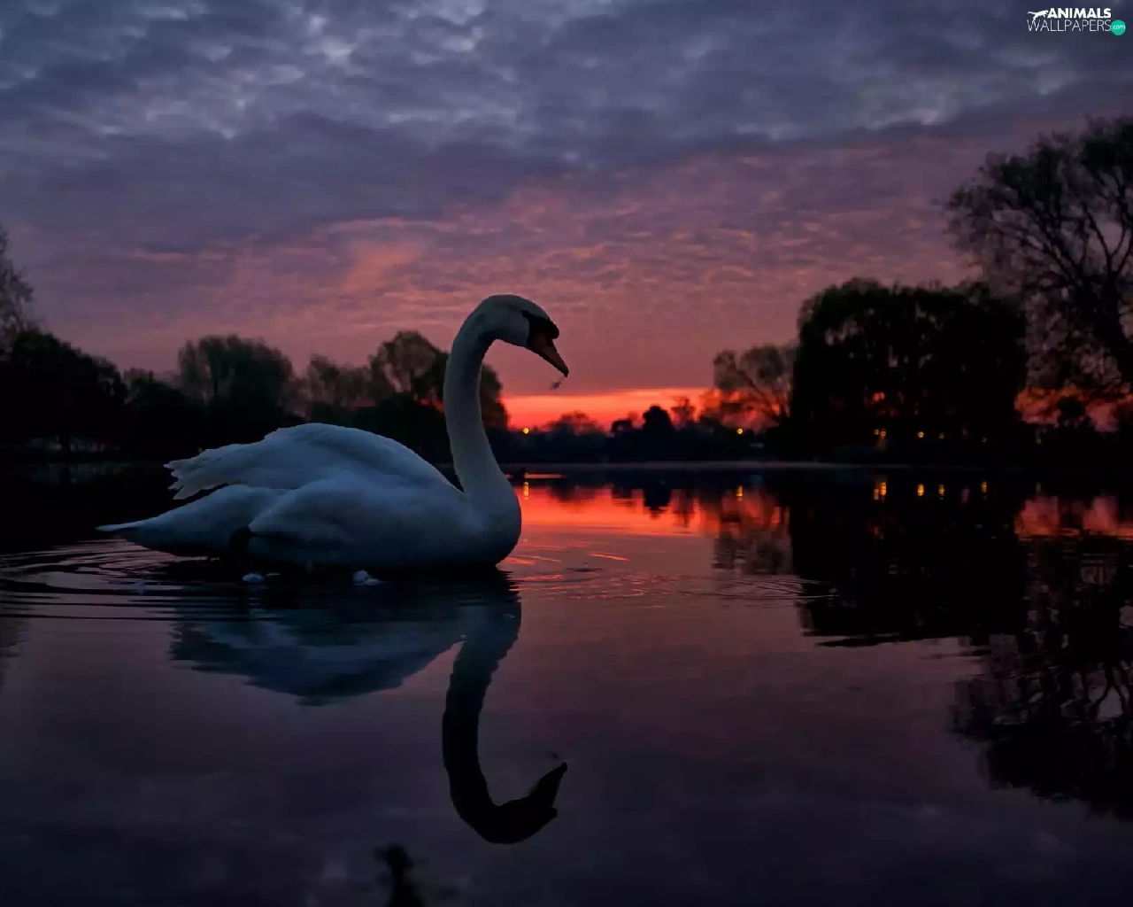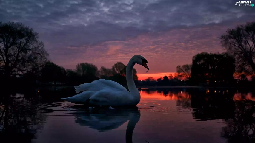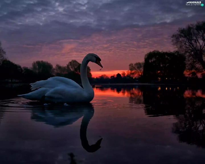 lake, west, trees, viewes, Swans, sun
