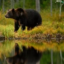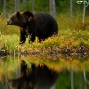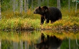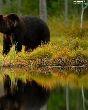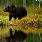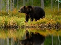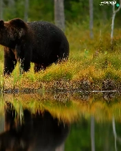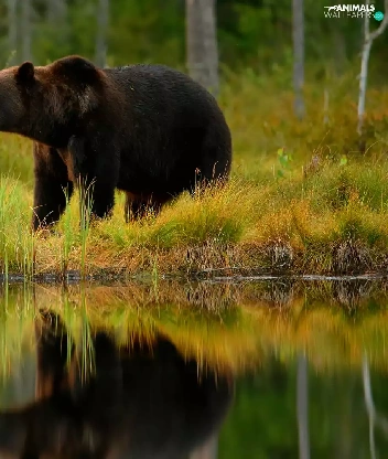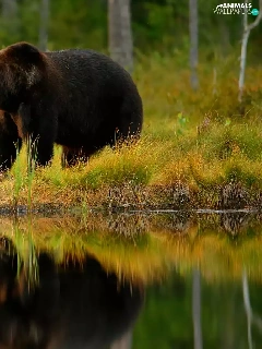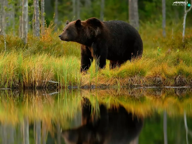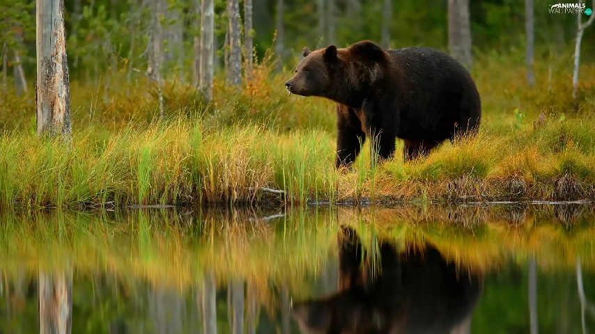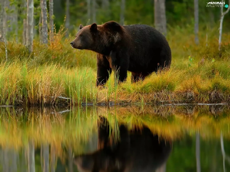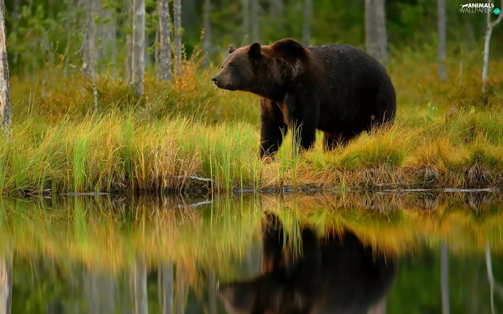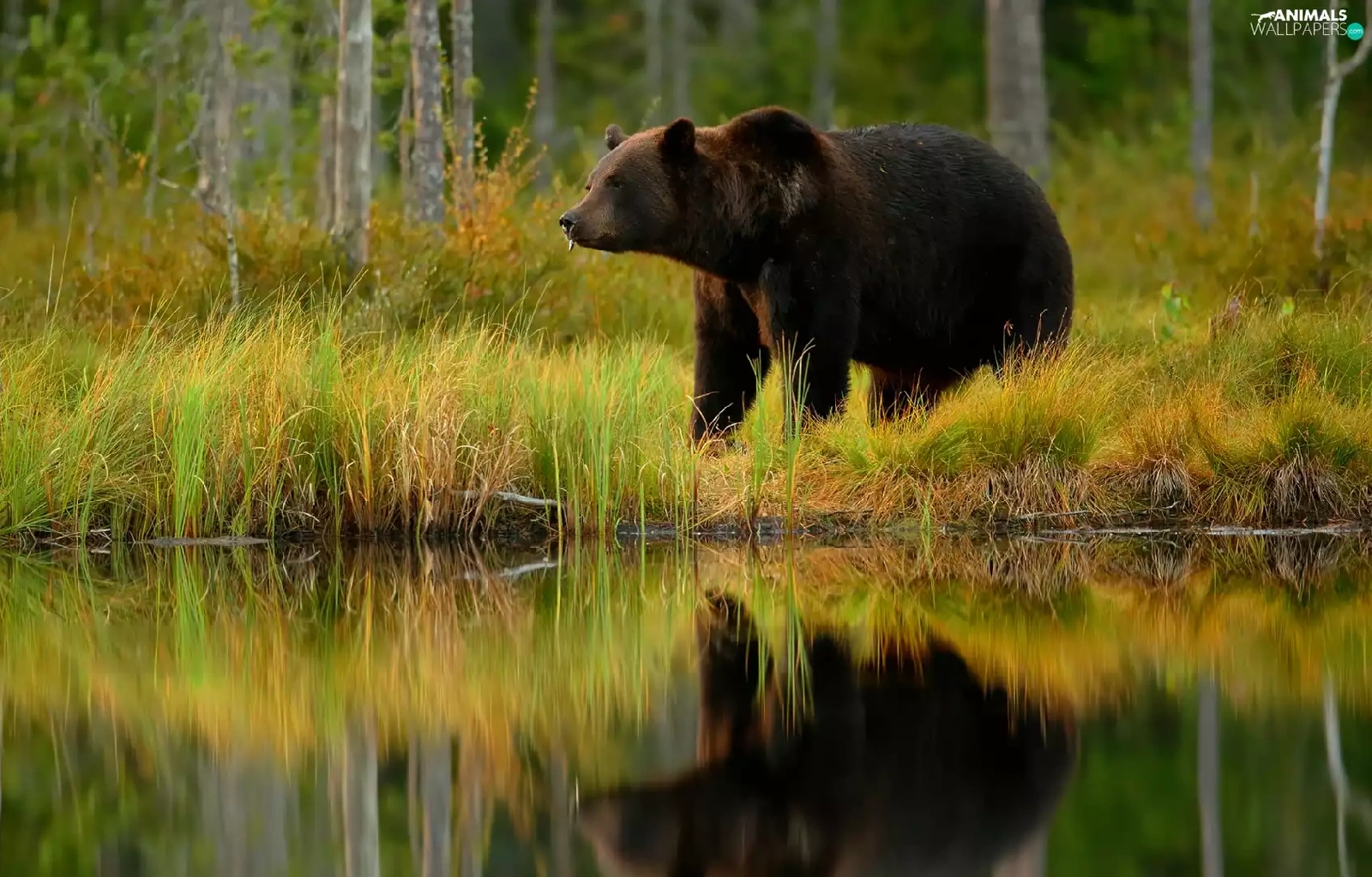 viewes, River, reflection, coast, Brown bear, trees, forest, rushes