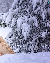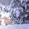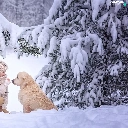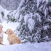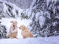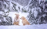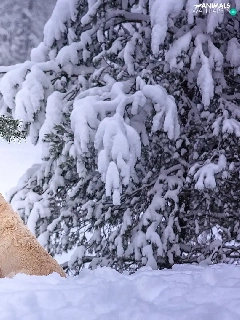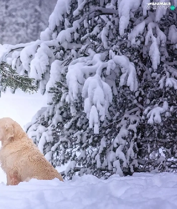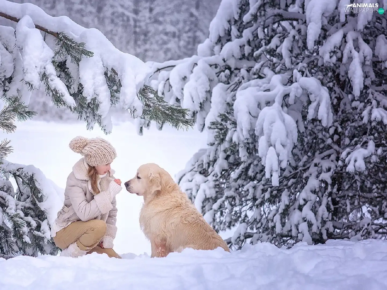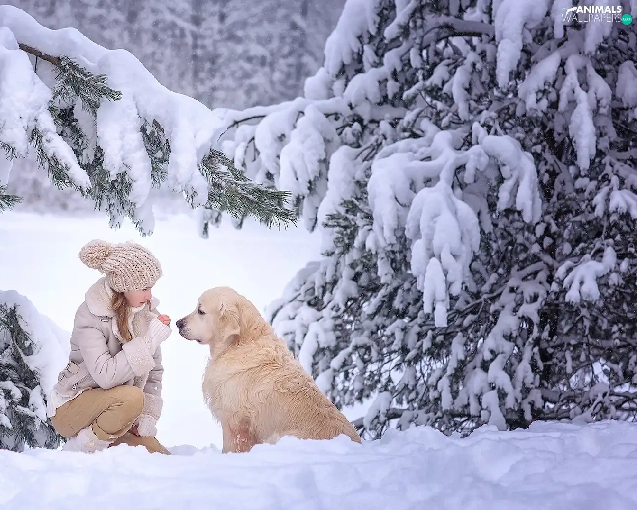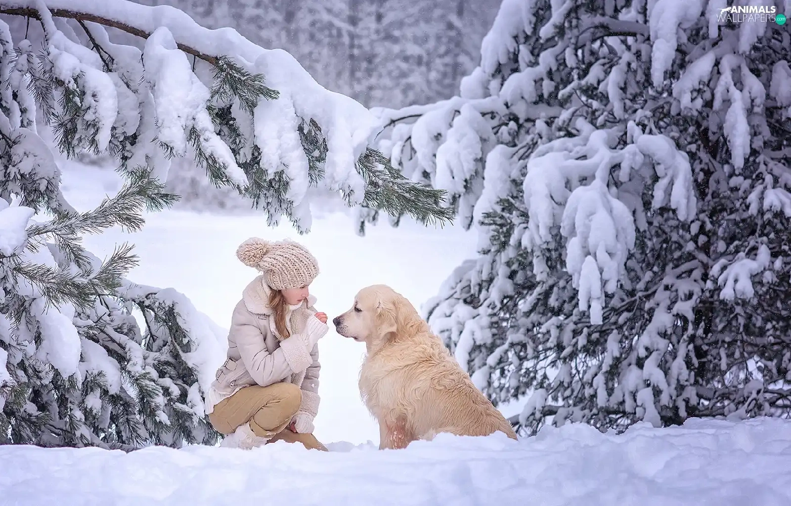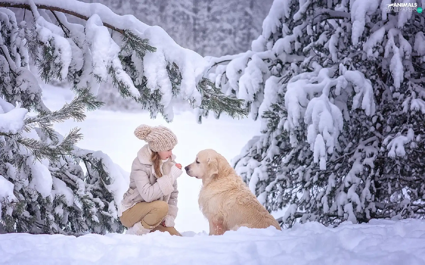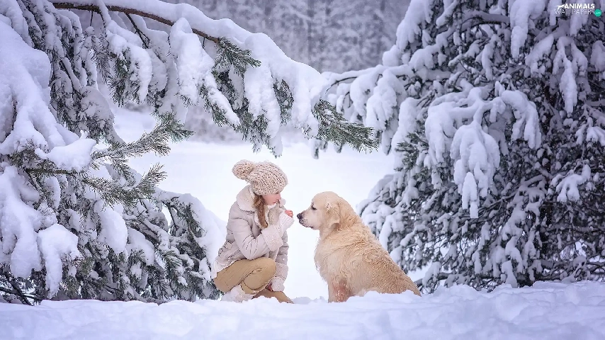 winter, dog, trees, Golden Retriever, girl, Snowy, viewes