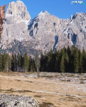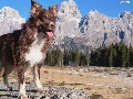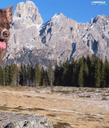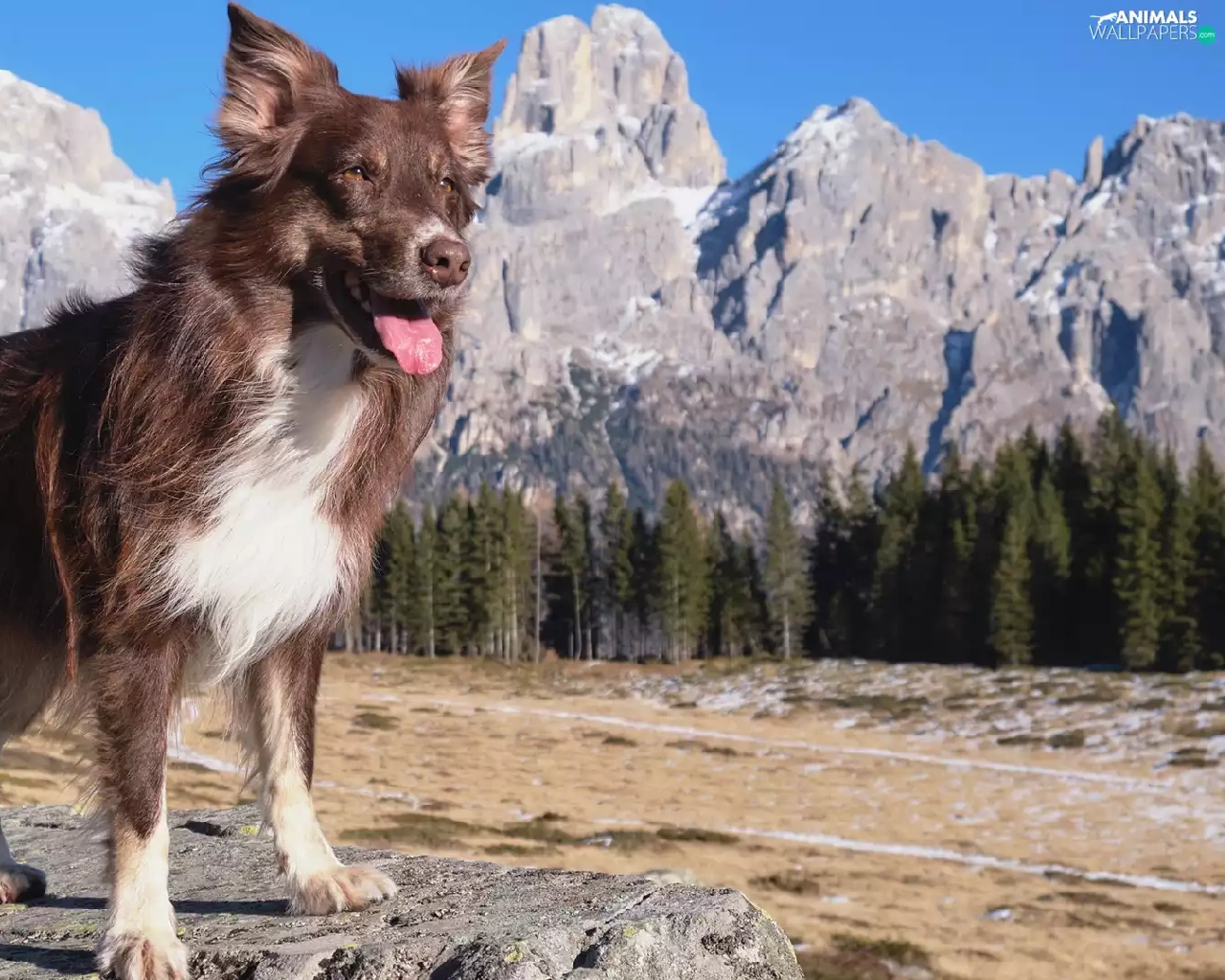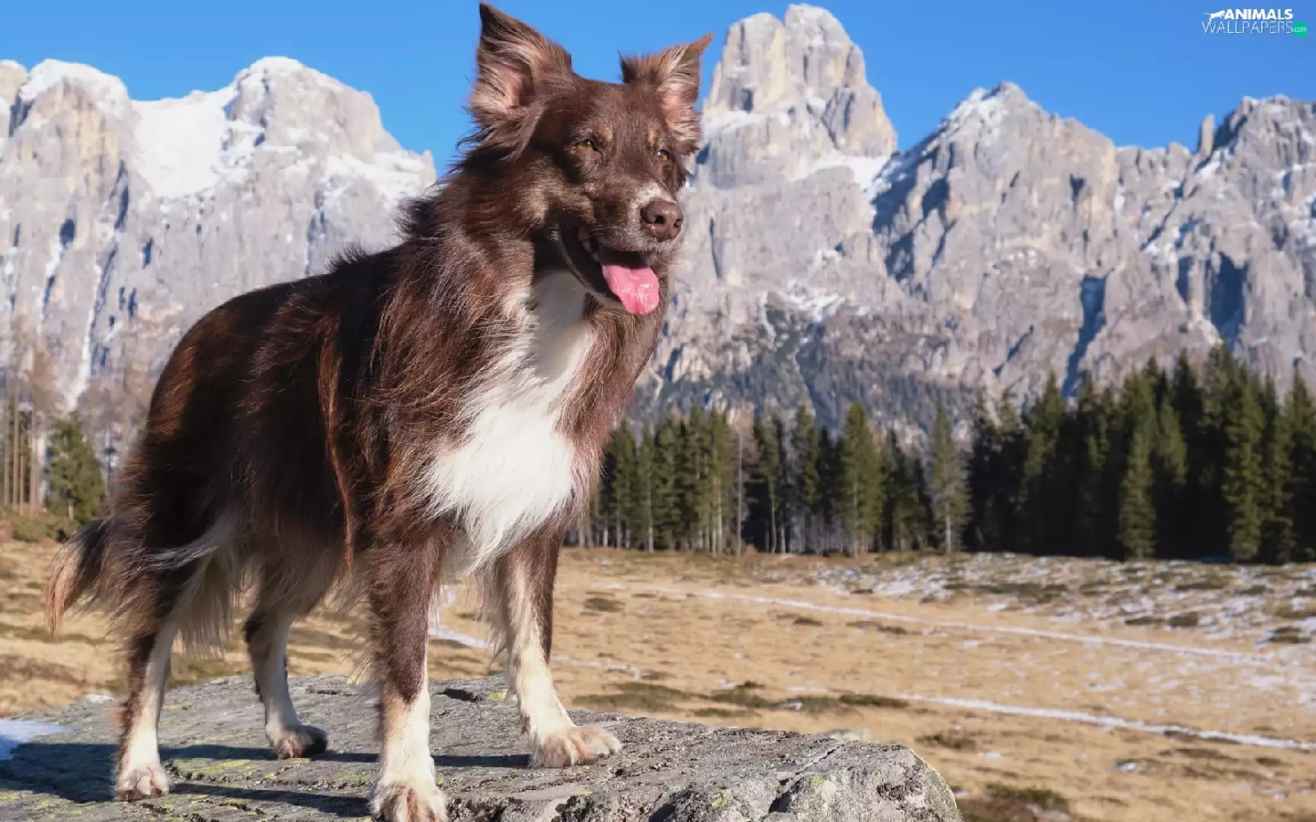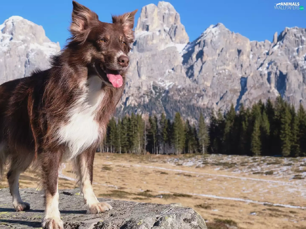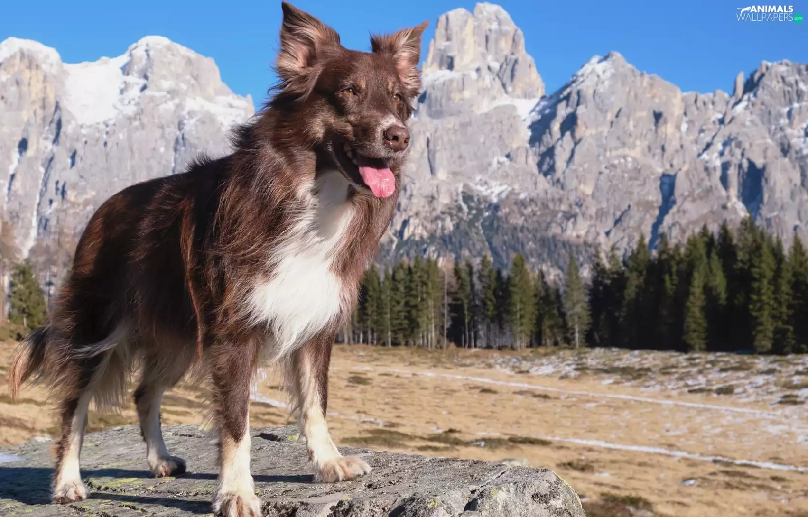Stone, dog, trees, viewes, Mountains, Australian Shepherd