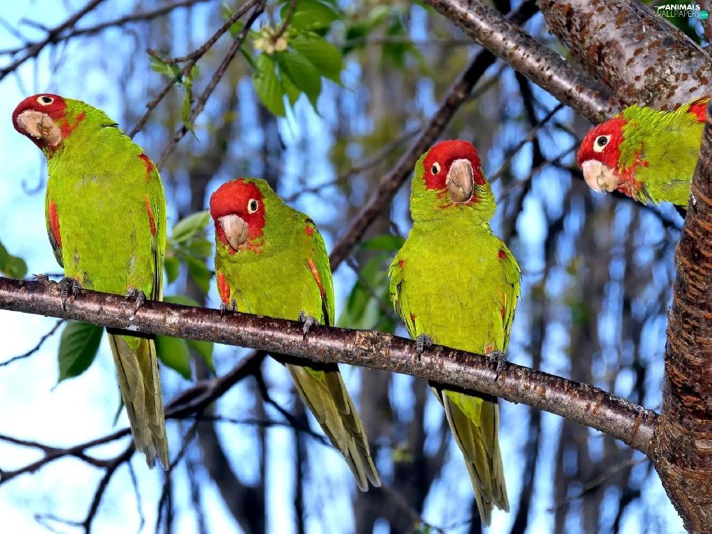 green ones, Parrots, viewes, four, trees