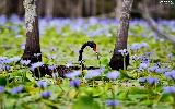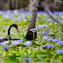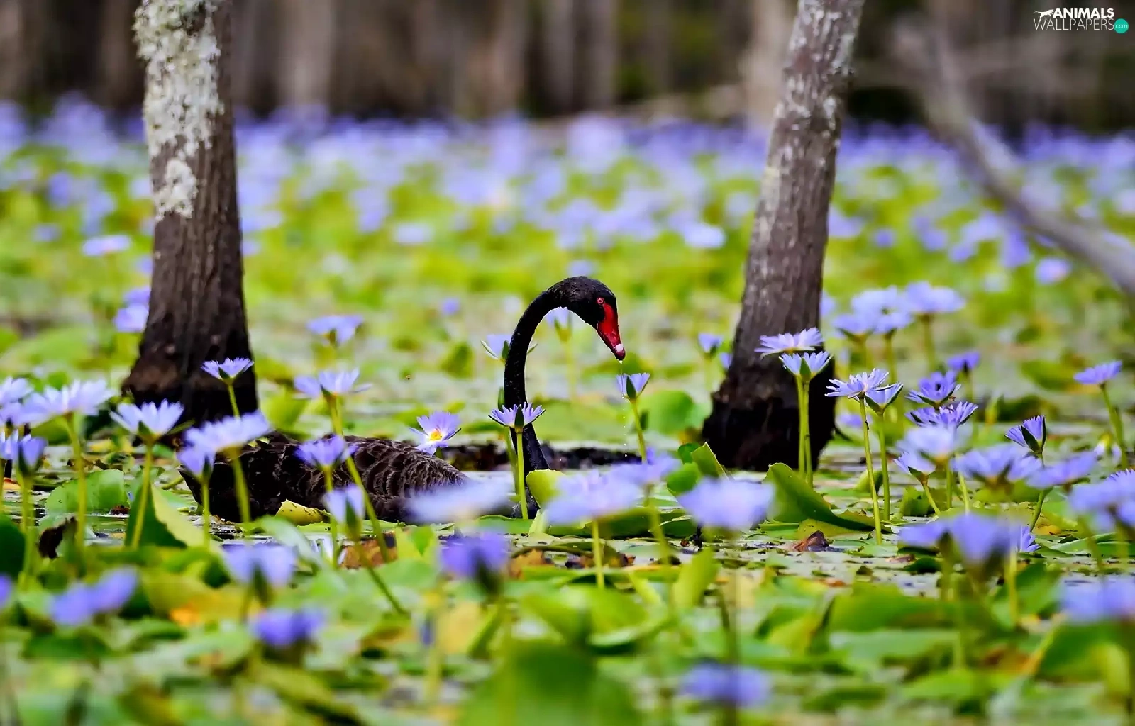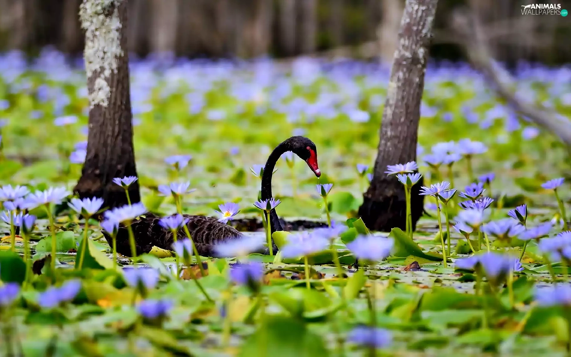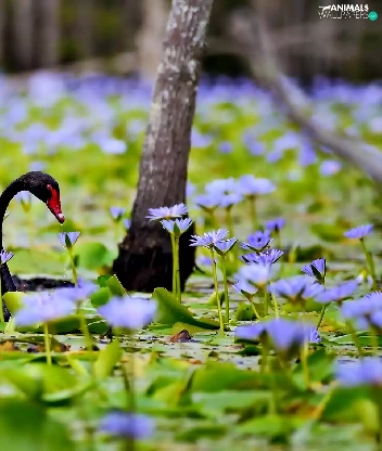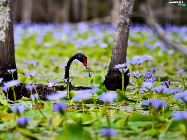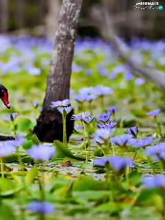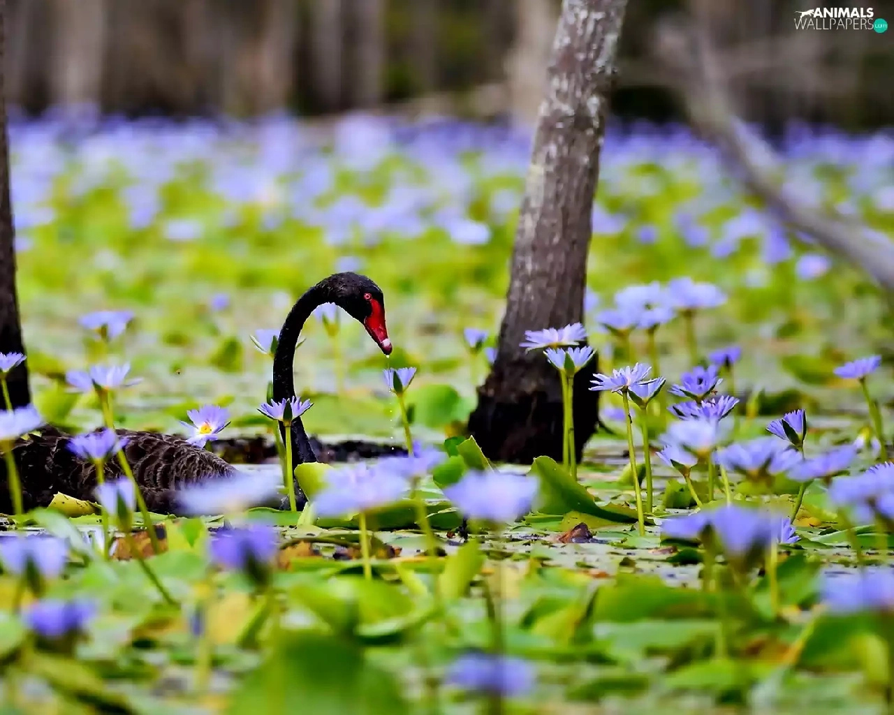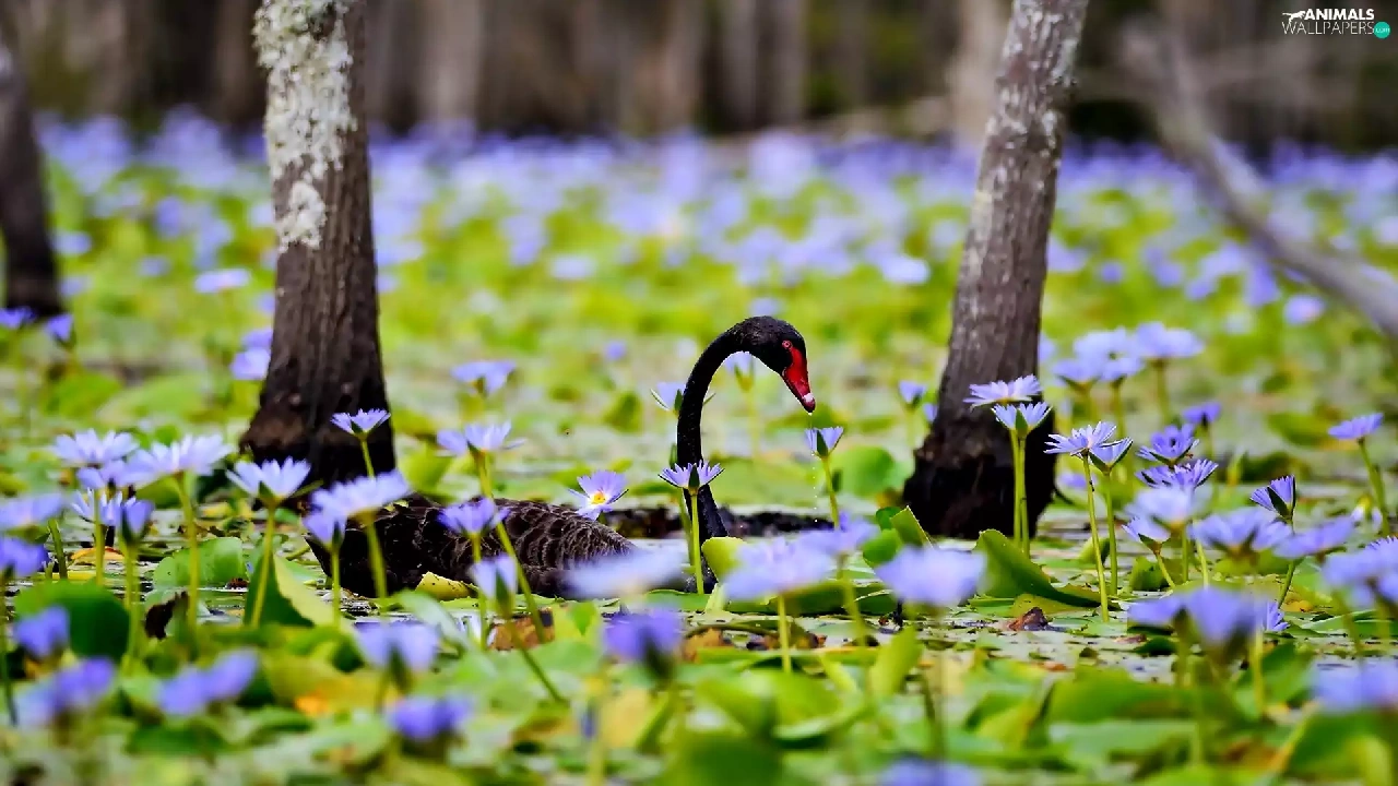 Flowers, Swans, trees, Pond - car, Black, lilies, viewes