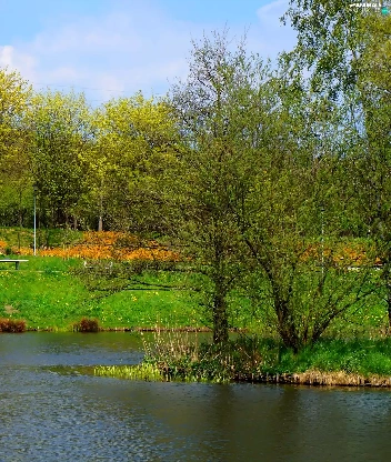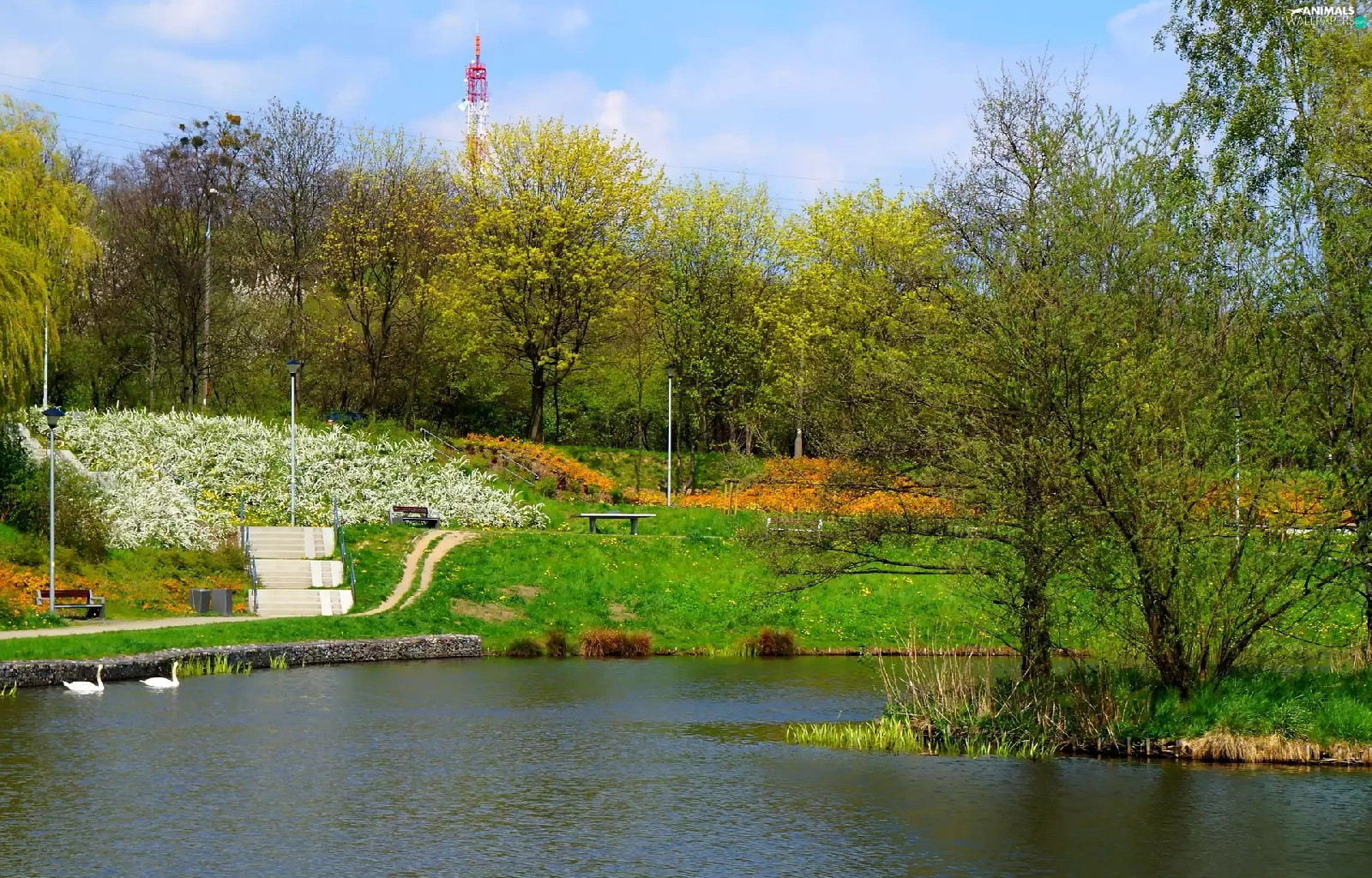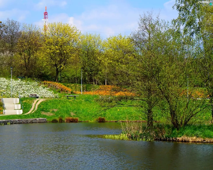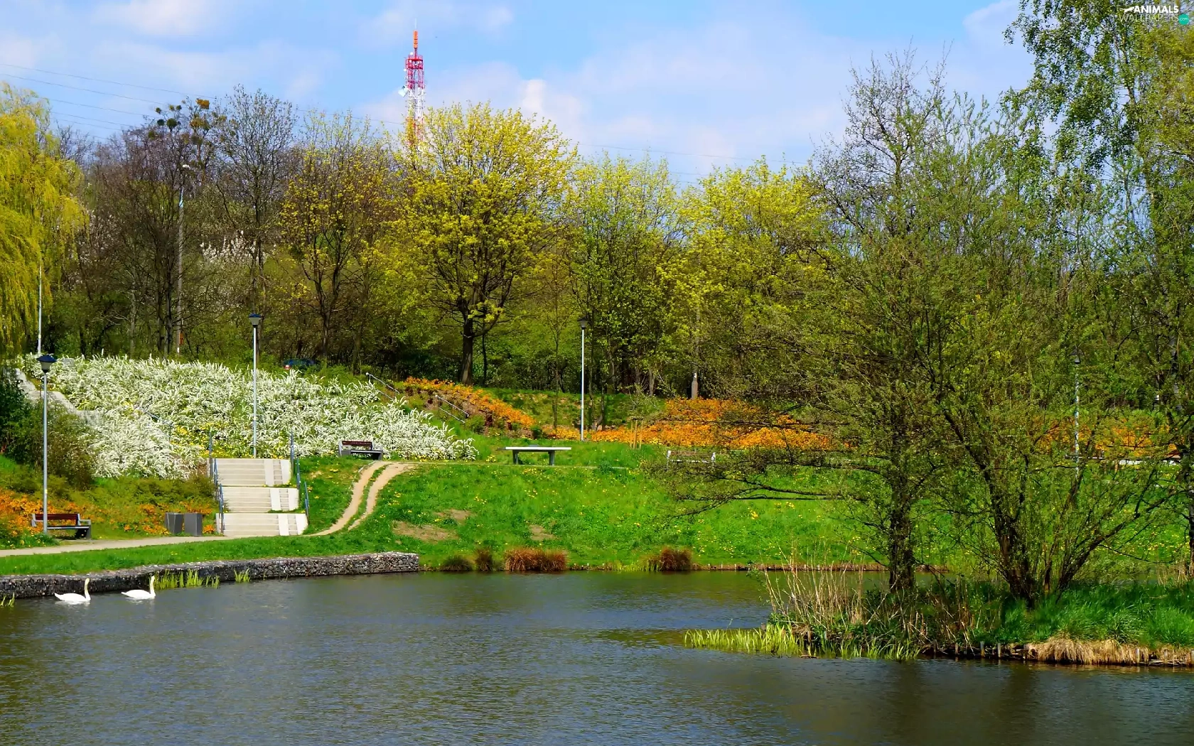 Swan, lake, trees, viewes, green, water