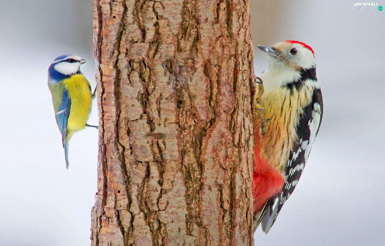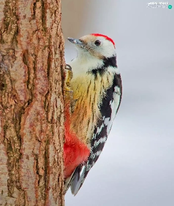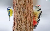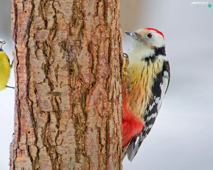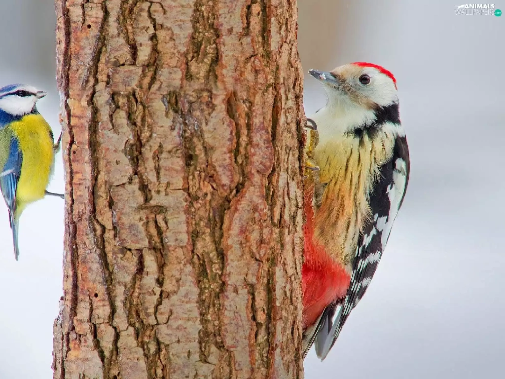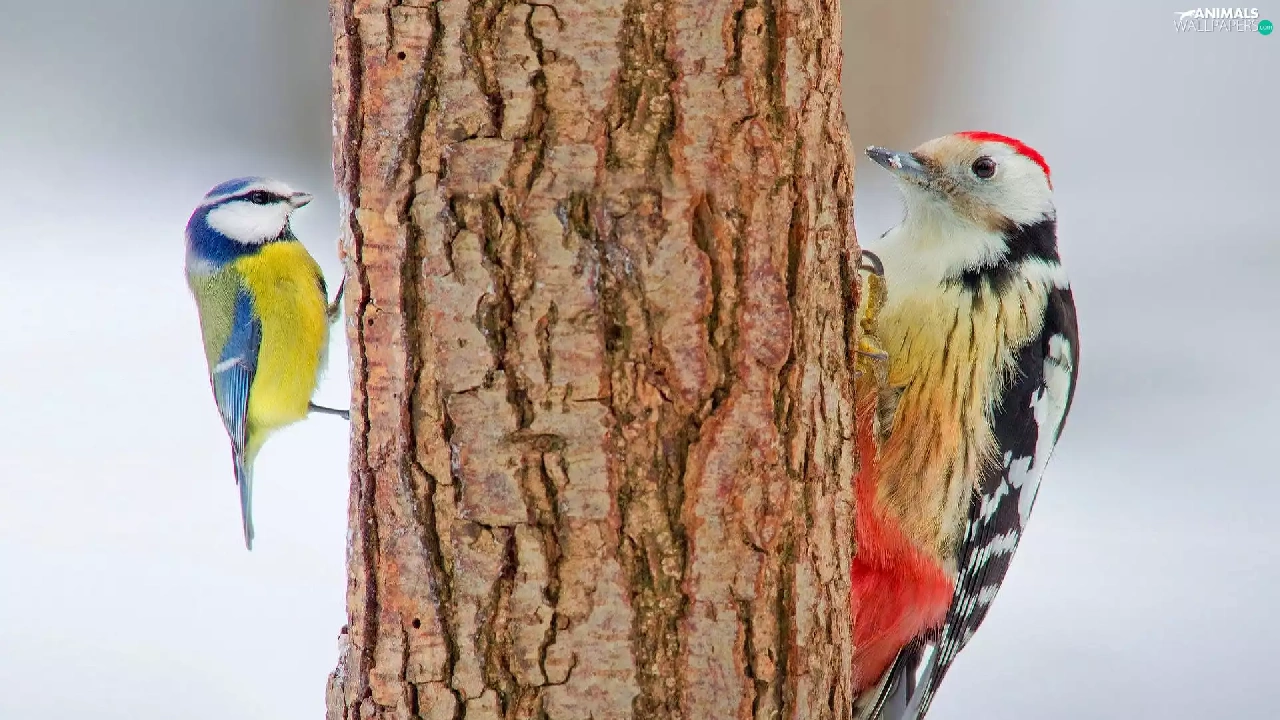 trees, viewes, woodpecker, trunk, tit