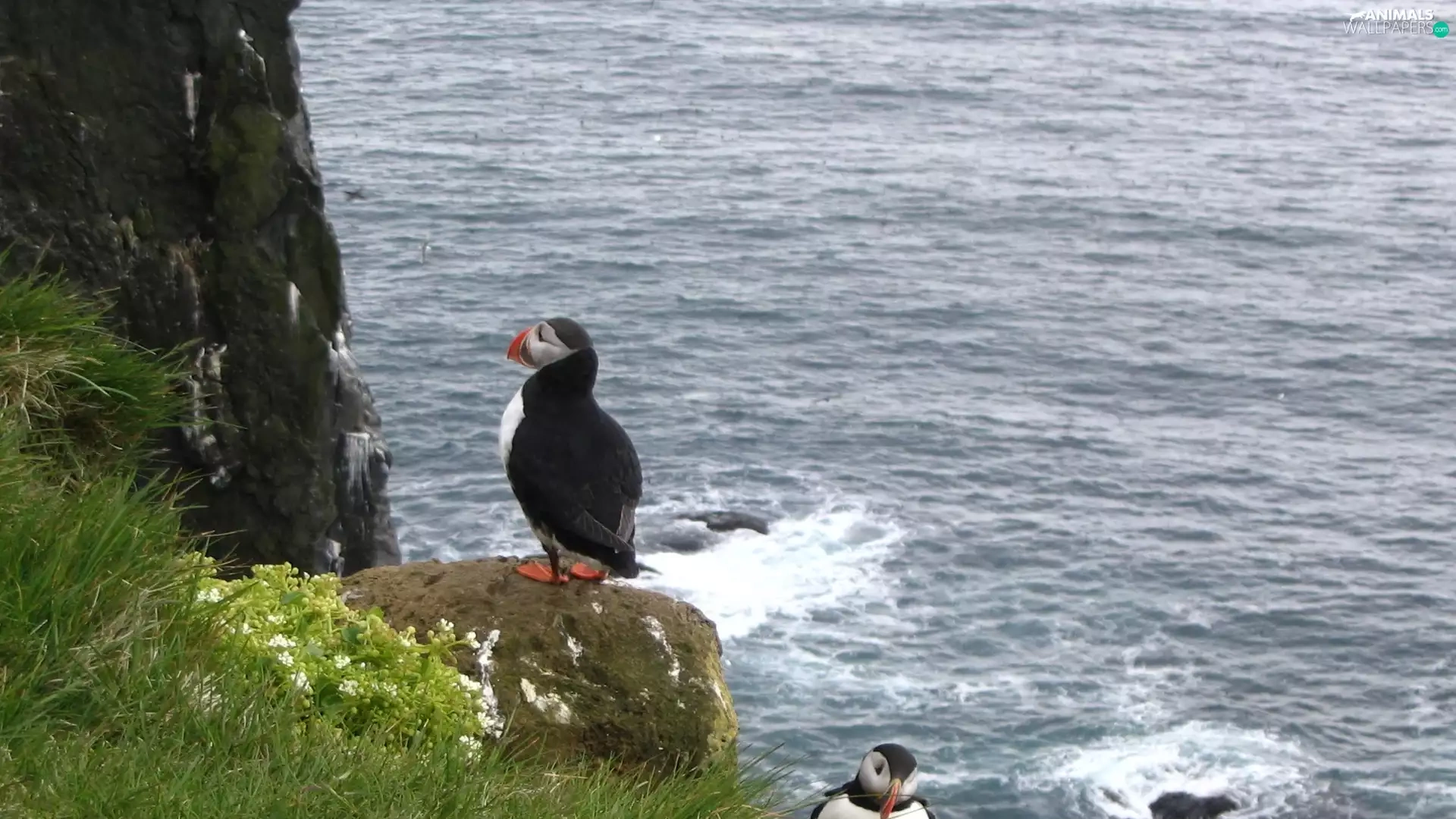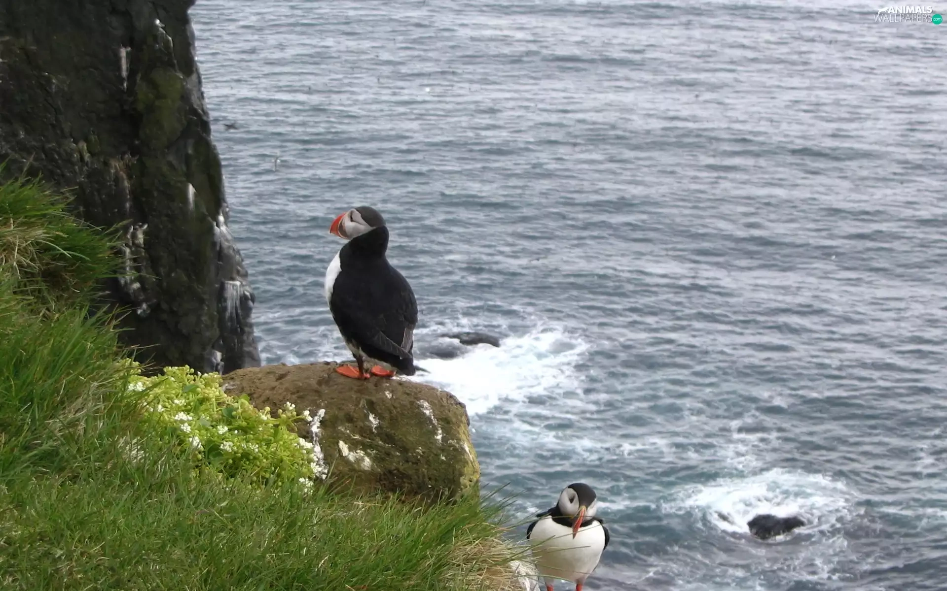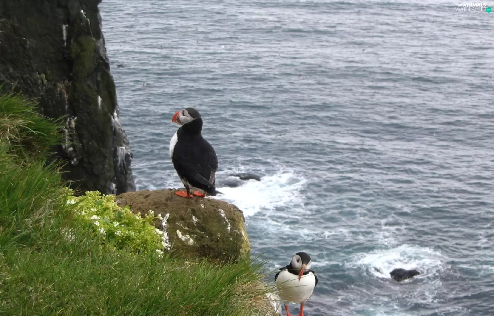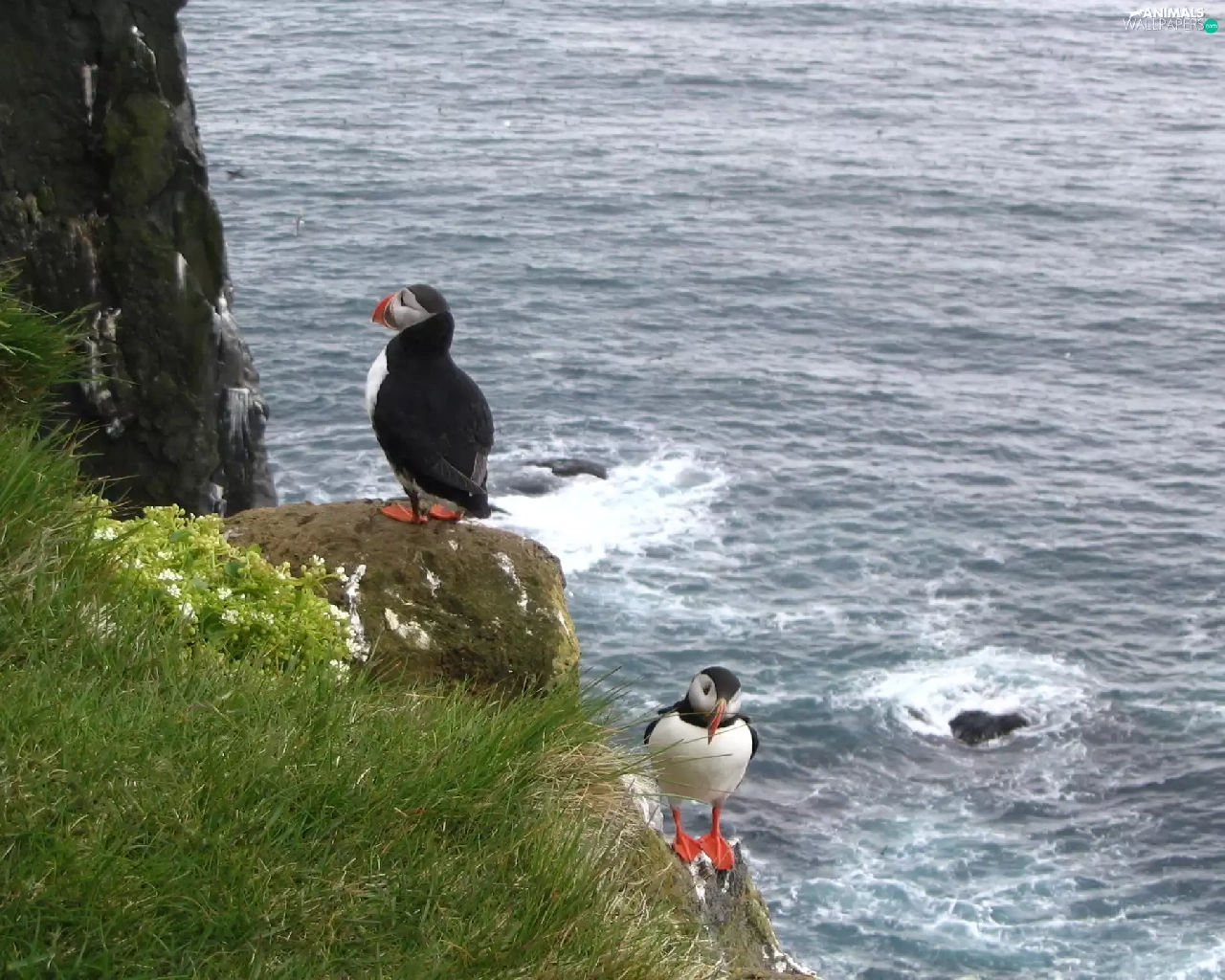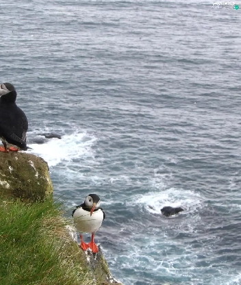 Stone, grass, Puffins, water, Two cars