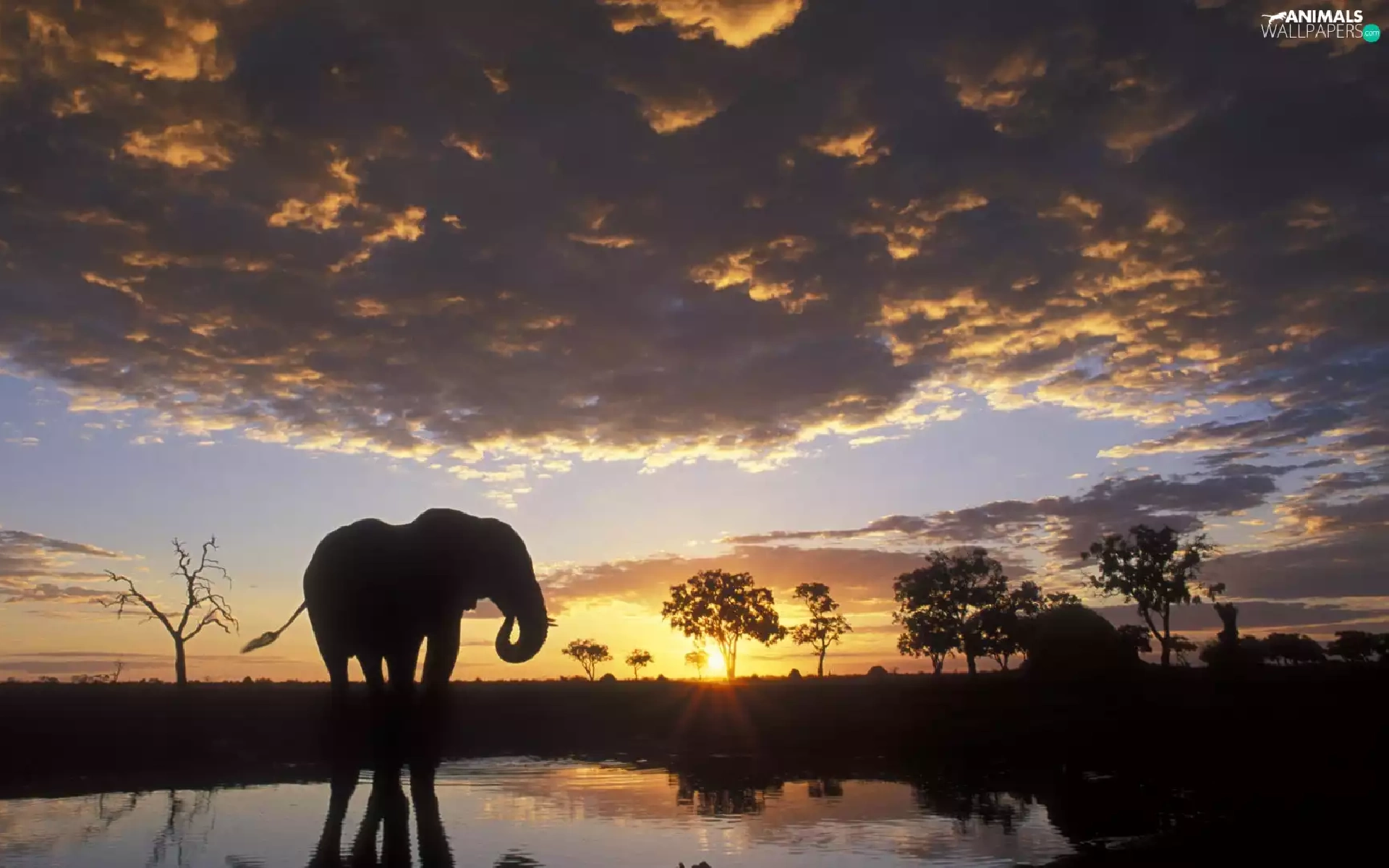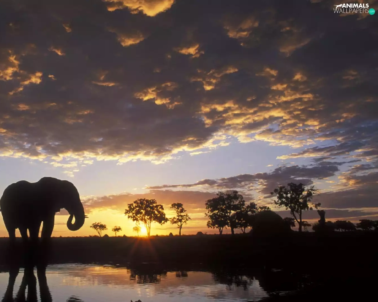 Elephant, clouds, sun, water