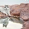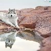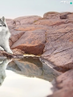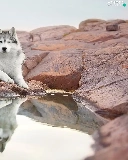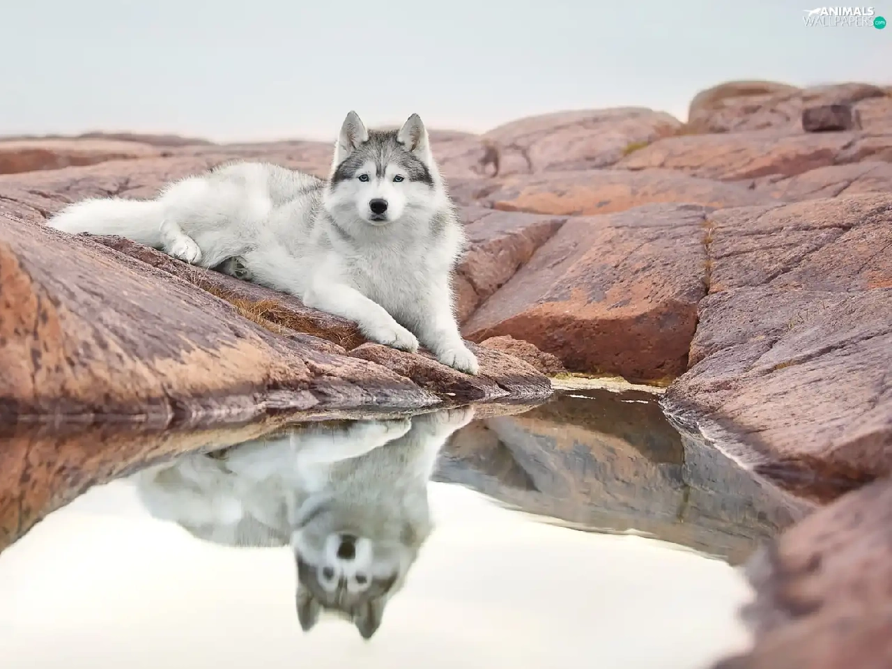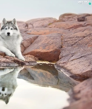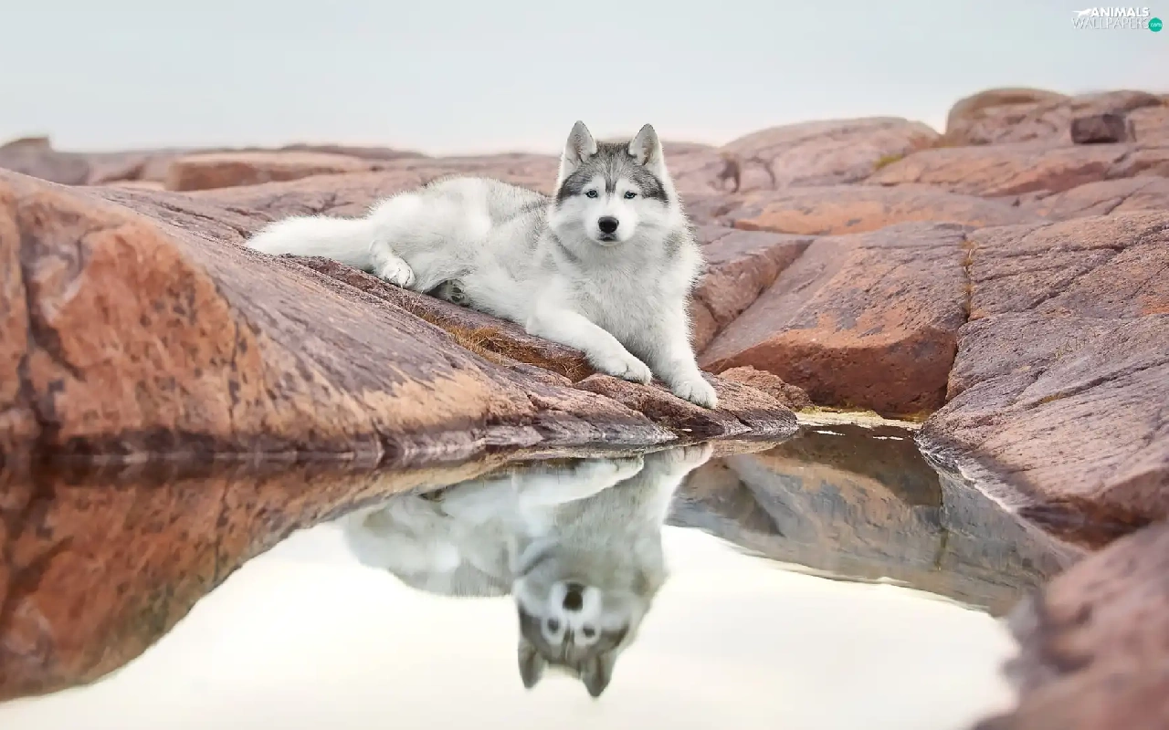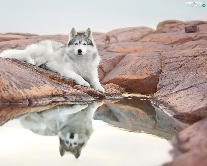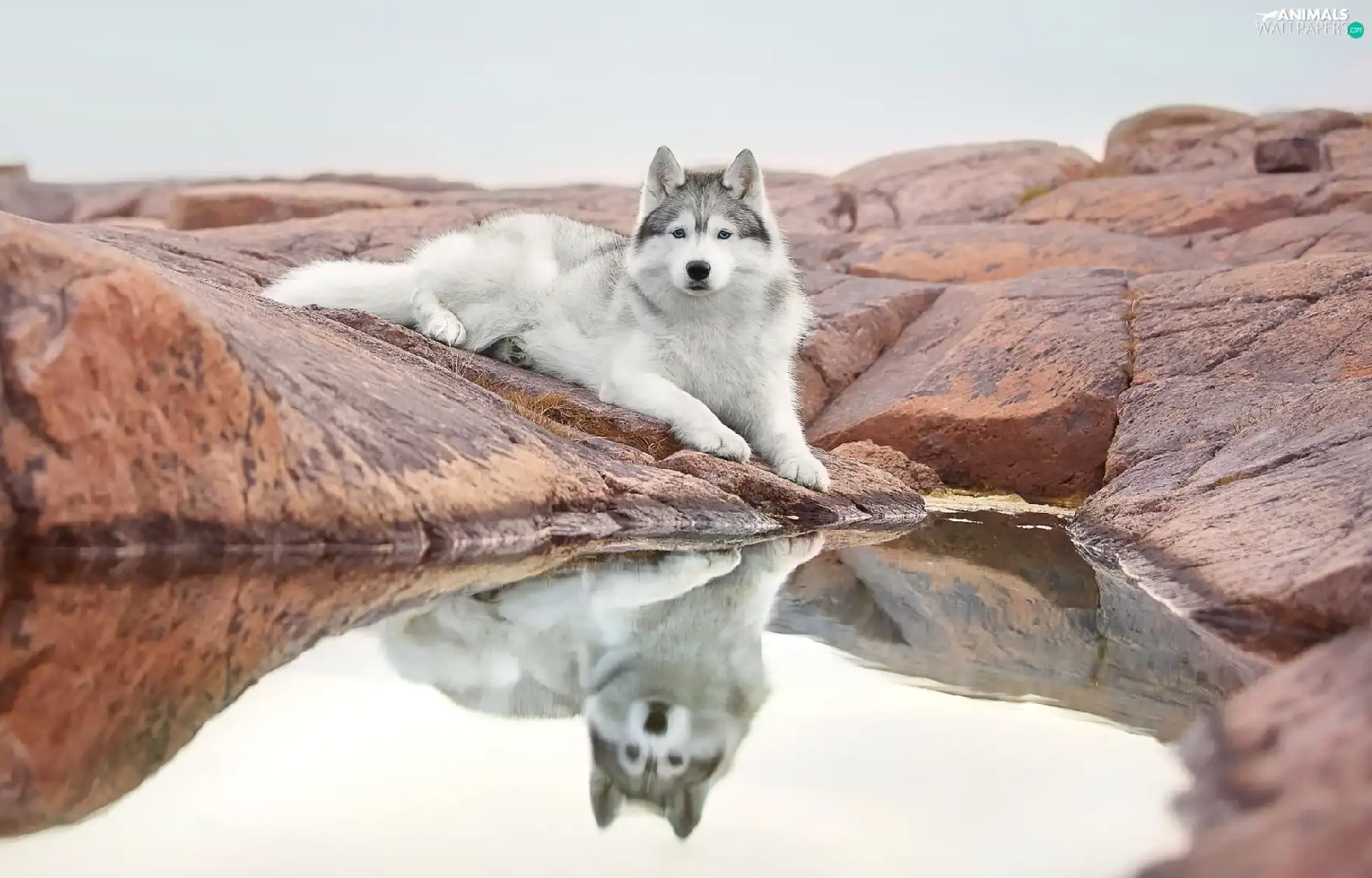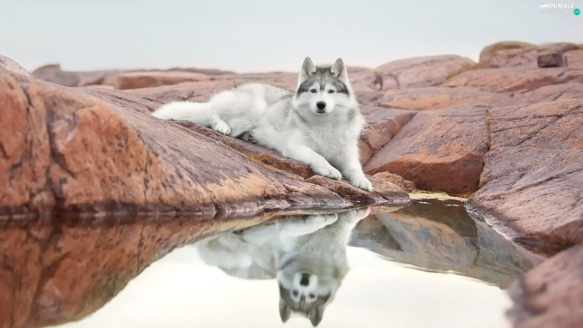 Siberian Husky, lying, water, reflection, Rocks, dog