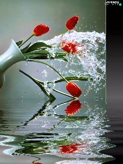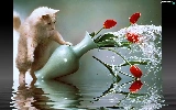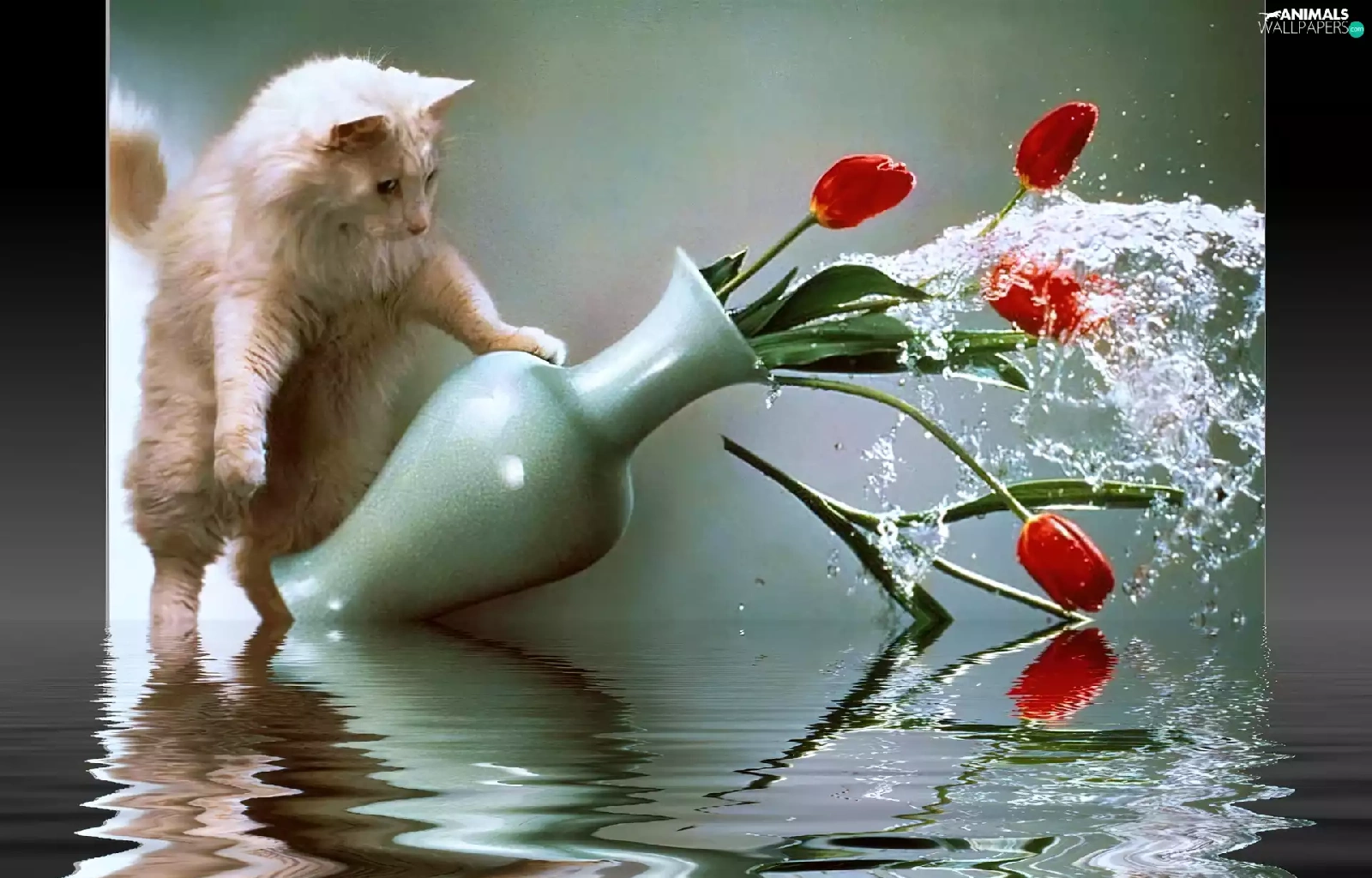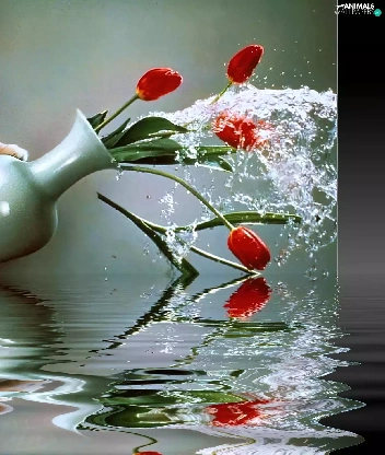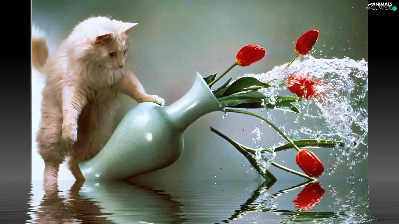 Tulips, water, Menace, Vase, cat