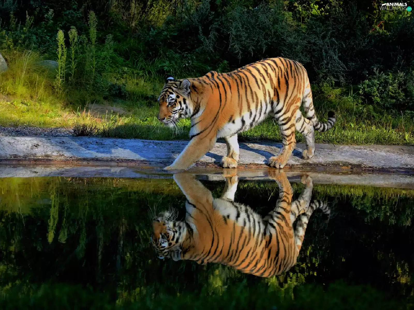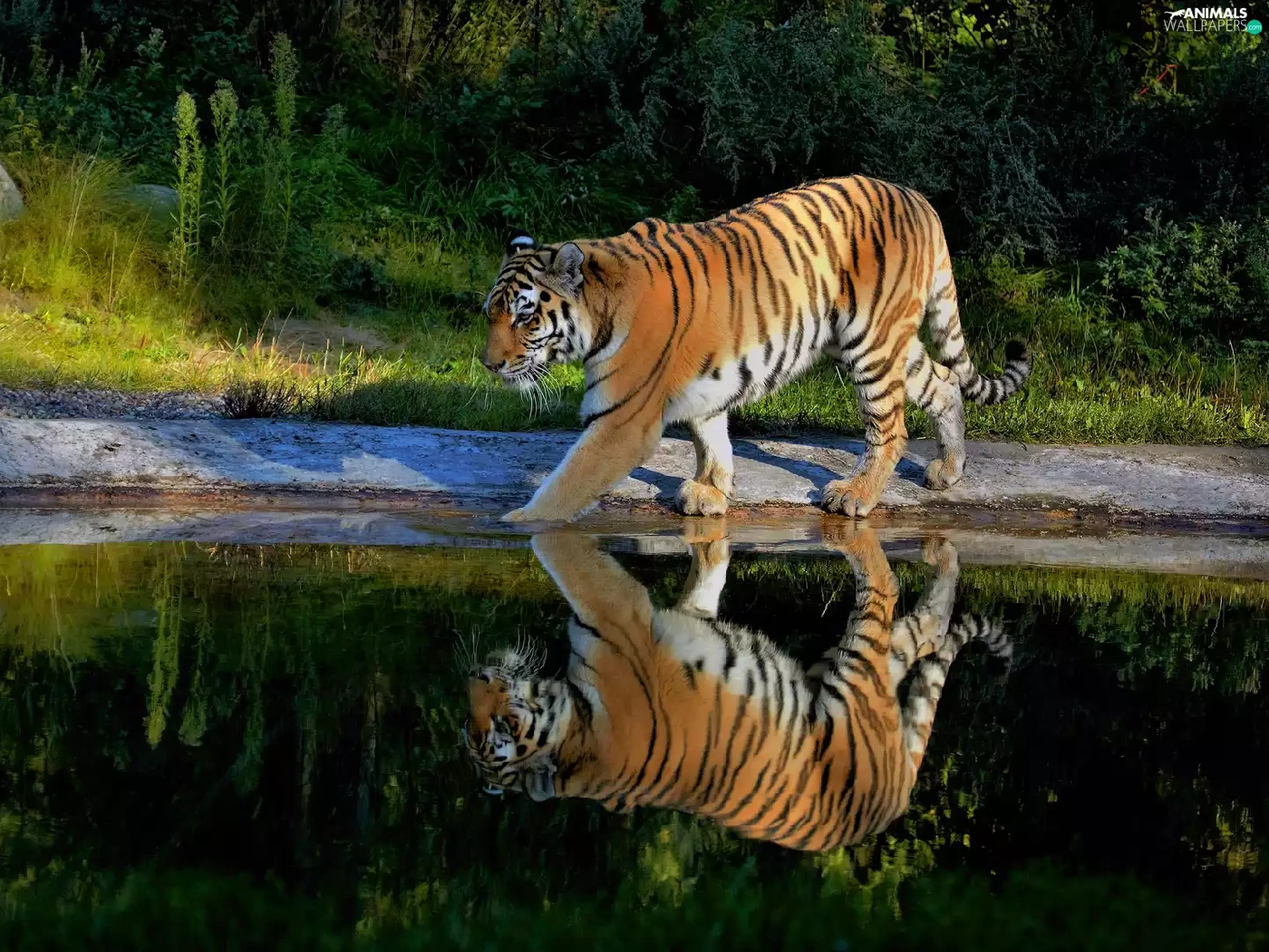tiger, reflection, Plants, water